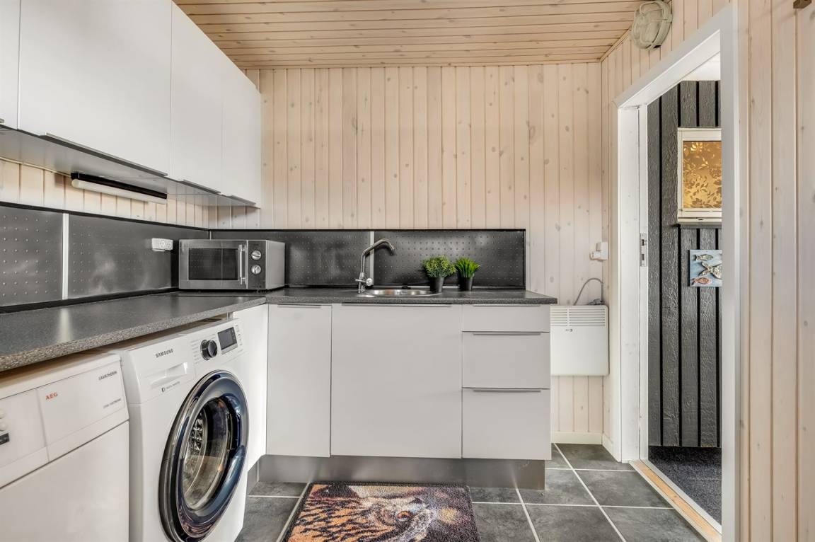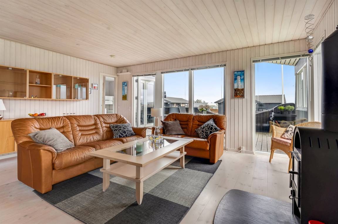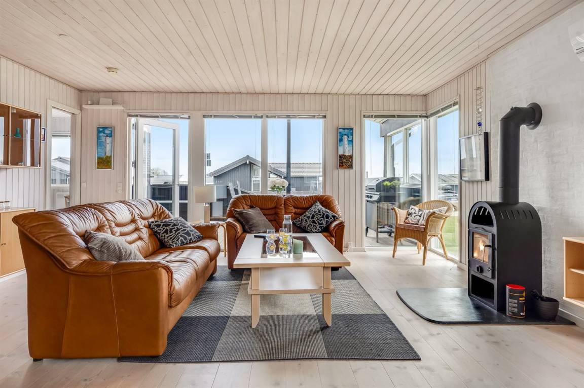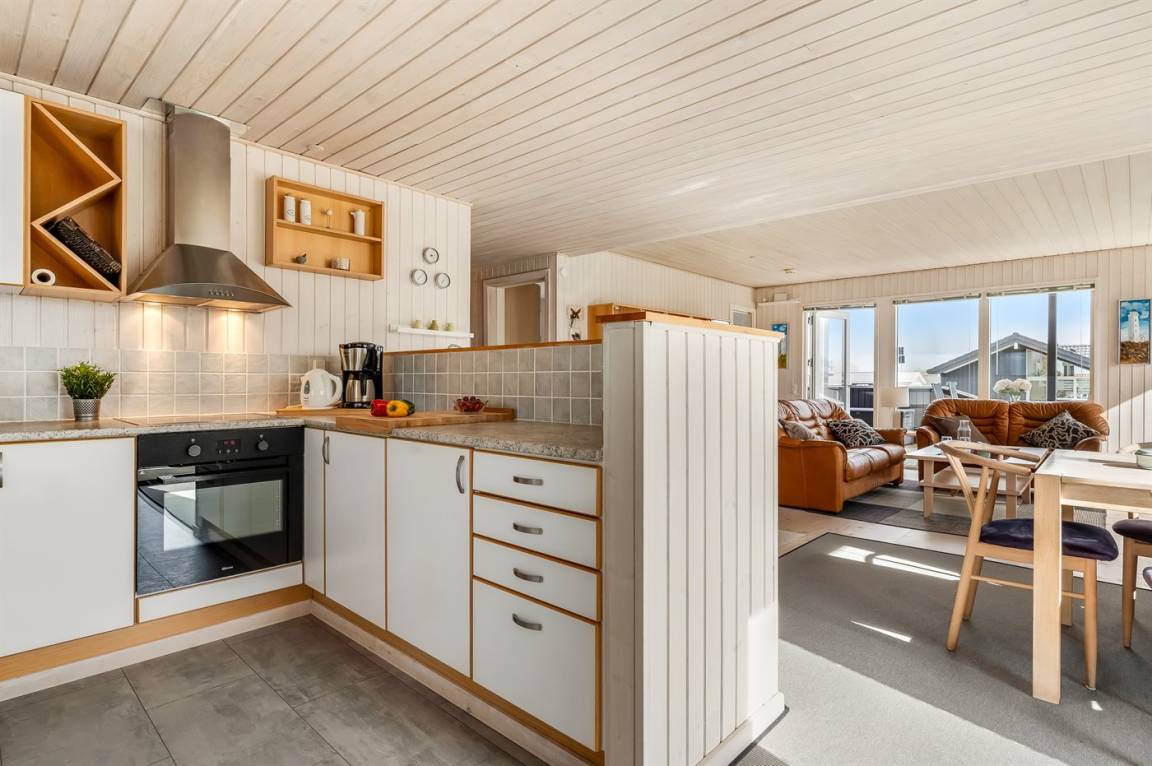 Das Haus verfügt über einen großen, offenen Küchen- und Essbereich in Verbindung mit dem Wohnzimmer, von dem aus du ebenfalls die Aussicht genießen kannst. Diese lässt sich auch von den schönen Terrassenbereichen erleben, die teilweise überdacht sind. Hier hast du gute Möglichkeiten, ein windgeschütztes Plätzchen zu finden und die Ruhe zu genießen.