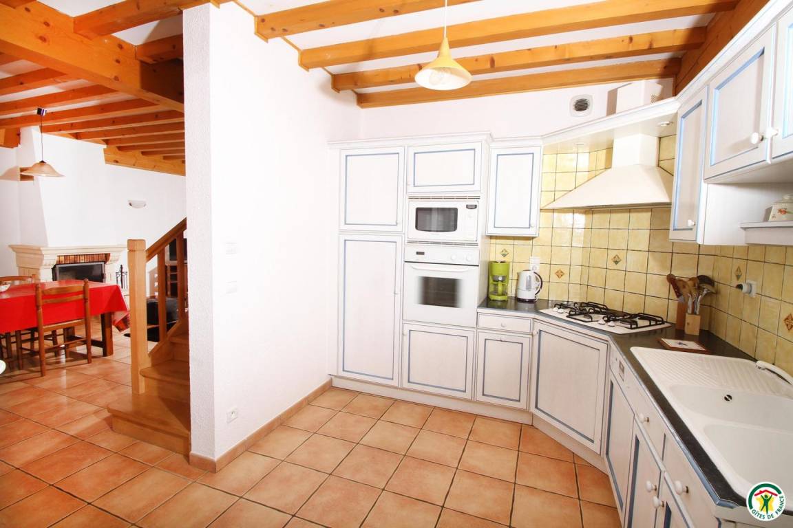 Erdgeschoss: großes Wohnzimmer, Esszimmer mit Küche, Waschküche, WC. Obergeschoss: 3 Schlafzimmer (1 Bett 160 cm) (1 Bett 160 cm oder 2 Betten 80 cm) (2 Betten 90 cm), Badezimmer mit WC. Holz inklusive.