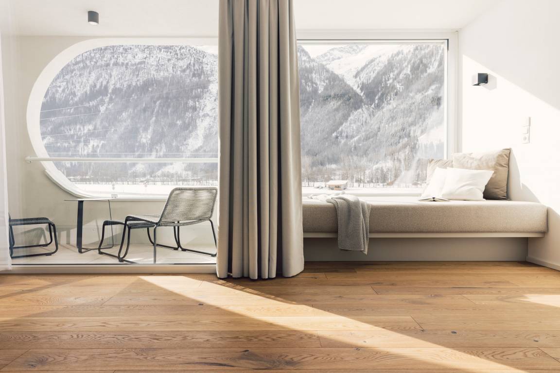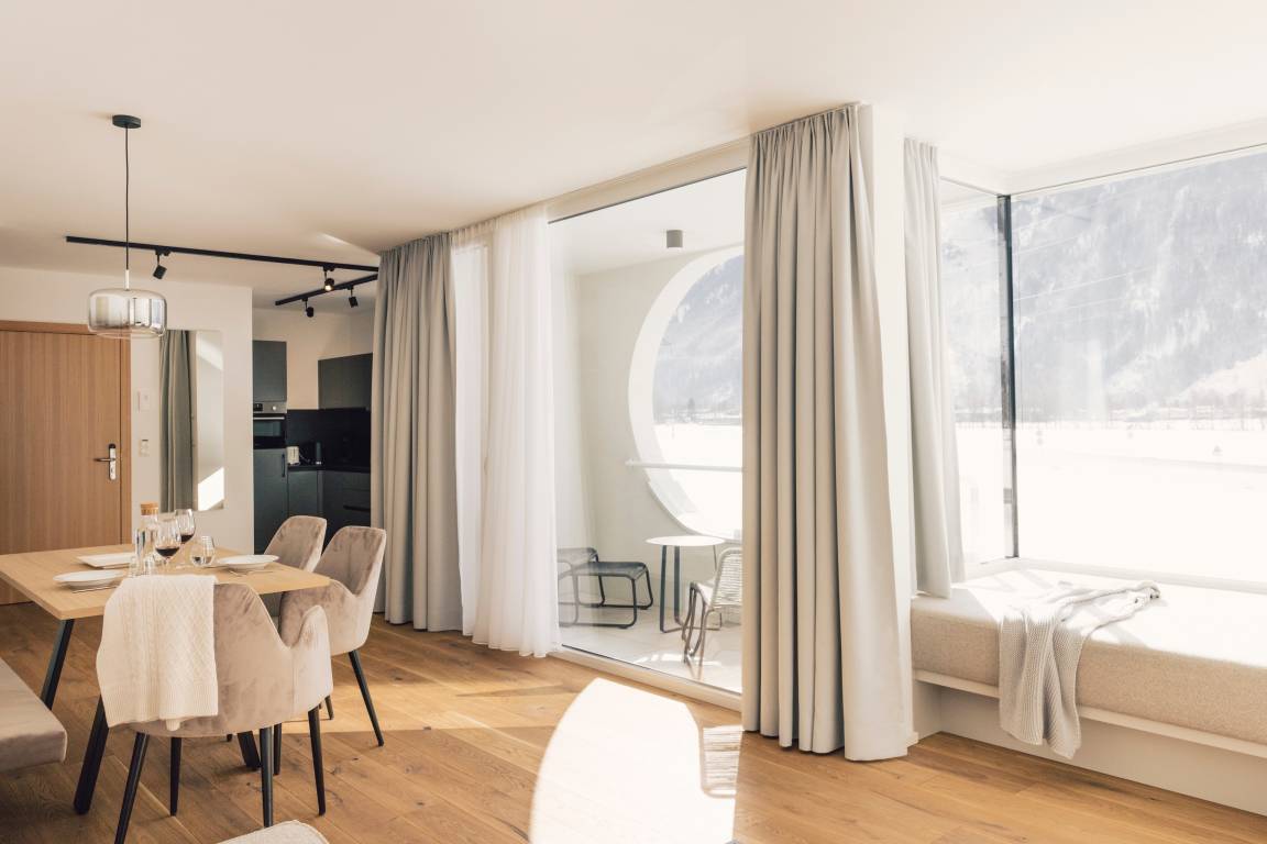 Panoramagenuss zu jeder Jahreszeit. Auf dem Balkon, von dem Sie Berge bestaunen. Im großzügigen Wohnraum mit Panoramafenster & Sit-Window, von dem Sie mit Ihren Gedanken bis zu den Gipfeln reisen. Und darüber hinaus.