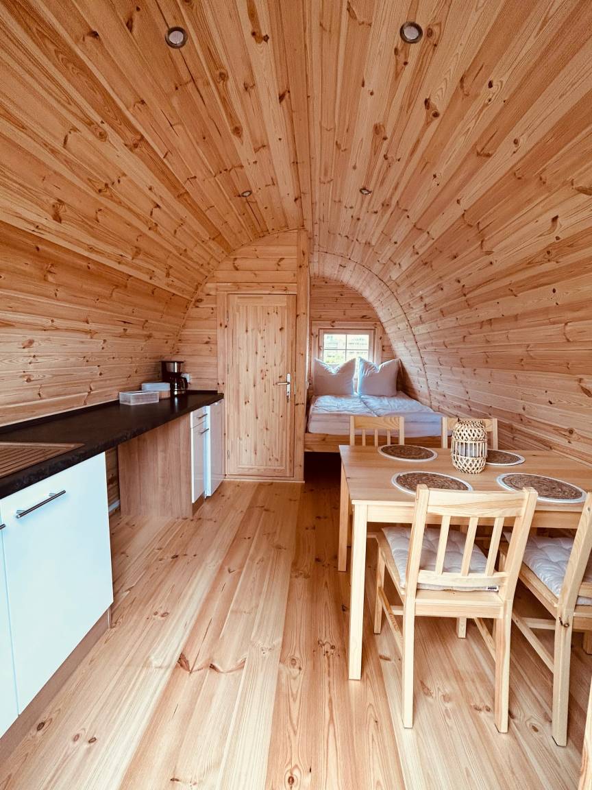 Im POD finden bis zu vier Personen einen Schlafplatz. Bitte beachten Sie, dass das obere Bett im Etagenbett sehr klein und schmal ist. Dieses Bett ist eher nur für Kleinkinder nutzbar.