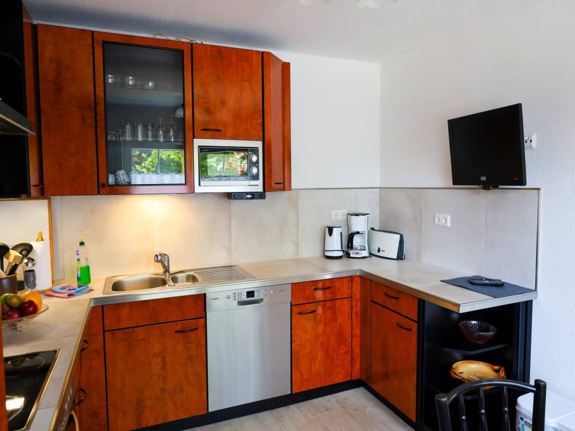 Layout : Parterre: Eingang, Küche mit TV(Flatscreen, Satellit), Esstisch, Wasserkocher, Toaster, Kochherd(4 Kochplatten, Ceranfeld), Dunstabzugshaube, Kaffeemaschine(Filter), Backofen, Mikrowelle, Geschirrspüler, Kühl-/Gefrierkombination , Wohn/Esszimmer mit TV(Flatscreen, Satellit), Esstisch, Kamin, Sitzecke , Badezimmer mit Waschbecken, Dusche, Infrarotsauna, Toilette , Flur mit Ofen(Holz)