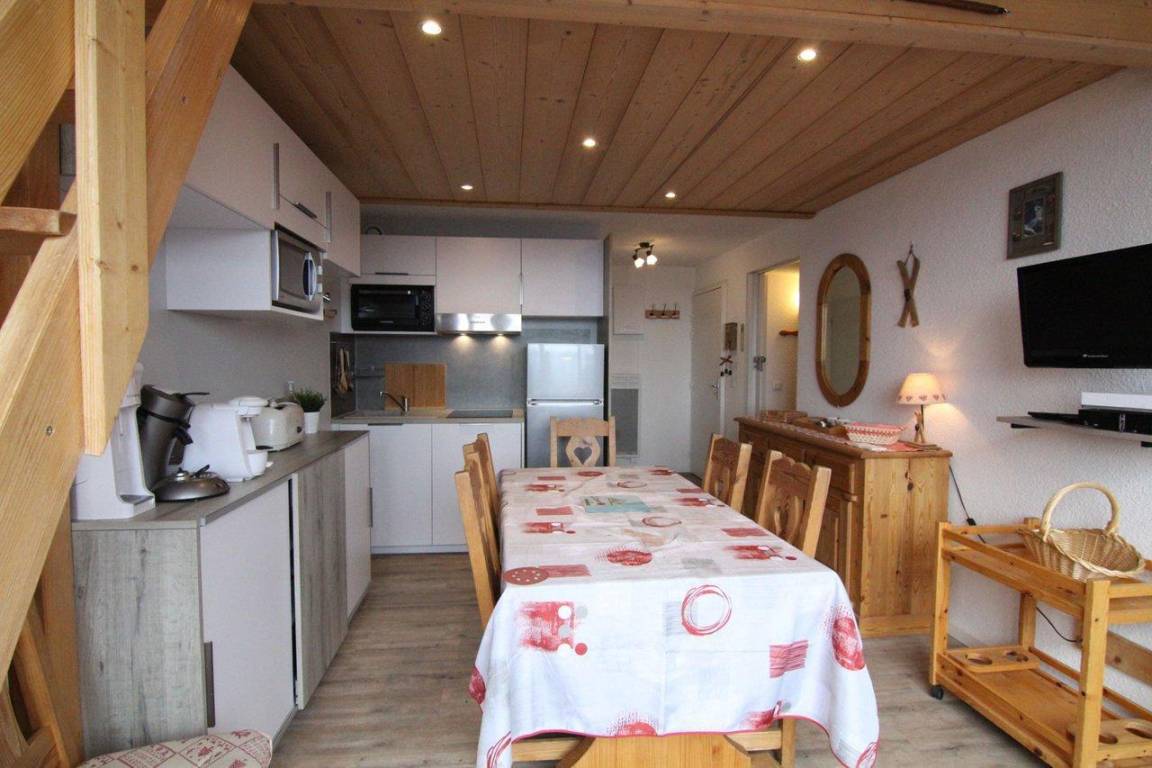 Fläche von ungefähr 40 m². 5te Etage. Orientierung : Süd, West. Wohnzimmer mit Ausziehschlafcouch für 2 Personen (80 cm). Schlafbereich mit Doppelbett (140). Schlafbereich mit 2 Stockbetten (80). Zwischengeschoss mit Doppelbett (140). Küche mit Staubsauger, Wasserkocher, Kaffeemaschine (filtre et Tassimo), Schnellkochtopf, Backofen, kleiner Backofen mit Mikrowellenfunktion, Toaster, Geschirrspülmaschine, Mixer, 2 Glaskeramikkochfelder. Badezimmer. WC. Balkon. Die oberen Betten sind nicht für Kinder unter 6 Jahren geeignet.