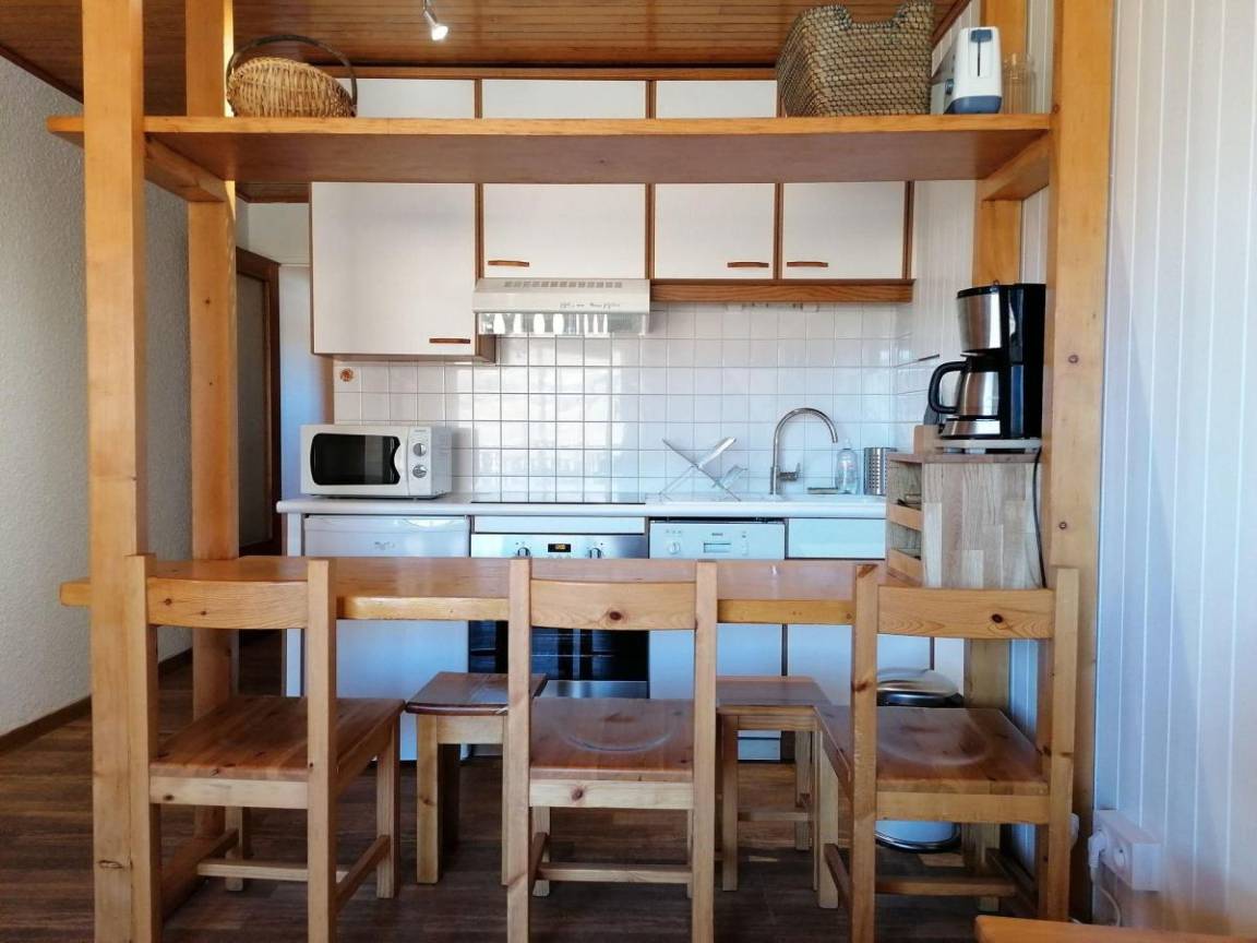 Fläche von ungefähr 44 m². 2te Etage. Orientierung : Ost. Wohnzimmer mit Klappschlafcouch (130 cm). Schlafzimmer mit zusätzliches Einzelbett, 2 Stockbetten (80 cm). offener Schlafbereich mit Doppelbett (160). Küche mit Kaffeemaschine, Backofen, Toaster, Geschirrspülmaschine, Mikrowellenherd, Glaskeramikkochfelder. Badezimmer. WC. Balkon. Die oberen Betten sind nicht für Kinder unter 6 Jahren geeignet.