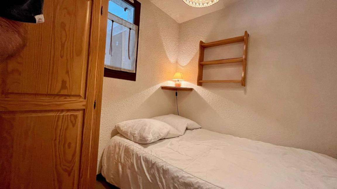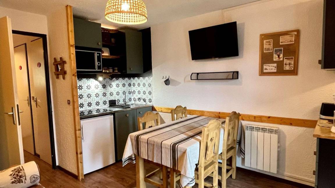 Fläche von ungefähr 24 m². 2te Etage. Orientierung : Süd. Blick tal. Wohnzimmer mit Klappschlafcouch (160). Schlafzimmer mit Doppelbett (140). offener Schlafbereich mit 2 Stockbetten (80). Kochnische mit Raclettegerät, Wasserkocher, Kaffeemaschine (senseo), Backofen, kleiner Backofen mit Mikrowellenfunktion, Toaster, Geschirrspülmaschine, Glaskeramikkochfelder, Kühlschrank. Badezimmer mit Haartrockner. separates WC. Balkon. Die oberen Betten sind nicht für Kinder unter 6 Jahren geeignet.