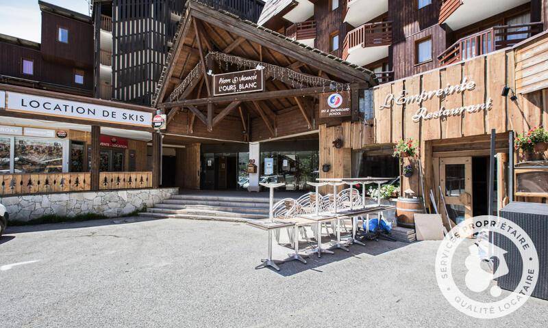 Im Herzen des Ferienortes Alpe d'Huez fügt sich die Residence L'Ours Blanc mit ihrer traditionellen Architektur perfekt in die Berglandschaft ein und wirkt mit ihren Stufendächern gleichzeitig modern.