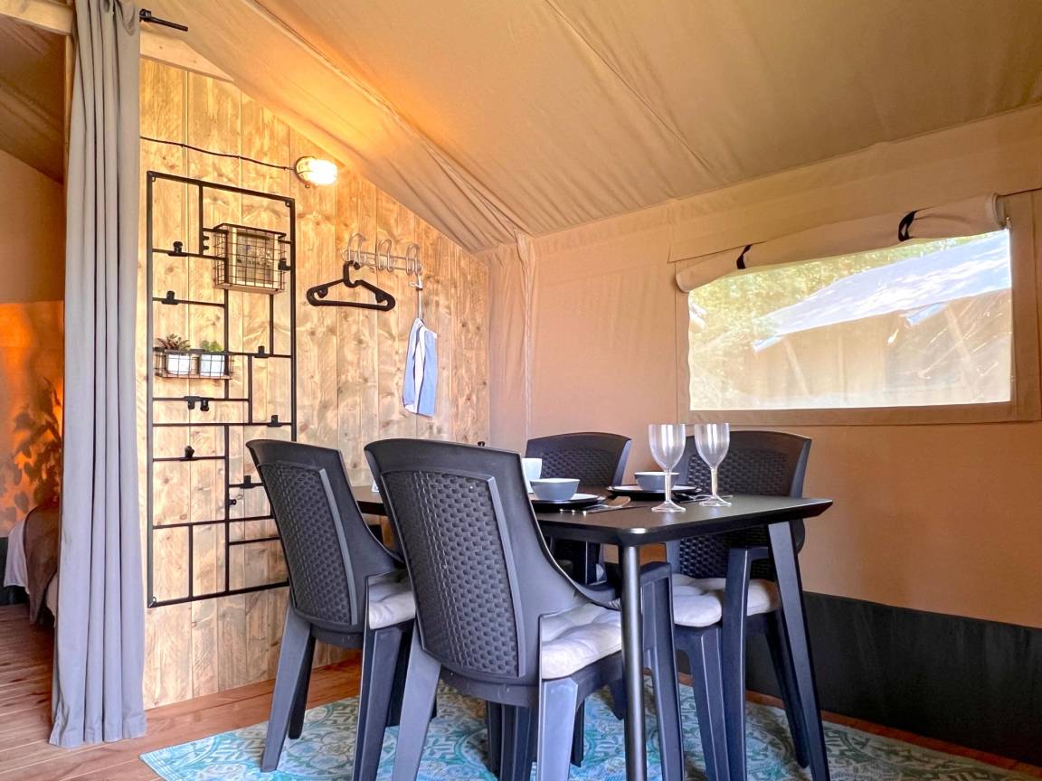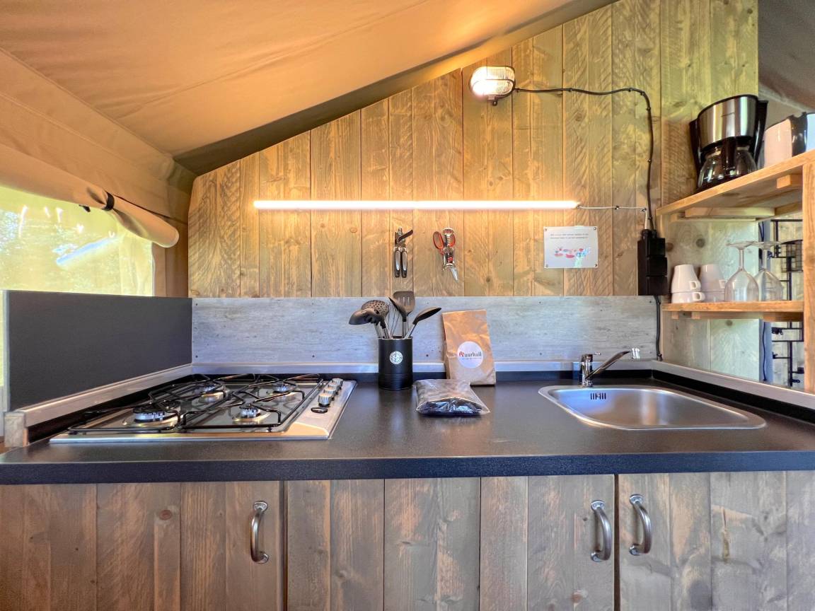 Hausbeschreibung : Entdecken Sie die perfekte Balance zwischen Abenteuer und Komfort und wohnen Sie in einem der Safarizelte auf dem Campingplatz de Vuurkuil. Das Zelt ist sehr geräumig eingerichtet und verfügt über eine Kochnische, ein Badezimmer, eine Schlafkabine mit einem Doppelbett und eine Schlafkabine mit einem Etagenbett. An der Vorderseite des Zeltes befindet sich eine Terrasse, auf der Sie sich mit Blick auf das Campingfeld, auf dem sich auch die anderen 5 Safarizelte befinden, entspannen können