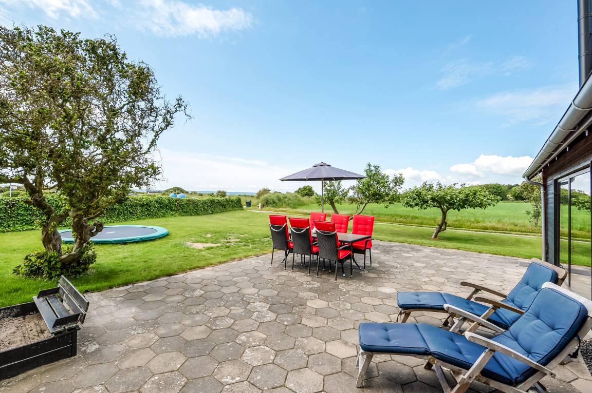 DraußenDie Ferienunterkunft liegt auf einem 1722 m² großen Gartengrundstück. Die Entfernung zum Meer beträgt 100 m. Die nächste Einkaufsmöglichkeit liegt 5000 m entfernt. Es steht ein 70 m² Terrassenareal zur Verfügung. Schaukel. 2 Sandkästen. Trampolin. Fußballtor. Parkplatz auf dem Grundstück.