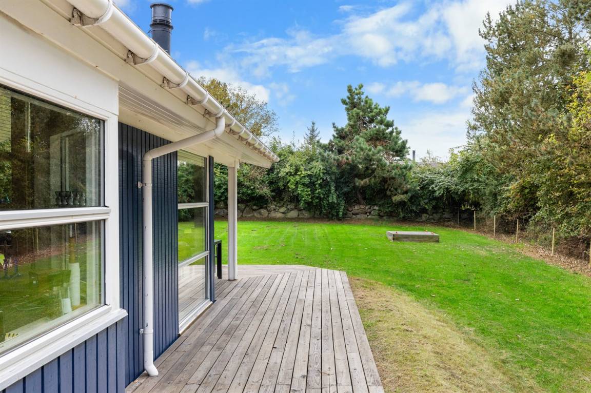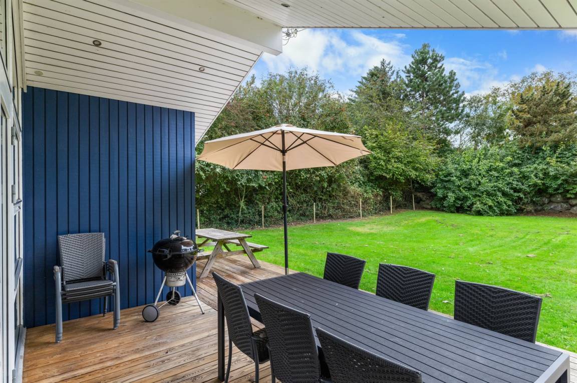 Zum Haus gehört eine schöne, nach Süden ausgerichtete Terrasse, die teilweise überdacht ist. Im eingezäunten Garten gibt es viel Platz für Aktivitäten im Freien. Übrigens: Der Zaun 90 cm hoch.