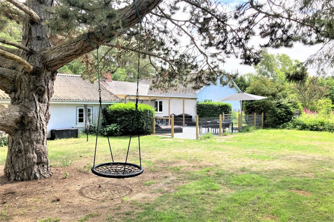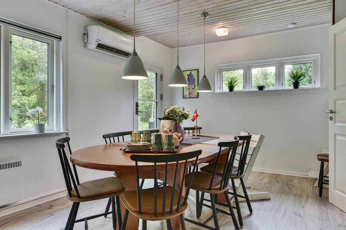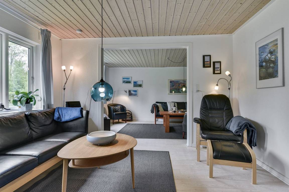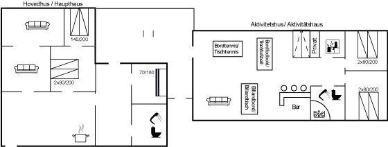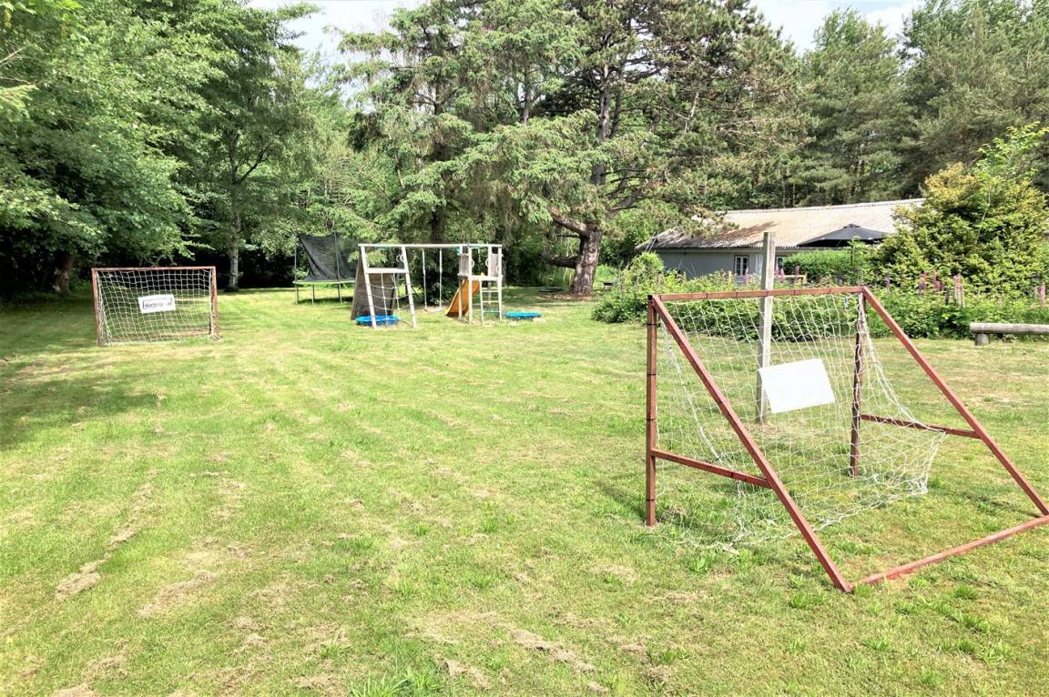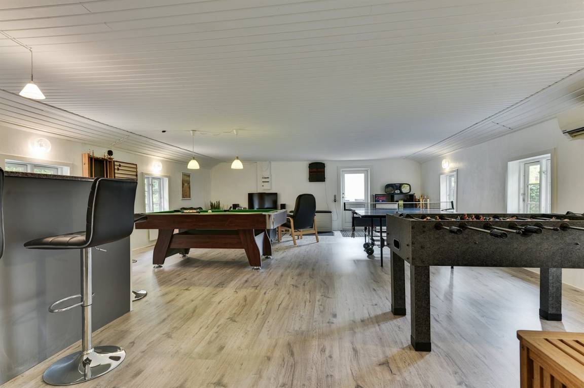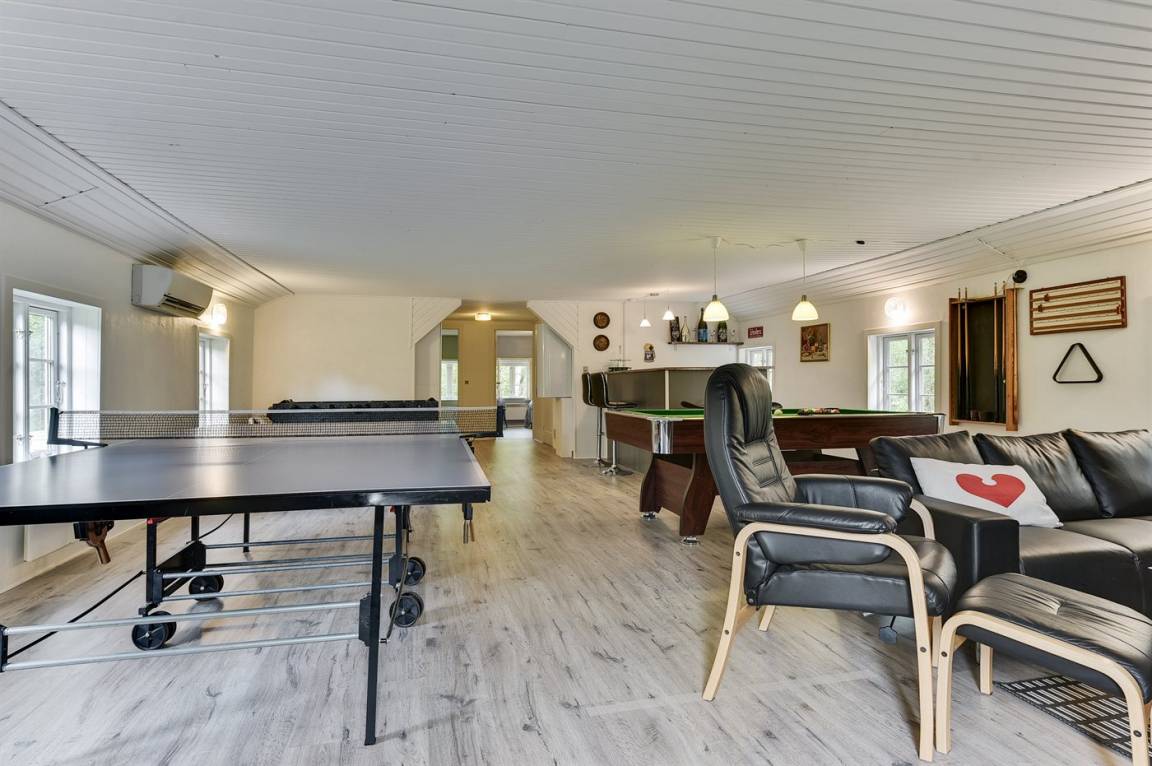 Dieses schöne Ferienhaus liegt auf einem sehr großen Naturgrundstück (4000 m²) in einer sehr kinderfreundlichen Umgebung – etwa 200 m von einem der besten Strände Fünens entfernt. Das Gelände ist teilweise von einem unter Naturschutz stehenden Wald mit einem reichen Tierleben umgeben. Das Haus liegt nur 500 m vom Feriepark Langeland mit vielen Aktivitäten und Minimarkt und 3 km von der Stadt Humble mit Einkaufsmöglichkeiten entfernt. Langeland bietet auch einen Golfplatz an, der nur 8 km entfernt liegt. Das Ferienhaus ist in 2 Häuser unterteilt, von denen das Haupthaus über 3 Schlafzimmer verfügt, wo das eine Zimmer mit Kinder-Etagenbett ausgestattet ist. Das andere Gebäude ist mit einem großen Aktivitätsraum, einer schönen Bar mit Kühlschrank, einer gemütlichen Ecke mit TV und Spielkonsole, 2 Schlafzimmer, ein Badezimmer mit Whirlpool sowie Sauna eingerichtet. Das Haus eignet sich für 8 Personen sowie 2 Kinder bis zu 3 Jahren. Das Haus wurde 1957 gebaut, 1999/2021 teilweise renoviert und hat eine Wohnfläche von 194 m². Es ist erlaubt, 2 Haustiere mitzubringen. Es sind 3 energiesparende Wärmepumpen installiert. An weiterer Austtatung können Waschtrockner, Tiefkühlmöglichkeit mit 100 Liter Nutzinhalt und Kaminofen erwähnt werden. Für die Kleinen gibt es 2 Reisebetten, 2 Kinderhochtstühle und Sportkarre. Die Unterkunft verfügt über eine 46 m² große, offene Terrasse und eine überdachte Terrasse (34 m²) mit Grill, Gartenmöbeln, Sonnenschirm und Liegestühlen. Auf dem Grundstück stehen Schaukel, Rutsche, Trampolin und Fußballtor zur Verfügung. Krocket, Hockey, Petanque und Badminton sind ebenfalls vorhanden. Das Grundstück ist teilweise eingezäunt. Parkmöglichkeit auf dem Grundstück. Im Aktivitätsraum befinden sich folgende Geräte: Billard, Tischtennis, Darts und Tischfußball. Die Küche ist mit Kühlschrank, 4 Kochfeldern, Umluftofen, Kombiofen, Kaffeemaschine und Geschirrspüler ausgestattet. Es gibt 2 Badezimmer, beide mit Fußbodenheizung, Dusche und Toilette. Das eine Badezimmer verfügt außerdem über einen 2-Pers.-Whirlpool und es ist eine große Sauna vorhanden. Ferner stehen 2 TV's, DVD-Player, Radio, Stereoanlage, CD-Player, Nintendo Wii, mindestens 4 deutsche, 1-3 schwedische, 1-3 norwegische, mindestens 4 dänische und mindestens 4 englische Kanäle sowie kabellose Internetverbindung zur Verfügung.