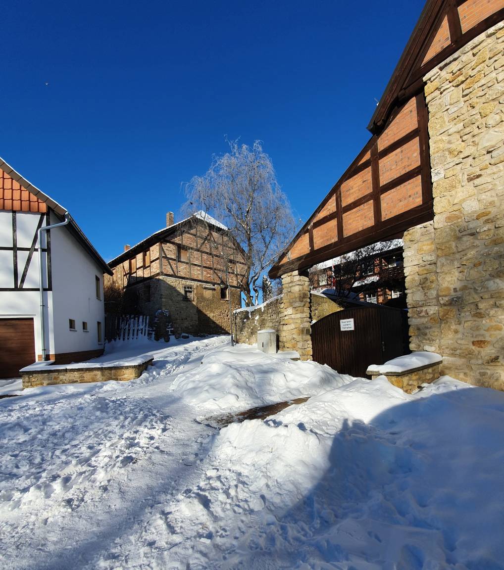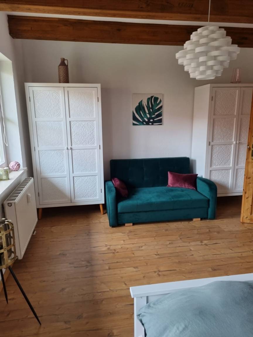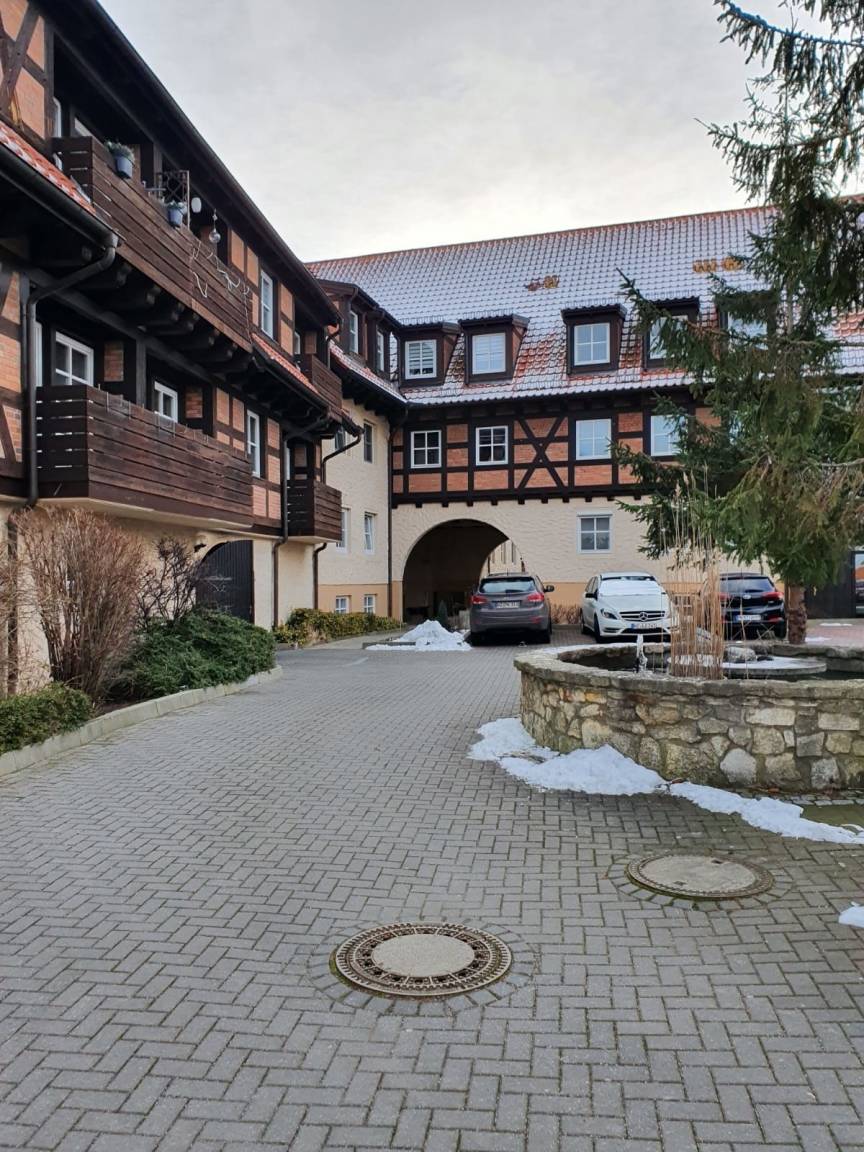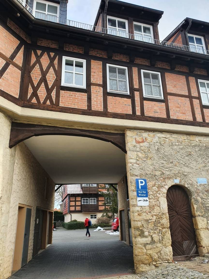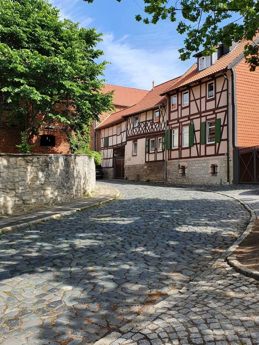 Die 2 Zimmer Wohnung, im ehemaligen Klosterhof aus dem 11.Jahrhundert, liegt in einem kleinen romantischen Fachwerk-Ort nahe Halberstadt und unterhalb an der Huysburg, zu der man vorbei an Höhlen bequem wandern kann. Unweit der Wohnung befindet sich ein großer EDEKA-Markt, ein Fleischer, ein Bäcker und ein Blumenlädchen.