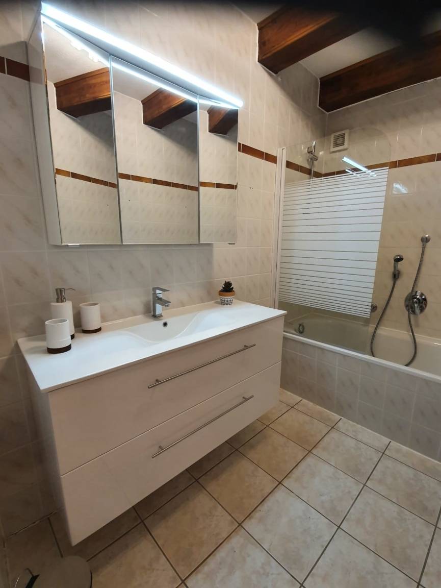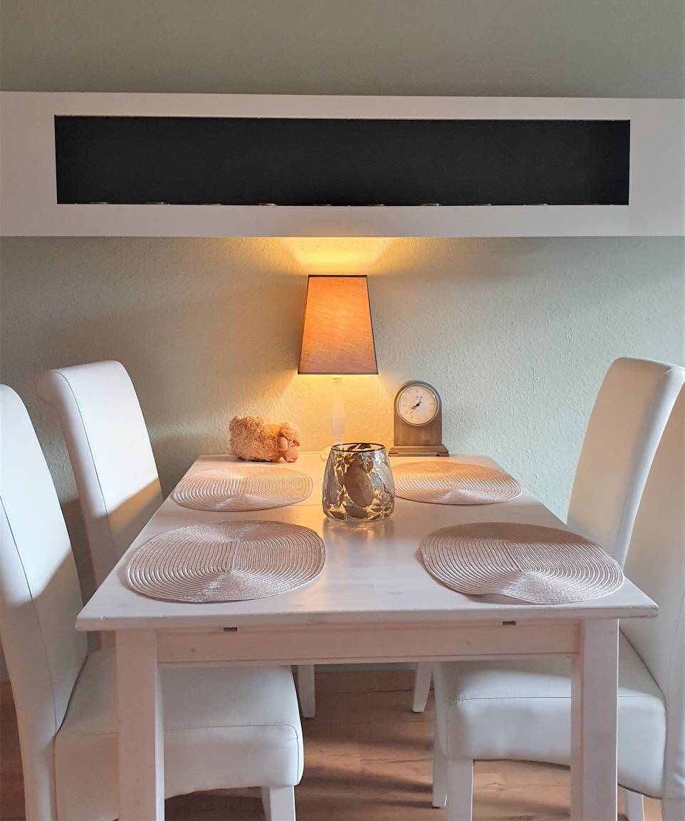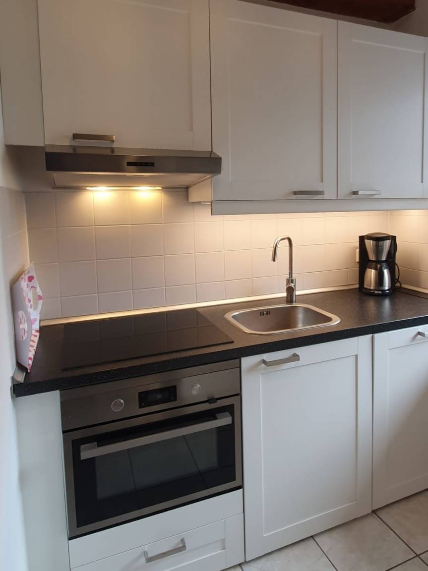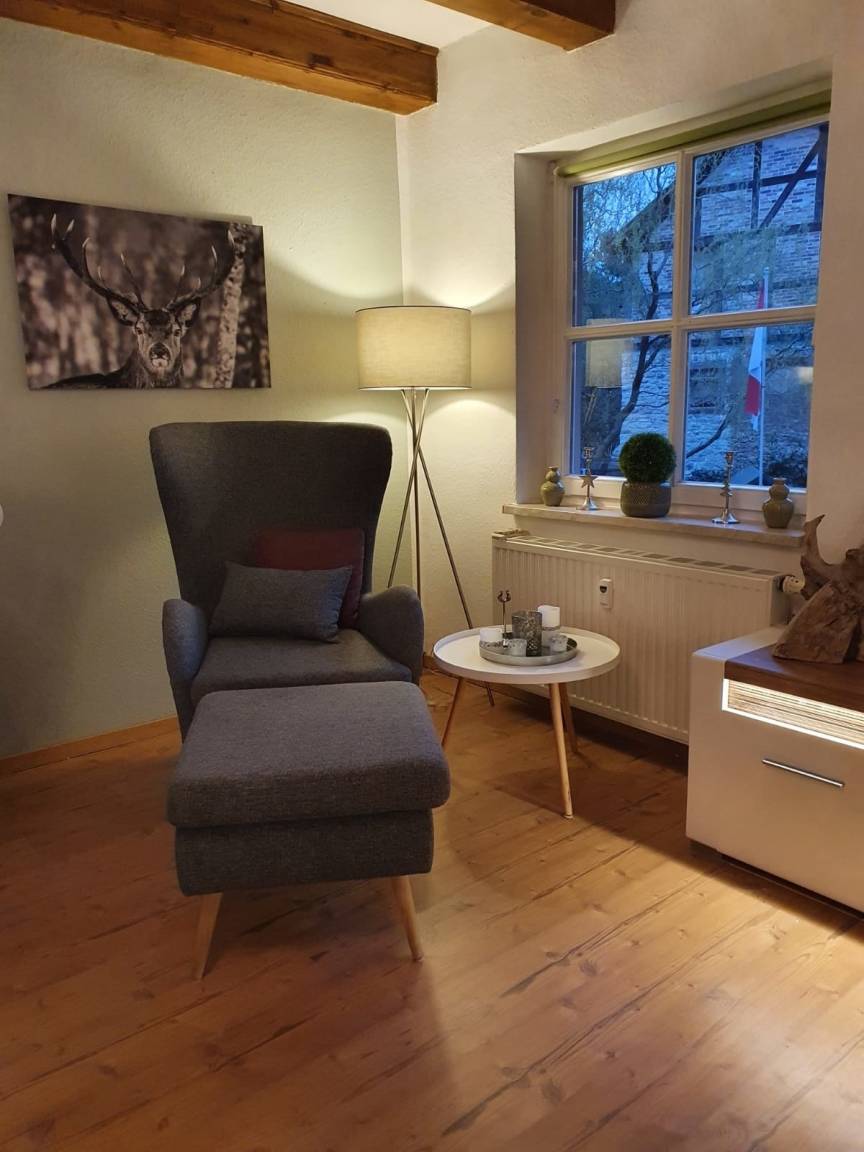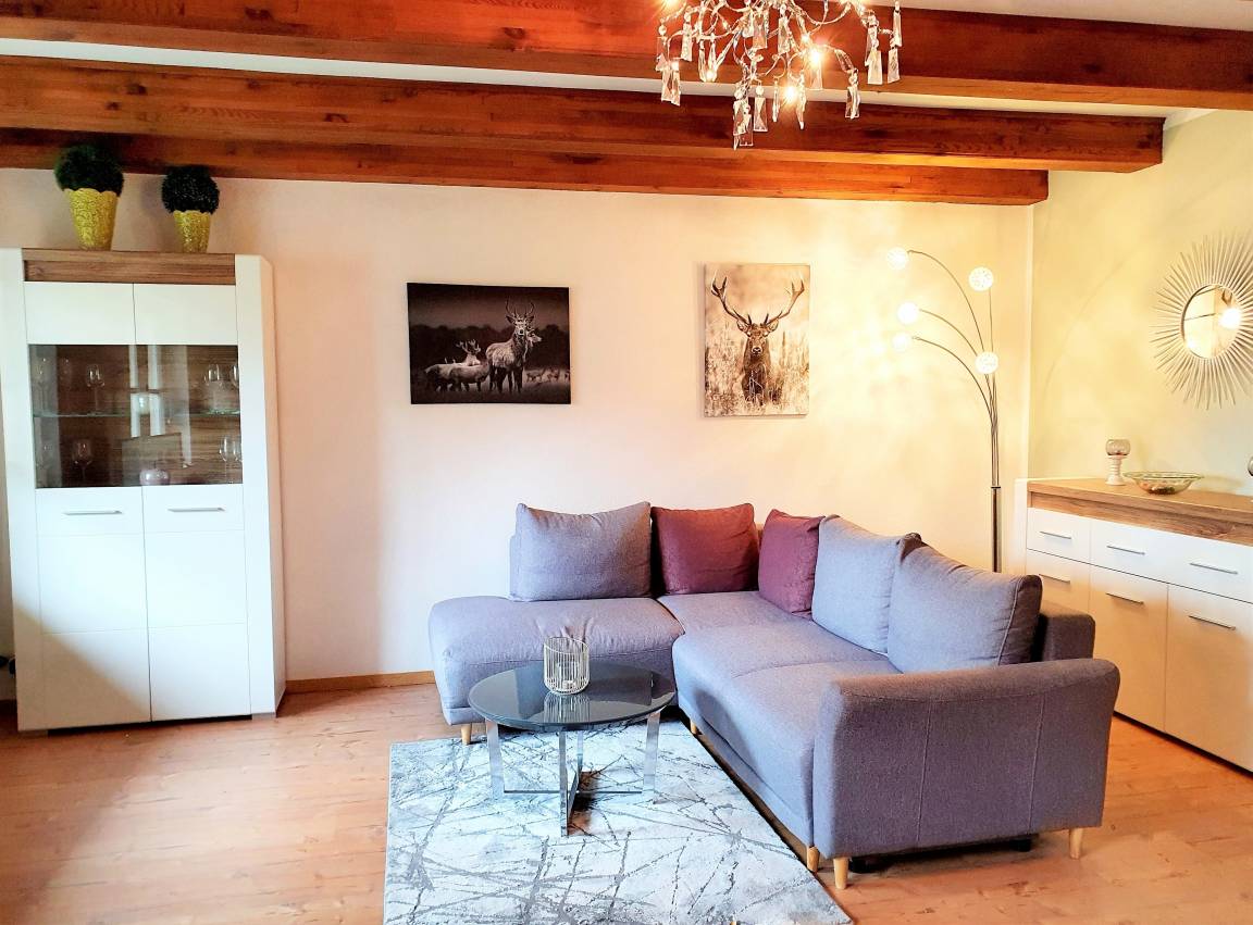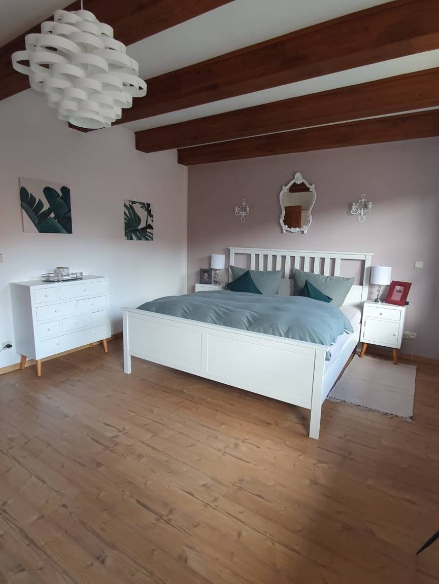 Die schöne große Wohnung (2 große Zimmer) befindet sich in der 1. Etage links einer Fachwerk-Wohnanlage. Holzbalken unter der Decke in jedem Raum. Die Wohnung wurde 2023 völlig neu eingerichtet .