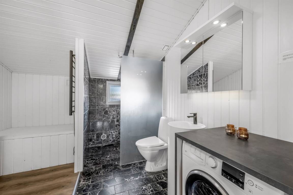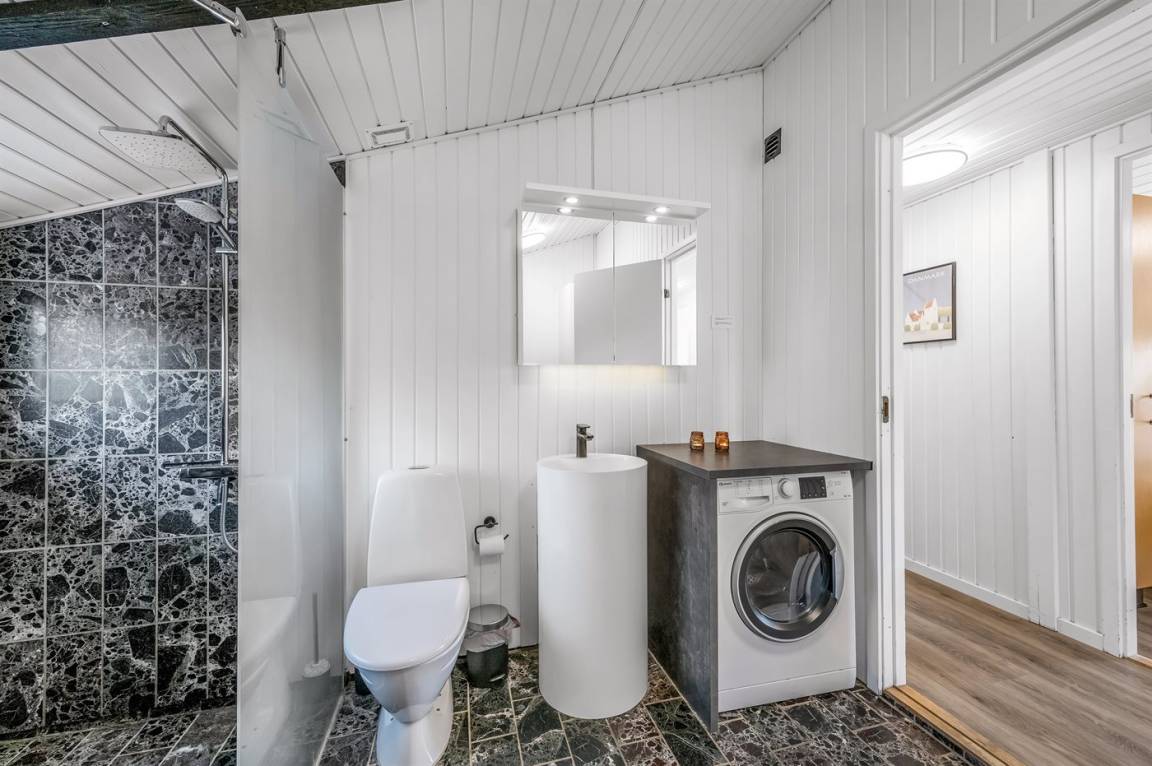 Das Haus verfügt über 1 Badezimmer mit Fußbodenheizug, Duschnische, Toilette und Badezimmerheizkörper. Falls man während des Urlaubs Wäsche waschen muss, steht im Badezimmer ein Waschtrockner bereit.