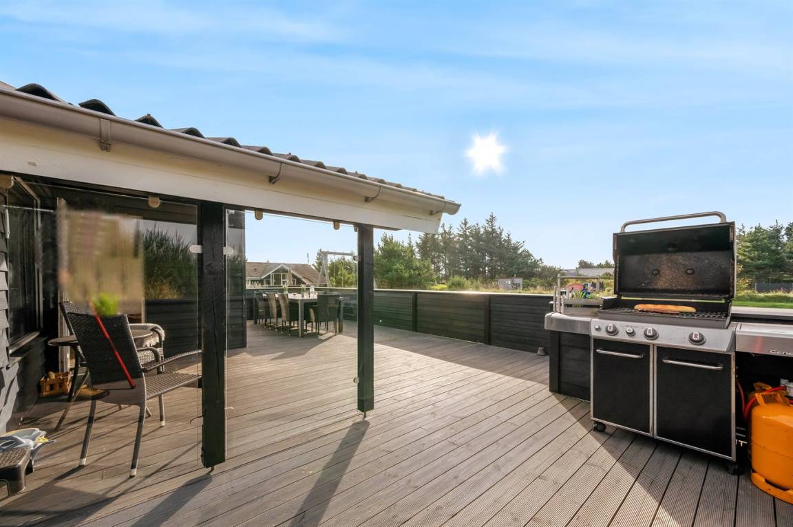 Vom Wohnzimmer aus gelangt man auf die schöne, 80 m² große geschlossene Terrasse, von der 8 m² überdacht sind. Dort stehen ein Gasgrill, Gartenmöbel und Liegestühle bereit, damit man die warmen Sonnentage voll und ganz nutzen und den Tag mit einem Grillabend unter freiem Himmel beenden kann. Auf der eingezäunten Terrasse gibt es außerdem eine Abteilung mit elektrisch beheizbarem Hot Tub und Saunatonne, von der aus man den Sonnenuntergang über dem Meer betrachten kann. Für kleine Kinder ist eine Schaukel vorhanden.