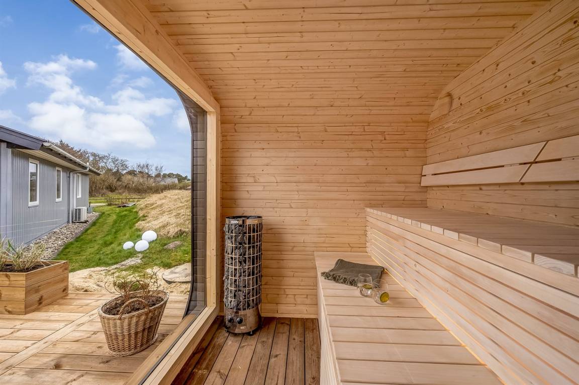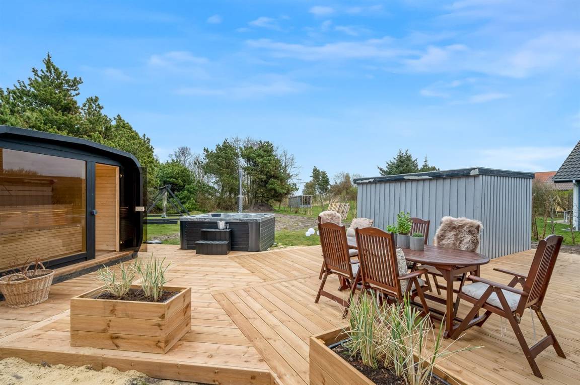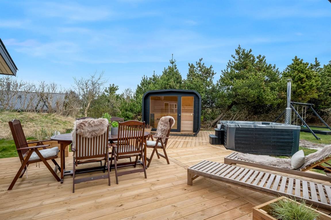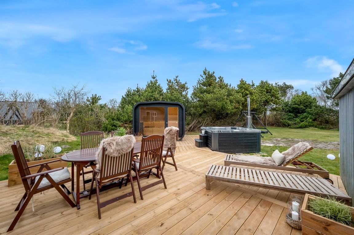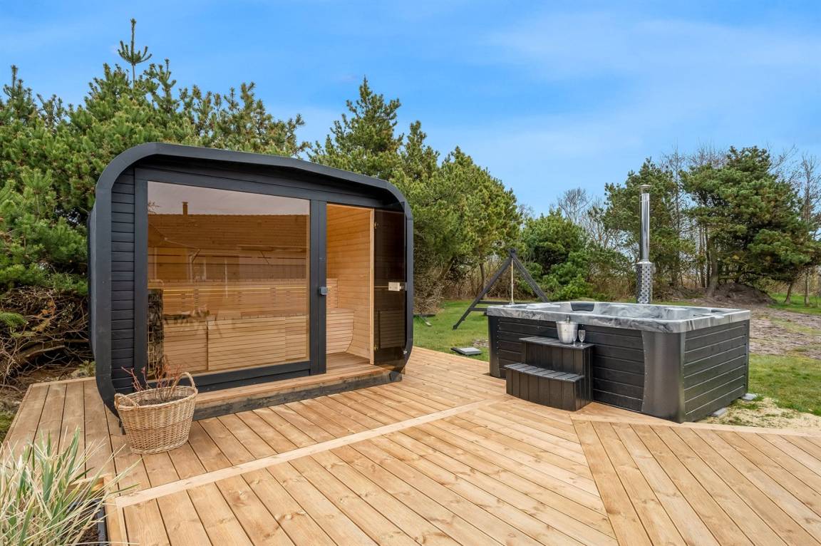 Wenn ihr euch noch mehr Luxus und Selbstverwöhnung gönnen möchtet, könnt ihr die feine Terrassenlandschaft des Ferienhauses genießen, die Außensauna anheizen und das Wildnisbad aufwärmen. Eingetaucht in das warme Wasser könnt ihr vollkommen entspannen – und am Abend habt ihr einen freien Blick auf den klaren, funkelnden Sternenhimmel. Auf der Terrasse gibt es außerdem eine Außendusche, in der ihr euch nach einem erfrischenden Bad in der Nordsee das Salzwasser von der Haut und den Sand von den Füßen spülen könnt. Oder ihr entscheidet euch für eine morgendliche Dusche unter freiem Himmel. Die Außendusche ist von April bis November nutzbar.