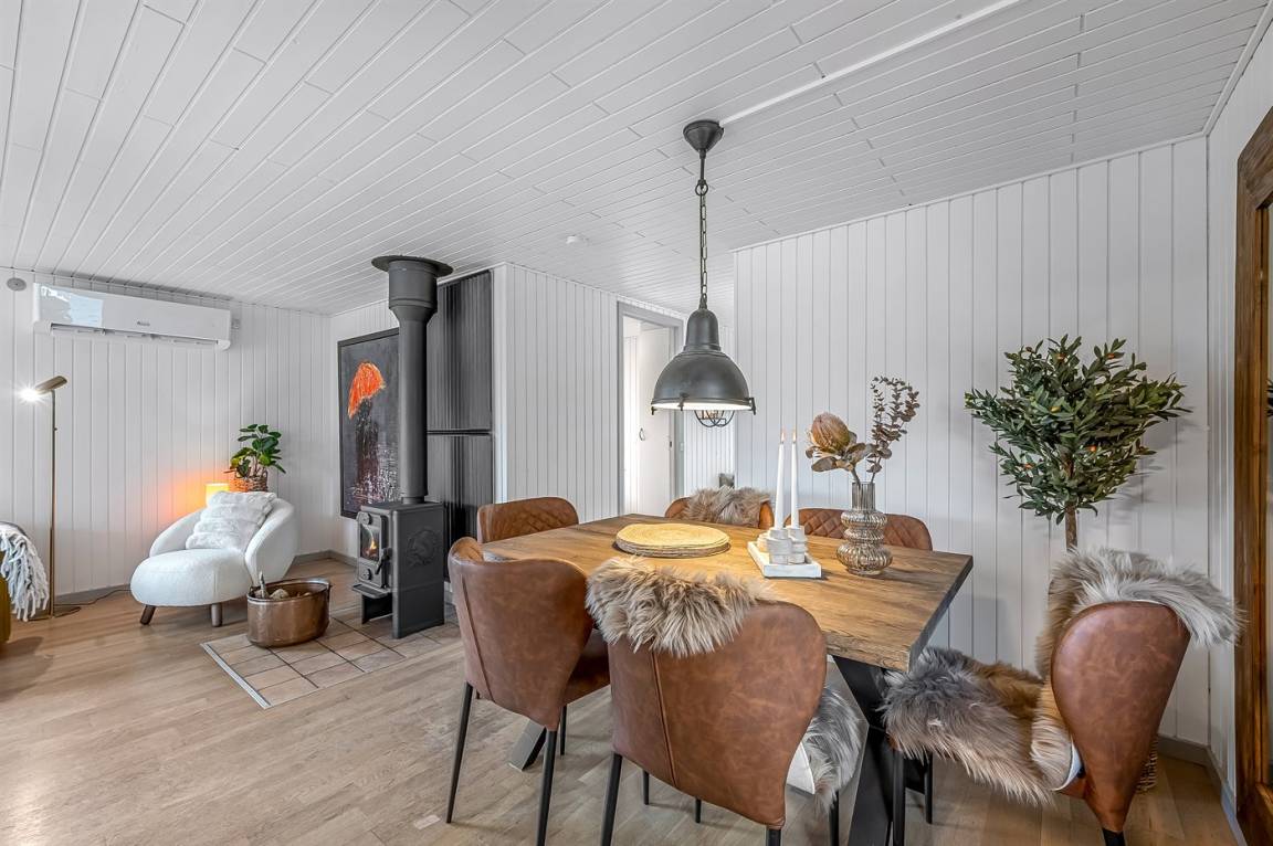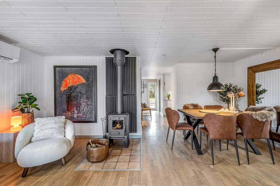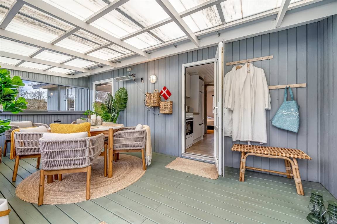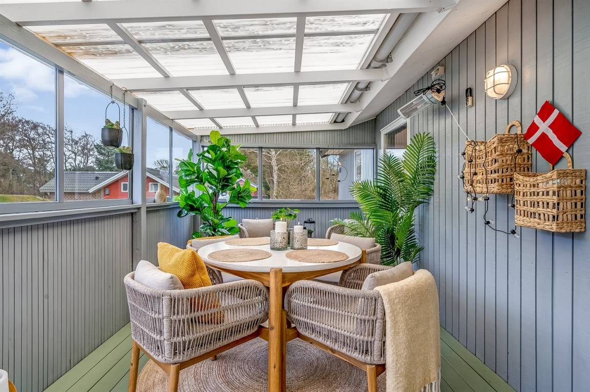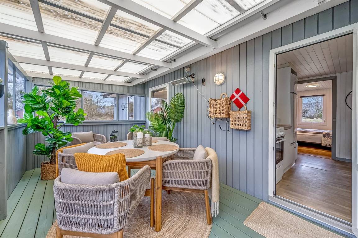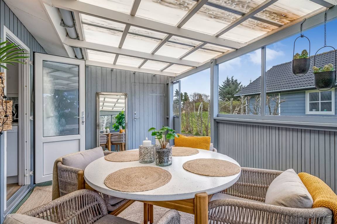Vom offenen Wohn- und Essbereich, der mit seinem Kaminofen zu schönen Stunden mit einem guten Buch einlädt, habt ihr Zugang zum gemütlichen Wintergarten, in dem ihr euch mitten in der Natur fühlen werdet. Hier könnt ihr die langen Sommernächte noch weiter ausdehnen. Selbst an Regentagen ist es wunderbar, drinnen im Trockenen zu sitzen und dem Prasseln des Regens auf dem Dach zu lauschen. Falls es kühl wird, könnt ihr euch in kuschelige Decken hüllen oder die Wärmelampe einschalten.