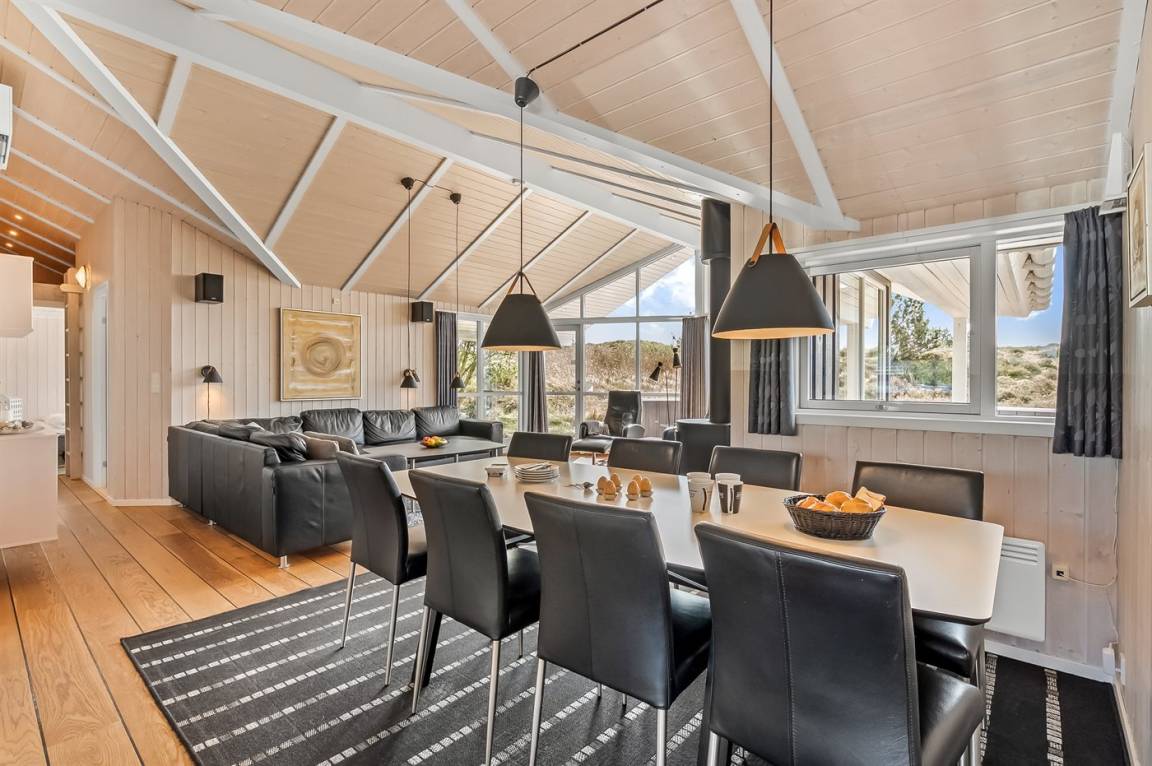 Im großen Wohn-Essbereich strömt das Licht durch die großen Fenster und vermittelt euch das Gefühl, mitten in der Natur zu sitzen. Hier könnt ihr euch mit einem guten Buch auf dem Sofa entspannen, während das Feuer im Kamin leise knistert, köstliche Mahlzeiten in der großzügigen Küche zubereiten oder gemeinsam Brettspiele spielen und einfach die Zeit miteinander genießen.