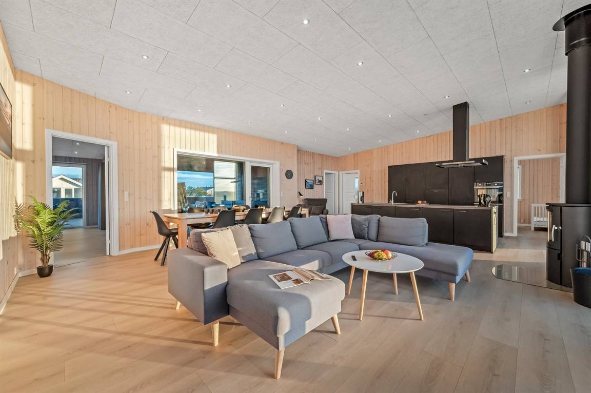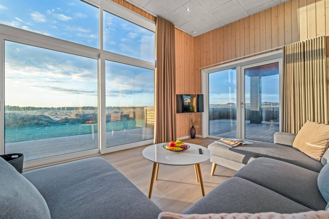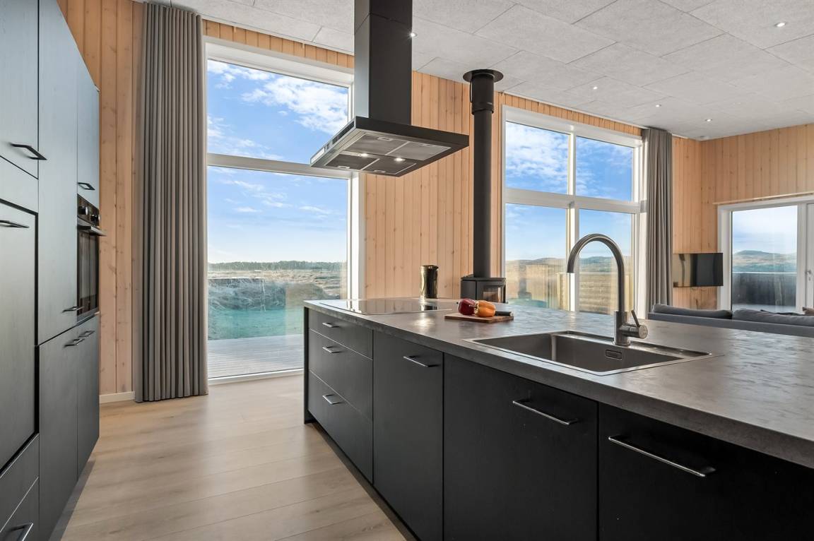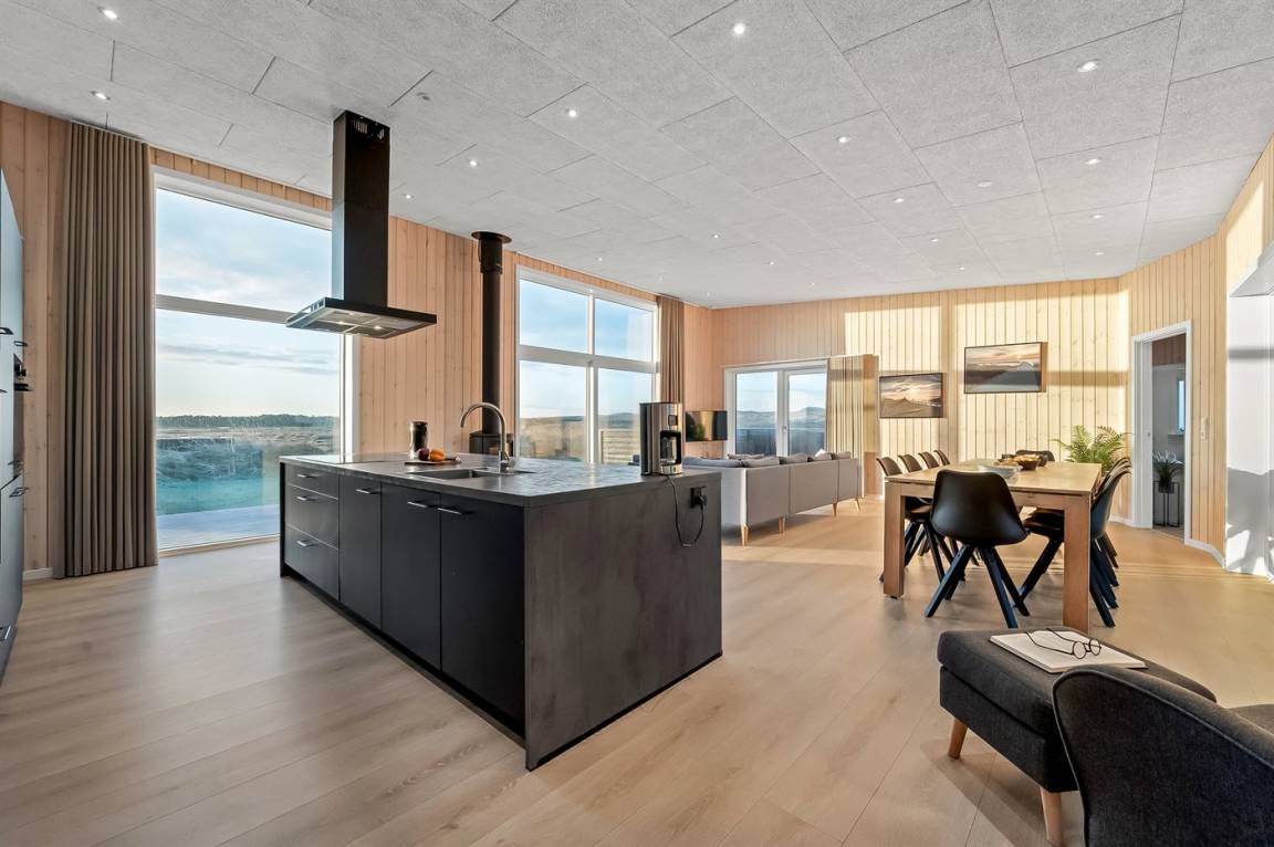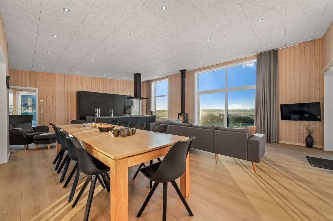 Die großen Fensterfronten lassen das schönste Licht in den gemütlichen Küchen-Wohnbereich einfallen und sorgen gleichzeitig dafür, dass die wunderschöne Aussicht ins Innere gezogen wird. Dies ist ein Ferienhaus, bei dem die Natur ganz nah herankommt. Das Ferienhaus bietet Platz für 10 Personen, und wenn der Hund auch mit an die Nordsee kommen soll, gibt es hier eine kleine Rasenfläche, auf der der Hund frei spielen kann, da diese mit der großen eingezäunten Terrasse verbunden ist.