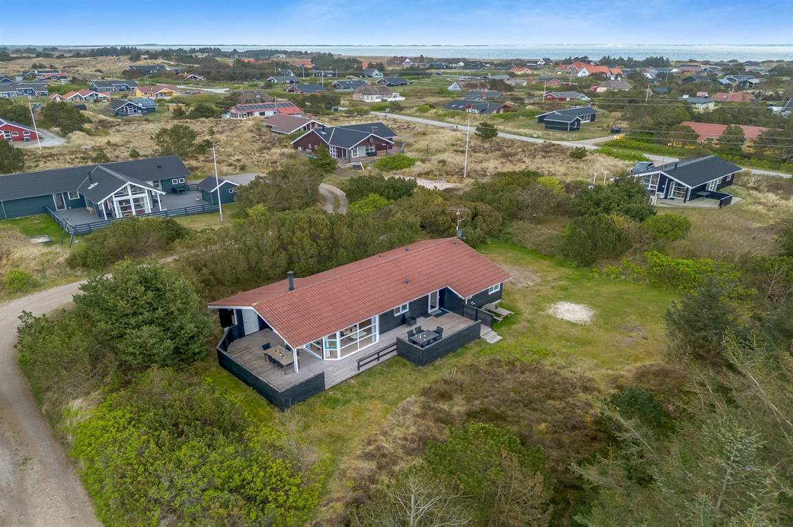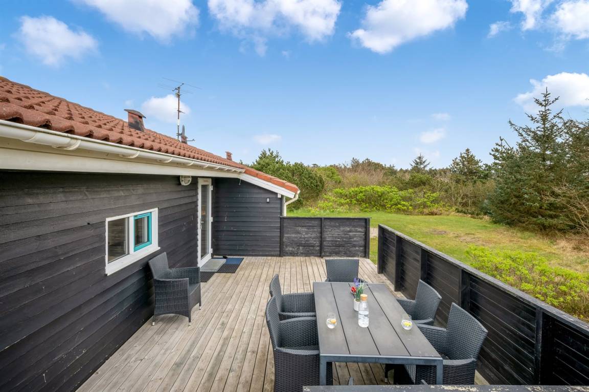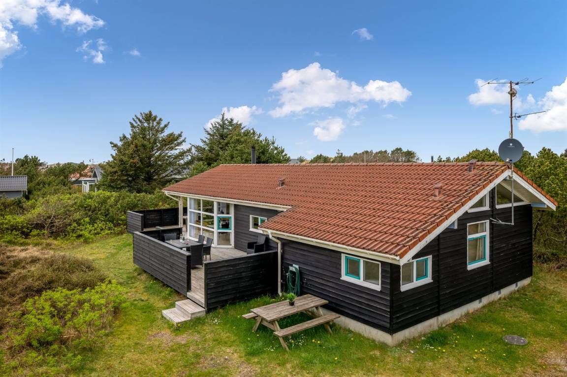 Schönes, gepflegtes Ferienhaus auf einem großen, hügeligen Natur-/Dünengrundstück in naturschöner Umgebung gelegen. Zum Haus gehört ein teilweise überdachtes und abgeschirmtes Terrassenareal mit Gartenmöbeln. Innen ist das Haus gemütlich und gut eingerichtet und die vielen Fenster erlauben einen guten Lichteinfall. Teppichböden, jedoch PVC in der Küche und im Bad sowie Klinkerböden in den Badezimmern. 3 Schlafzimmer mit Doppelbett und 1 Zimmer mit Etagenbett. 2 Badezimmer mit Duschnische und Fußbodenheizung. Das eine Badezimmer hat außerdem 2-Pers.-Whirlpool und Zugang zur Sauna. An weiterer Ausstattung können Stereoanlage mit CD sowie kostenlose, kabellose Internetverbindung (PC ist mitzubringen) erwähnt werden. Sandkiste und Schaukel auf dem Grundstück für die Kinder.