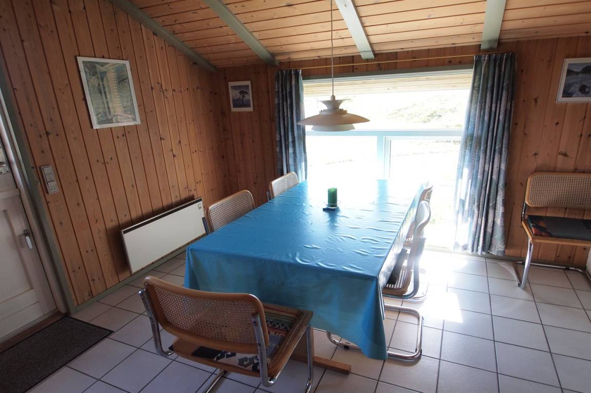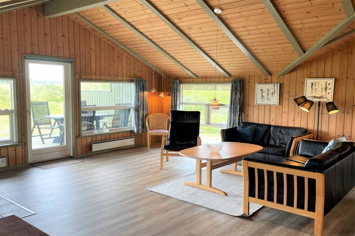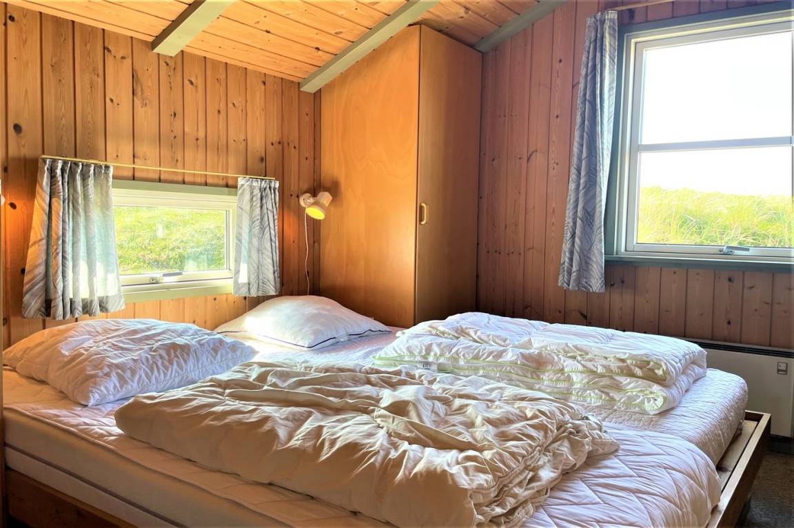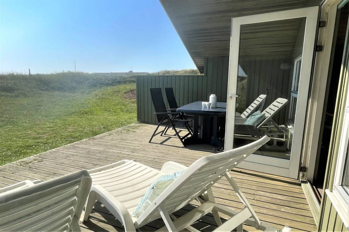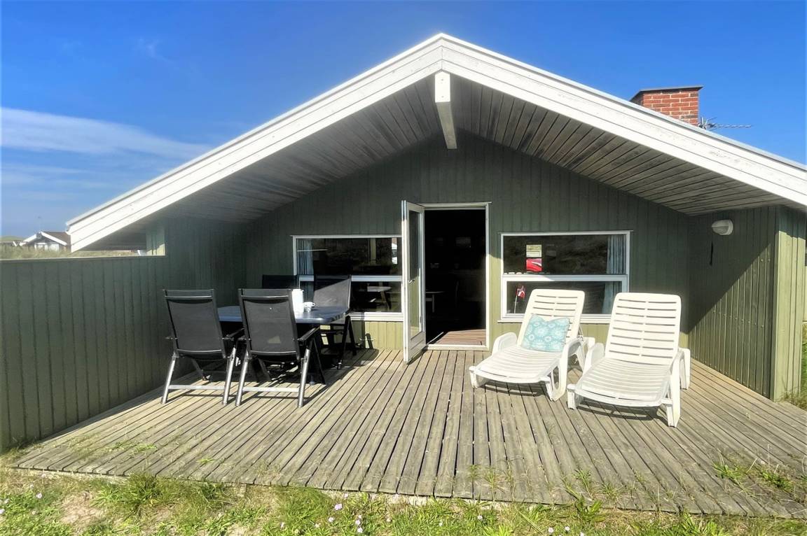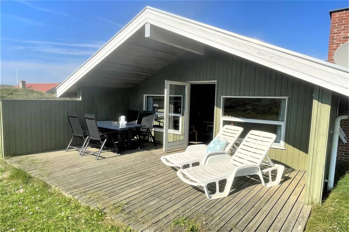 Auf einem hügeligen Dünengrundstück liegt dieses gemütliche Ferienhaus aus Holz, 1992 gebaut. Das Haus verfügt sowohl über eine offene als auch überdachte eine Terrassen mit Gartenmöbeln.