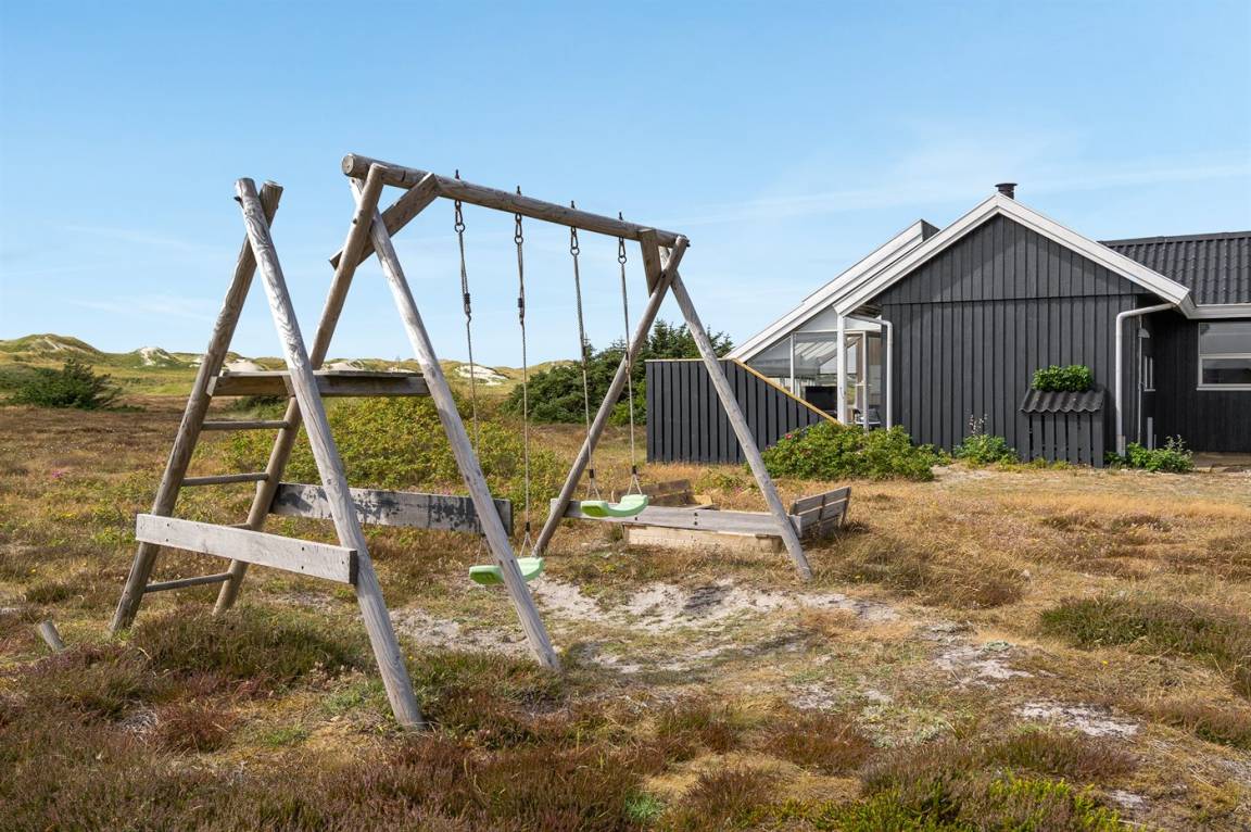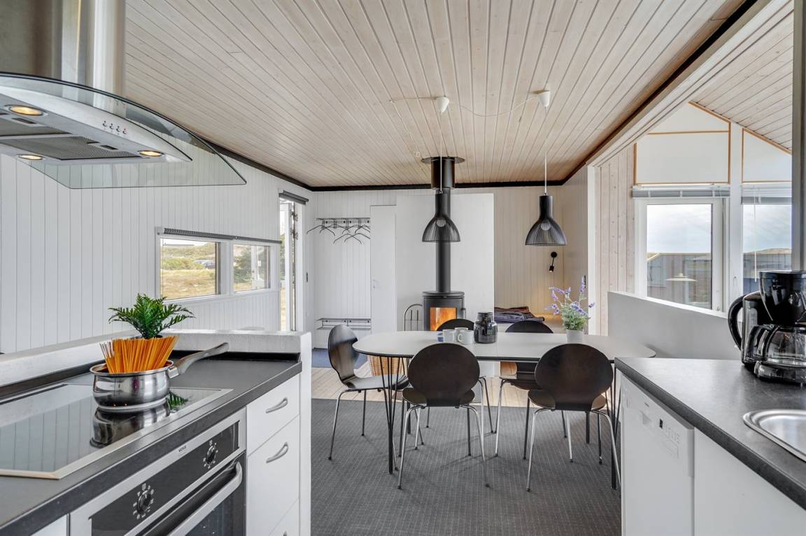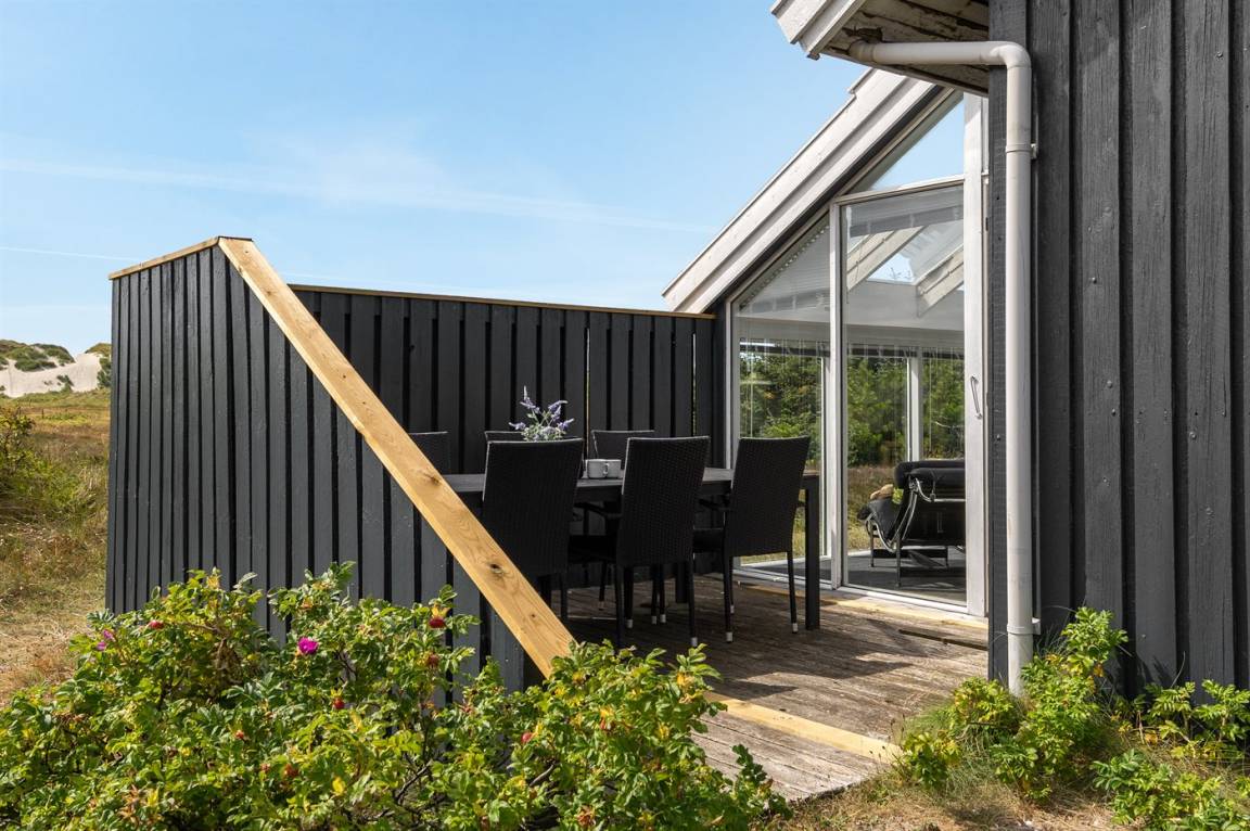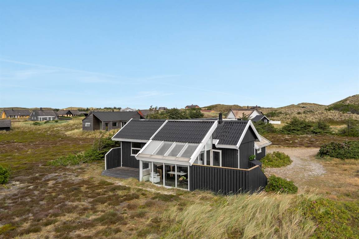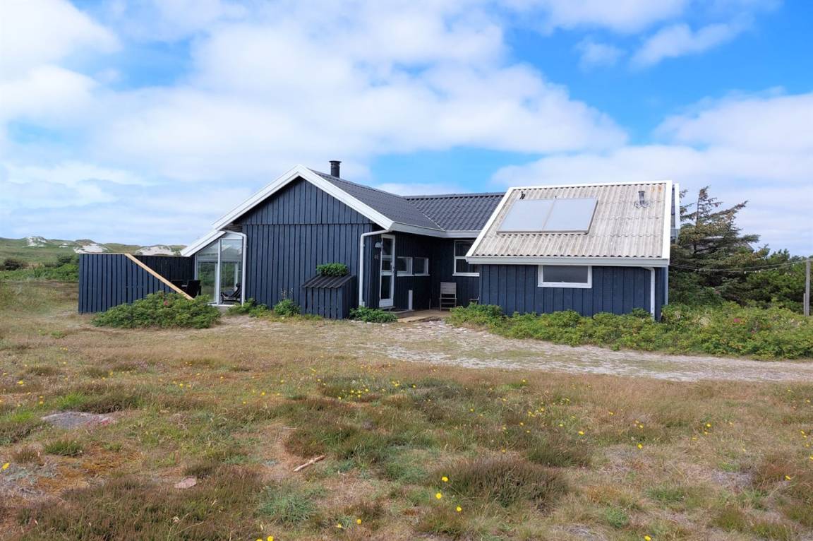 Dieses schöne Ferienhaus aus Holz liegt in erster Dünereihe mit einer herrlichen Aussicht auf die schöne Dünenlandschaft. Das Ferienhaus wird laufend in Stand gehalten und wurde 2012 u. a. mit einer neuen Küche ausgestattet. Eine energiegerechte Wärmepumpe, die auch als Aircondition funktioniert, sorgt für die Beheizung. Badezimmer mit Fußbodenheizung, Waschmaschine und Wäschetrockner. Sauna. Whirlpool-Abteilung mit Duschnische, Fußbodenheizung und 2-Pers. Whirlpool. Küche mit u. a. Tiefkühlgerät, Mikrowelle und Geschirrspüler. Das gemütlich eingerichtete Wohnzimmer enthält Kaminofen, Stereoanlage mit CD-Spieler, TV mit digitalem Satellitenanschluss (dänsiche und internationale Fernsehsender) und integriertem DVD-Spieler. Die Schlafplätze verteilen sich auf 1 Zimmer mit Doppelbett, 1 Zimmer mit 2 Einzelbetten und 1 Zimmer mit Etagenbett. Im Wohnzimmer finden Sie ferner Alkoven mit 2 Schlafplätzen. Außerdem kostenlose, kabellose Internetverbindung (Computer ist mitzubringen) vorhanden. Für die jüngsten Feriengäste stehen Kinderbett, Kinderhochstuhl, Sandkasten und Schaukel zur Verfügung. Carport auf dem Grundstück.