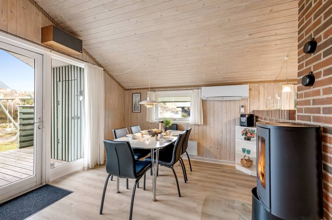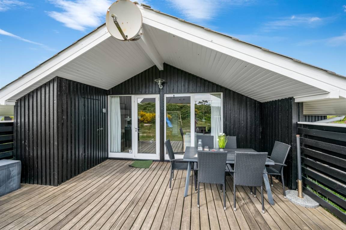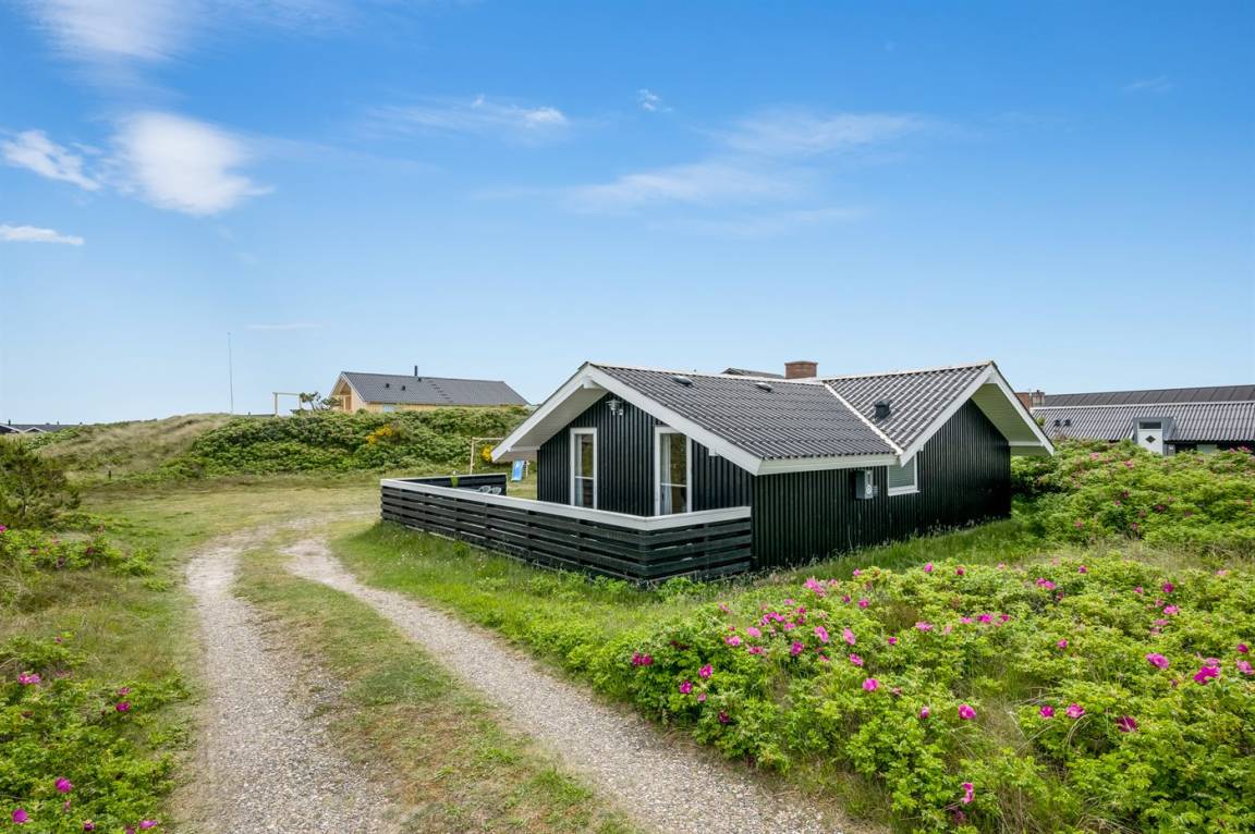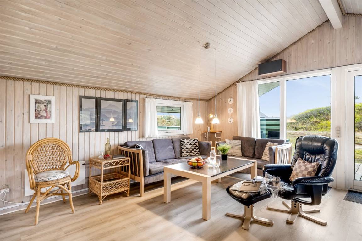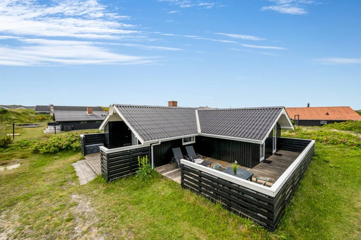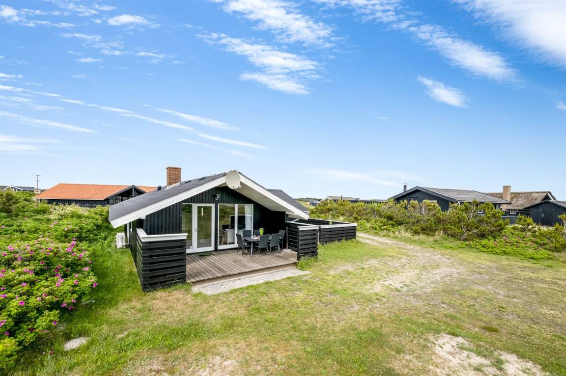 Auf einem schönen, hügeligen Dünengrundstück nur 200 m vom Meer entfernt liegt dieses schöne und gepflegte Ferienhaus aus Holz, 1985 gebaut und 2008 modernisiert. Offenes und überdachtes Terrassenareal mit diversen Gartenmöbeln und gutem Windschutz. Holzdecken und -wände, Teppichböden überall - jedoch PVC-boden in der Küche. Badezimmer mit Duschnische und Fußbodenheizung. Die Küche ist mit u. a. Geschirrspüler, Mikrowelle und Kühlschrank mit Gefrierfach ausgestattet. Gemütliches Wohnzimmer mit Kaminofen und Flatscreen-TV mit digitalem Satellitenanschluss. 3 Zimmer; 1 mit Doppelbett, 1 mit 2 Einzelbetten und 1 mit Etagenbett. Ferner stehen Waschmaschine sowie Wäschetrockner zur Verfügung und es ist eine energiegerechte Wärmepumpe installiert. Für die Kinder gibt es Sandkasten, Schaukel, Kinderbett und Kinderhochstuhl. Ein Ferienhaus mit einer guten Lage.