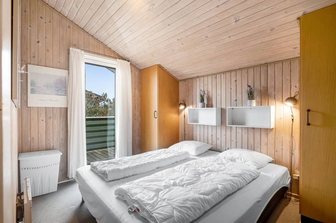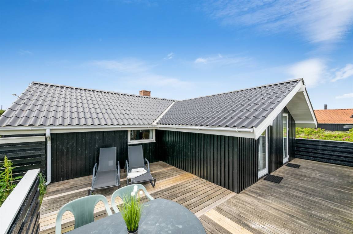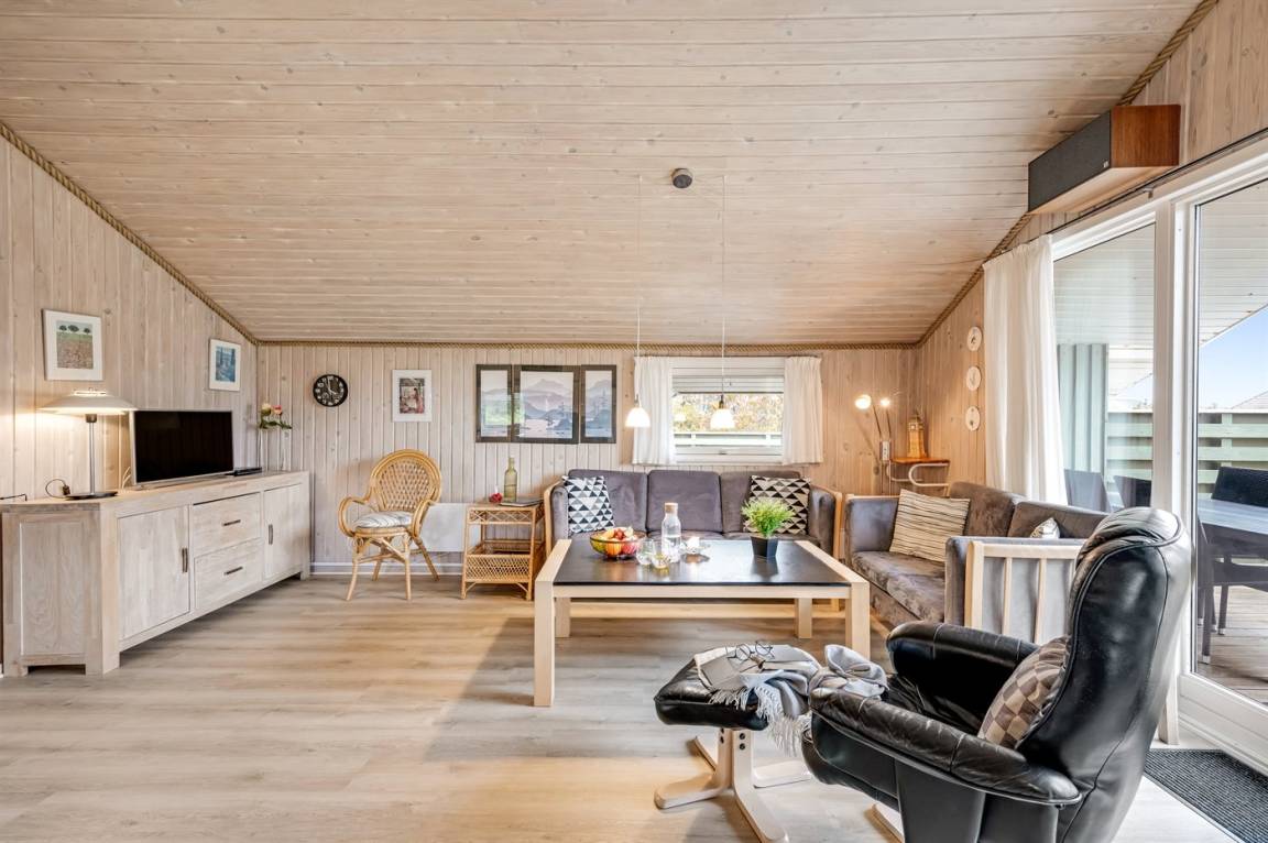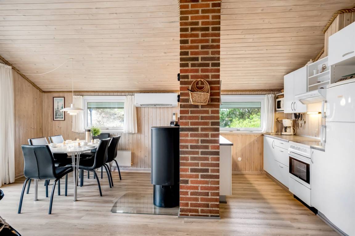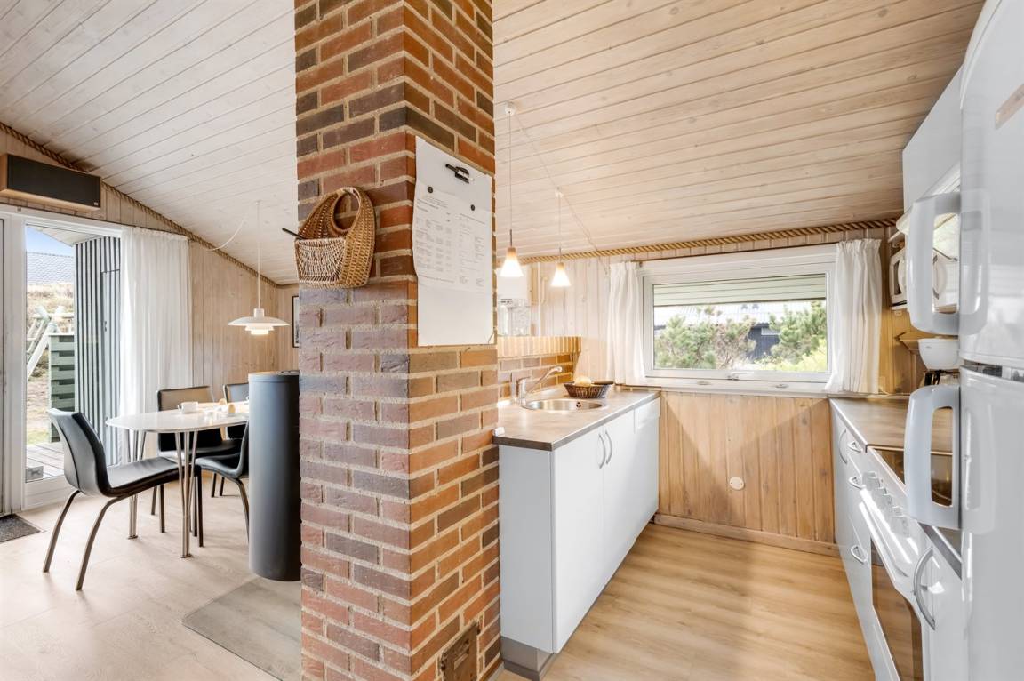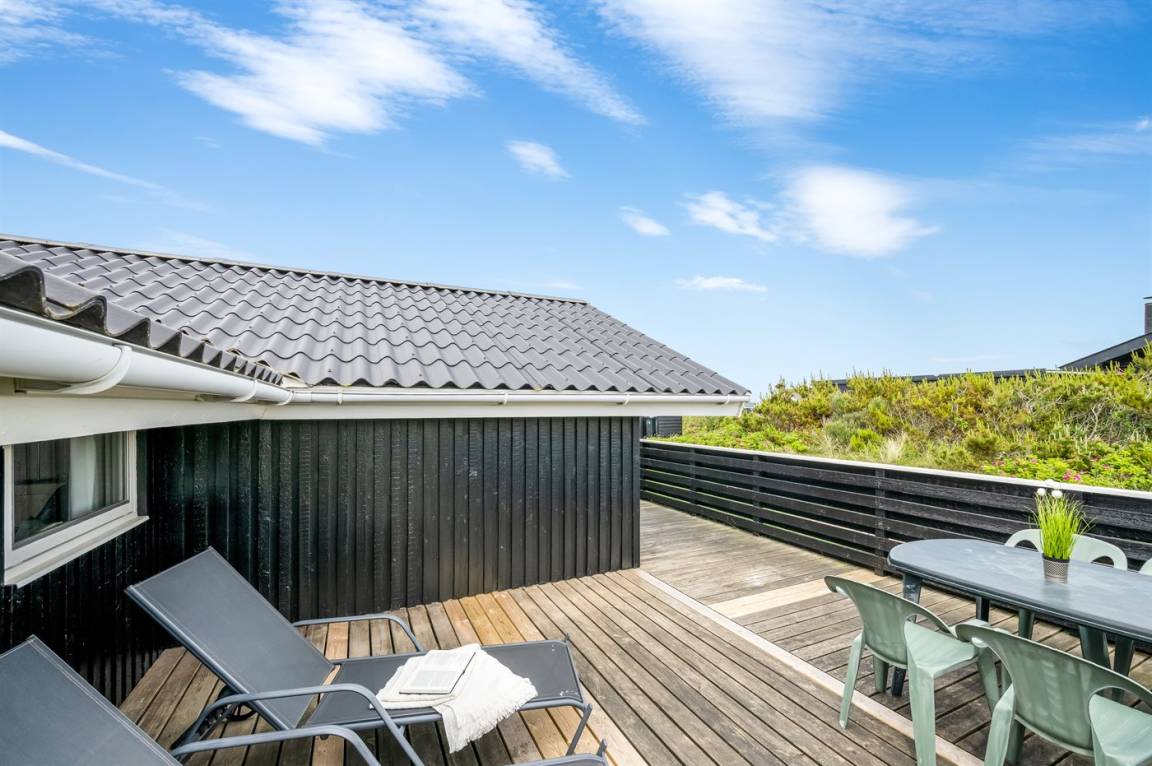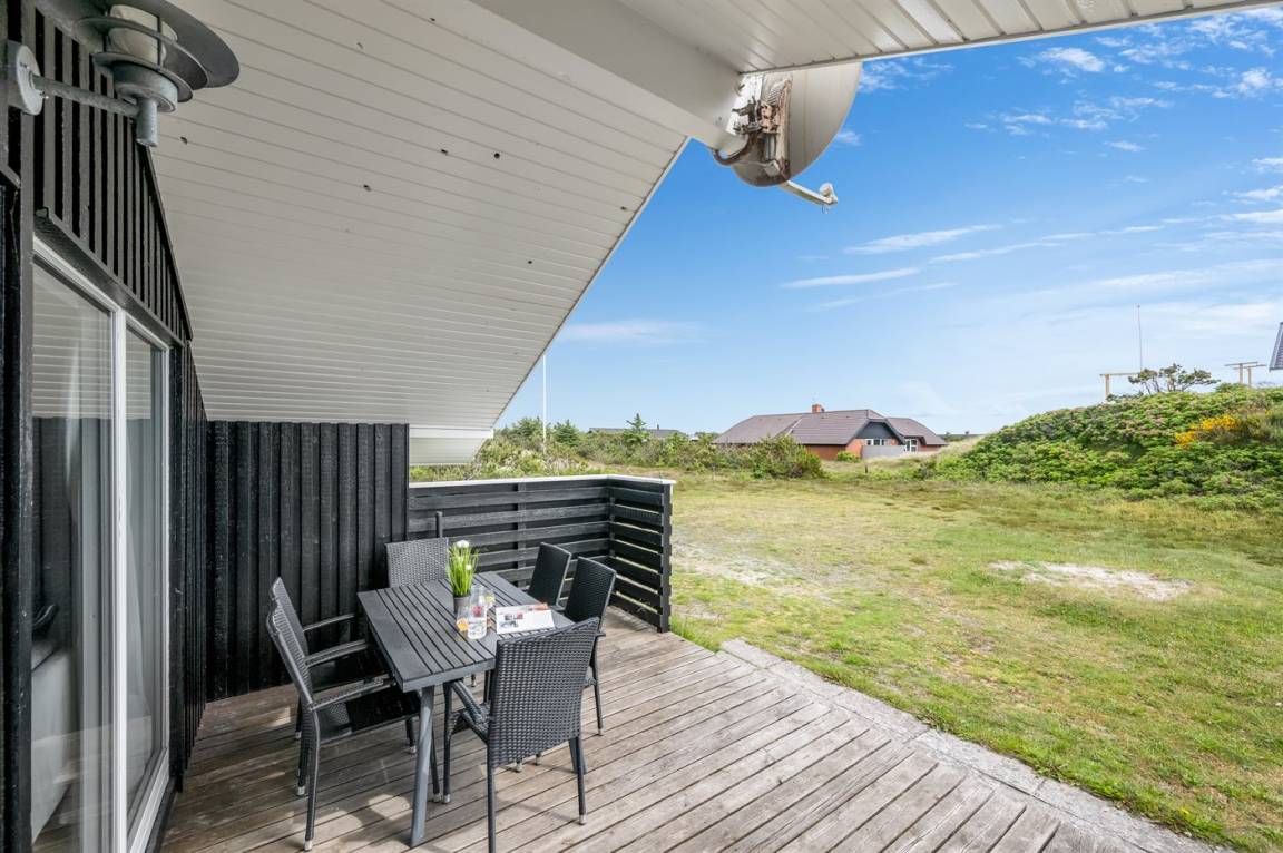 Auf einem schönen, hügeligen Dünengrundstück nur 200 m vom Meer entfernt liegt dieses schöne und gepflegte Ferienhaus aus Holz, 1985 gebaut und 2008 modernisiert. Offenes und überdachtes Terrassenareal mit diversen Gartenmöbeln und gutem Windschutz. Holzdecken und -wände, Teppichböden überall - jedoch PVC-boden in der Küche. Badezimmer mit Duschnische und Fußbodenheizung. Die Küche ist mit u. a. Geschirrspüler, Mikrowelle und Kühlschrank mit Gefrierfach ausgestattet. Gemütliches Wohnzimmer mit Kaminofen und Flatscreen-TV mit digitalem Satellitenanschluss. 3 Zimmer; 1 mit Doppelbett, 1 mit 2 Einzelbetten und 1 mit Etagenbett. Ferner stehen Waschmaschine sowie Wäschetrockner zur Verfügung und es ist eine energiegerechte Wärmepumpe installiert. Für die Kinder gibt es Sandkasten, Schaukel, Kinderbett und Kinderhochstuhl. Ein Ferienhaus mit einer guten Lage.