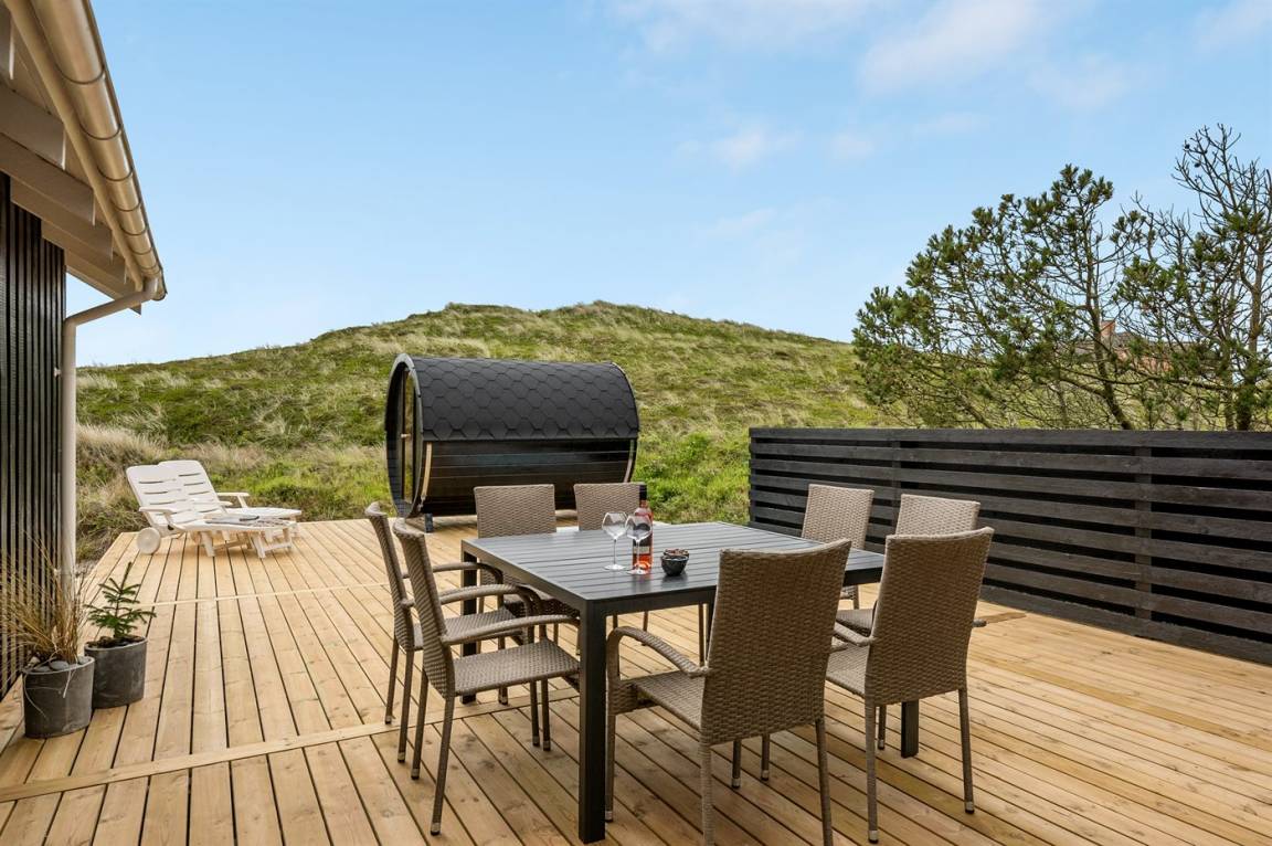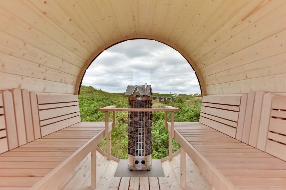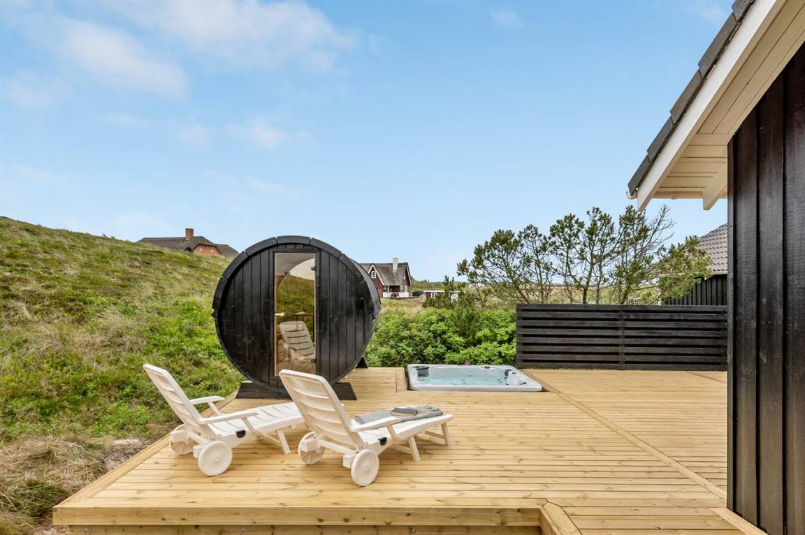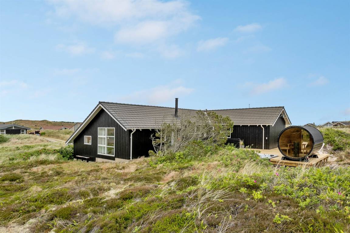DraußenDie Ferienunterkunft liegt auf einem 4185 m² großen Dünengrundstück. Die Entfernung zum Meer beträgt 400 m. Die Entfernung zum Fjord beträgt 5000 m. Die nächste Einkaufsmöglichkeit liegt 3800 m entfernt. Es steht ein 120 m² Terrassenareal zur Verfügung. Geräteraum. Die Entfernung zu einem Spielplatz beträgt 3800 m. Außensauna. Parkplatz auf dem Grundstück.