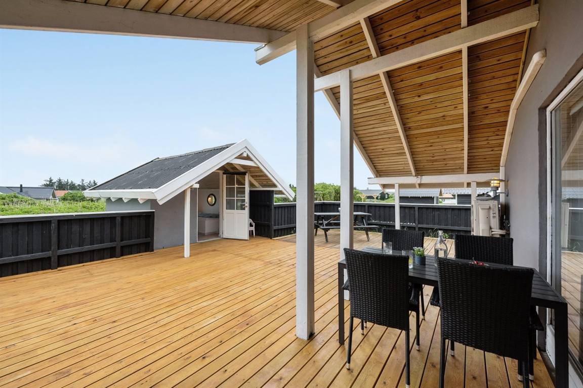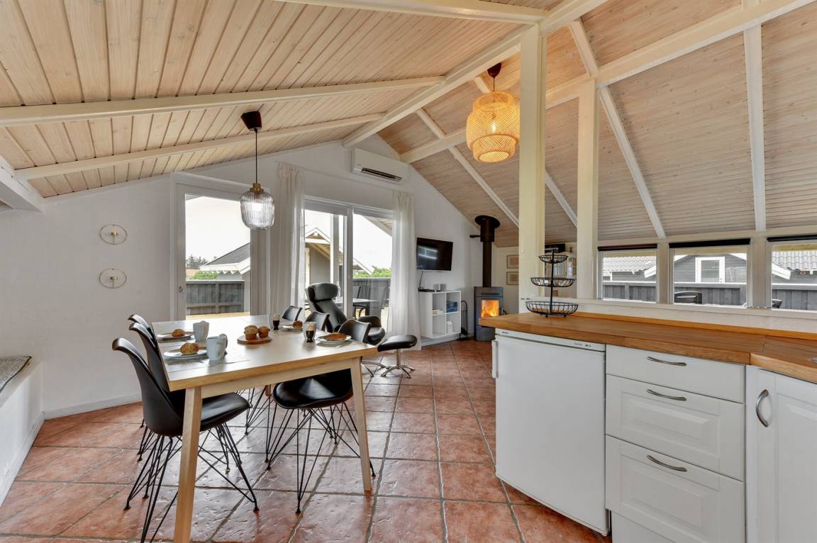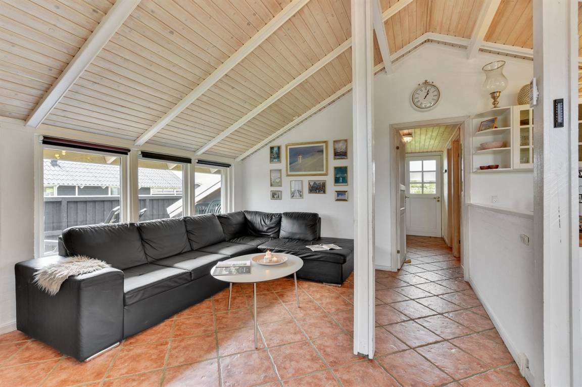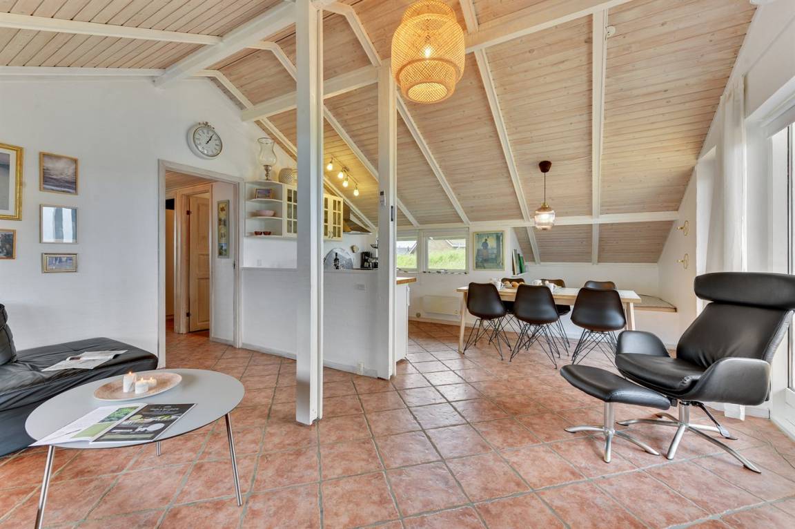 Schönes, gepflegtes Ferienhaus, laufend renoviert. Vom Haus und Grundstück Aussicht über Ringkøbing Fjord. 2 große Schlafzimmer, beide mit Doppelbett im Alkoven. Außerdem 2 Schlafplätze im Alkoven im Wohnzimmer und 2 Schlafplätze im Gästehaus.
