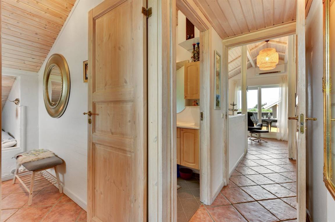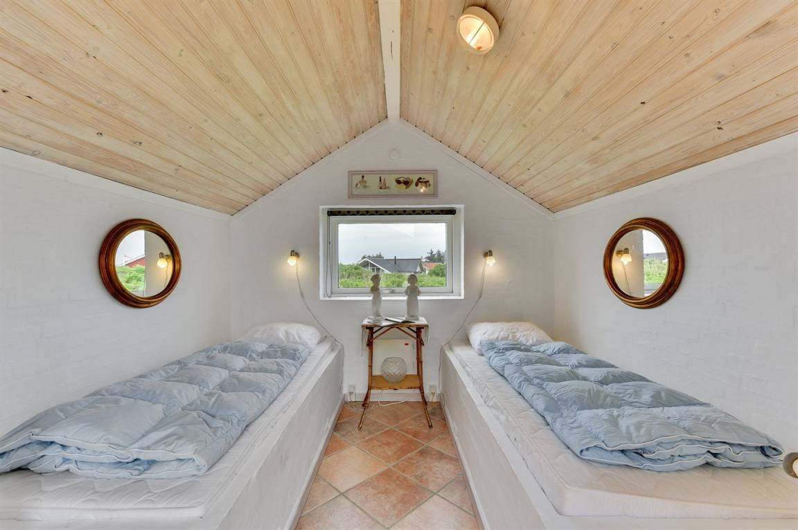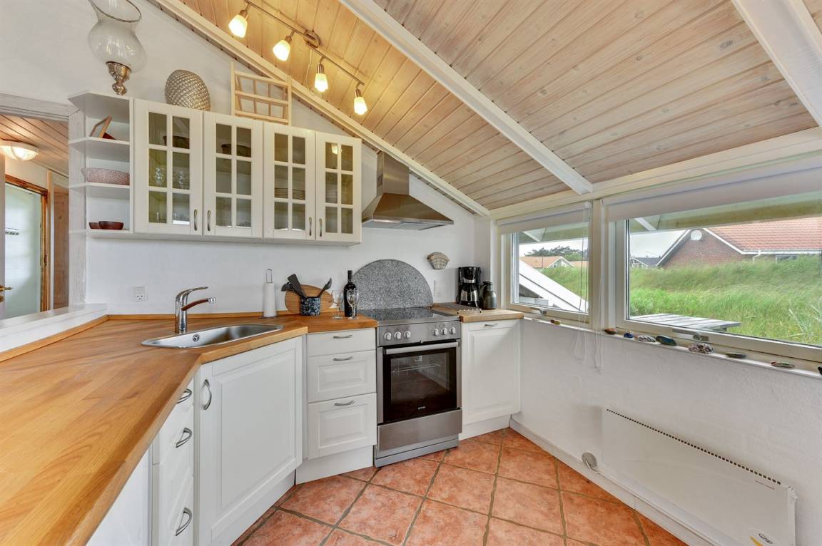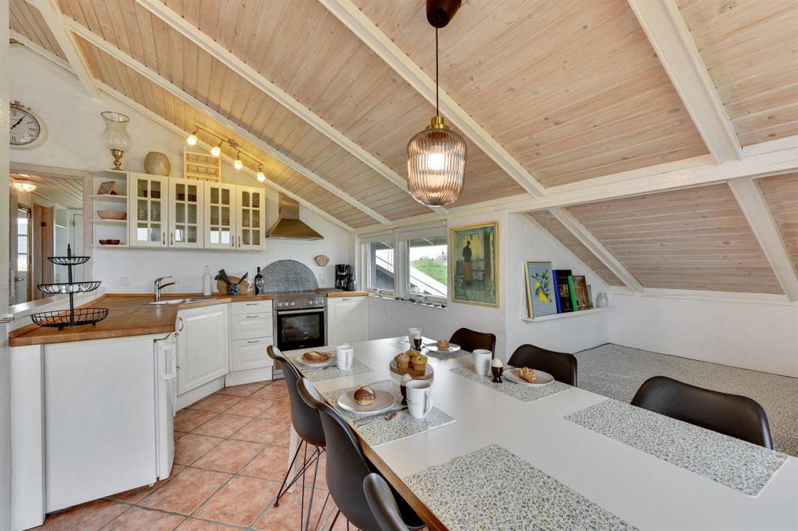 Schönes, gepflegtes Ferienhaus, laufend renoviert. Vom Haus und Grundstück Aussicht über Ringkøbing Fjord. 2 große Schlafzimmer, beide mit Doppelbett im Alkoven. Außerdem 2 Schlafplätze im Alkoven im Wohnzimmer und 2 Schlafplätze im Gästehaus.