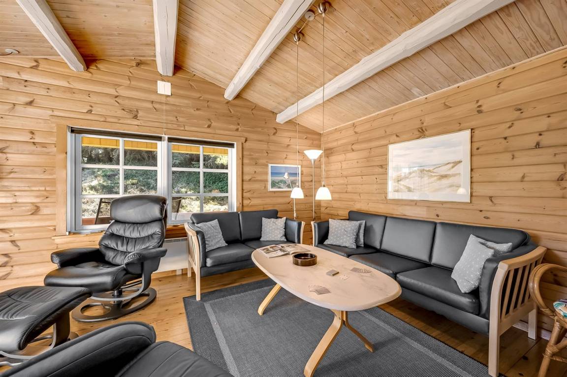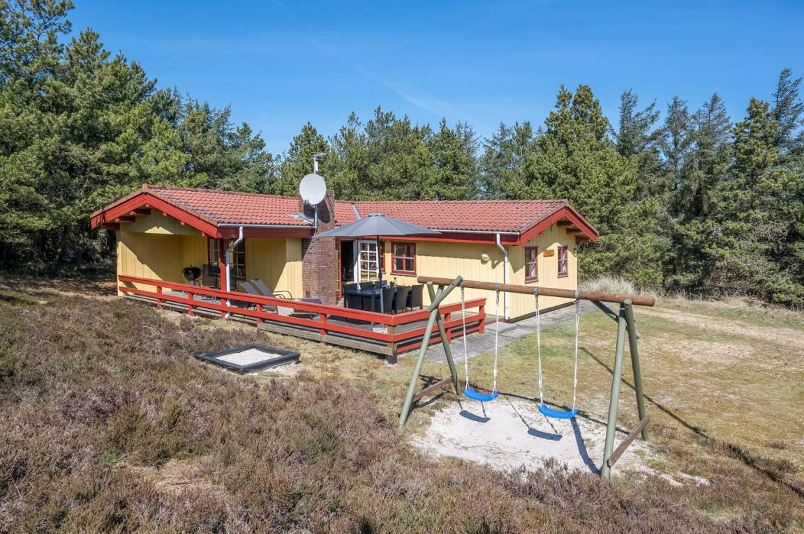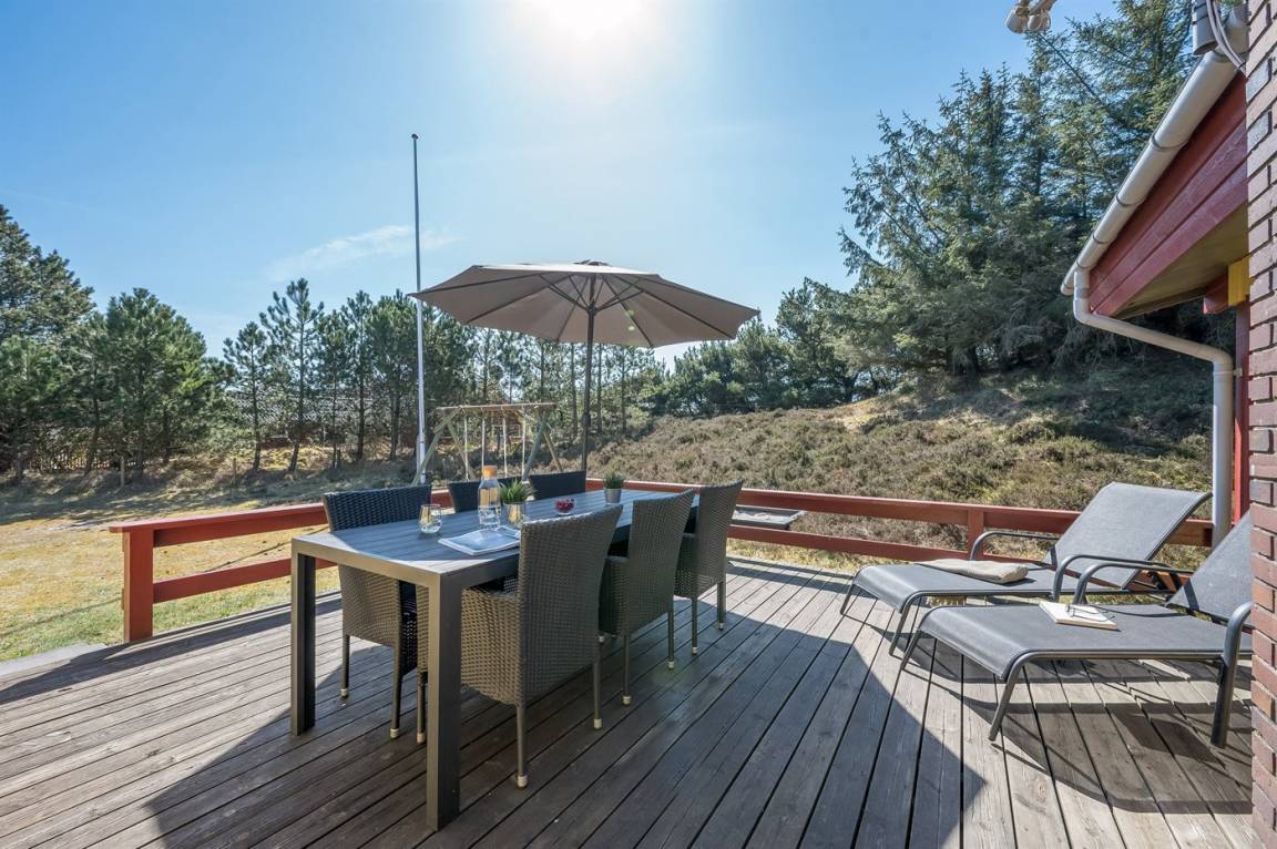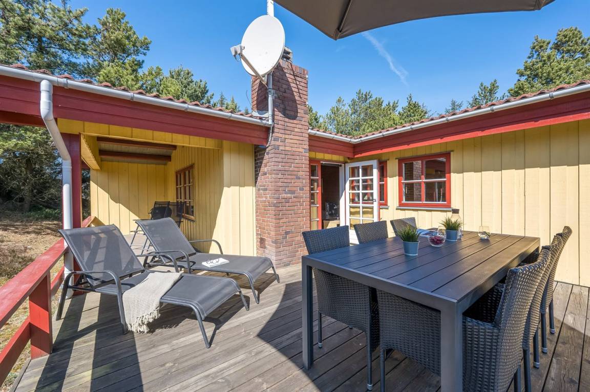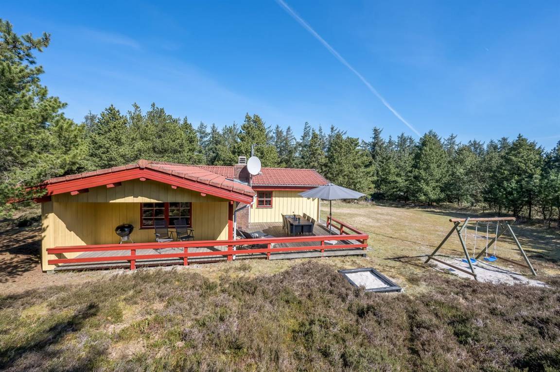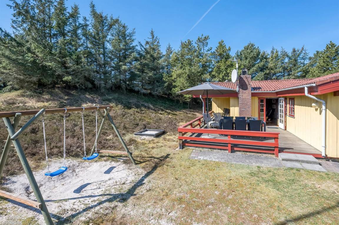 Dieses nette und gemütlich eingerichtete Ferienhaus liegt auf einem großen, von Büschen und Bäumen umgebenen und mit Heidekraut bewachsenen Naturgrundstück mit gutem Windschutz - nur wenige Minuten Gang vom kilometerlangen Sandstrand mit dem feinsten weißen Sand entfernt. Zum Haus gehören sowohl eine offene als auch eine überdachte Terrasse mit Gartenmöbeln. Auf dem Grundstück gibt es auch Sandkasten und Schaukel für die kleinen Feriengäste. Die geräumige Küche ist mit dem Ess-/Wohnzimmer kombiniert und u. a. mit Geschirrspüler, Mikrowelle, kleinem Tiefkühlgerät, Umluftofen und Herd mit Ceran-Feld ausgestattet. Das Ess-/Wohnzimmer, mit direktem Zutritt zu der offenen Terrasse, ist mit Kaminofen, TV mit digitalem Satellitenanschluss und Stereoanlage eingerichtet. Im Haus gibt es 3 Schlafzimmer; 2 mit Doppelbett und 1 mit Etagenbett. Badezimmer mit Fußbodenheizung und Duschnische. Ferner stehen kostenlose, kabellose Internetverbindung (eigener Computer muss mitgebracht werden), Waschmaschine, Wäschetrockner, Kinderbett sowie Kinderhochstuhl zur Verfügung. Es ist eine energiegerechte Wärmepumpe installiert. Ein schönes Ferienhaus an der Nordküste - die mit ihren Stränden, Dünen und der hübschen jütländischen Natur ein idealer Ausgangspunkt für gute Urlaubserlebnisse ist. Besuchen Sie Hvide Sande und sehen Sie die Schleuse, "Fiskeriets Hus" (das Haus der Fischerei) und den tätigen Fischereihafen. Nur eine Stunde Fahrt vom Haus entfernt finden Sie Legoland und Givskud Zoo.