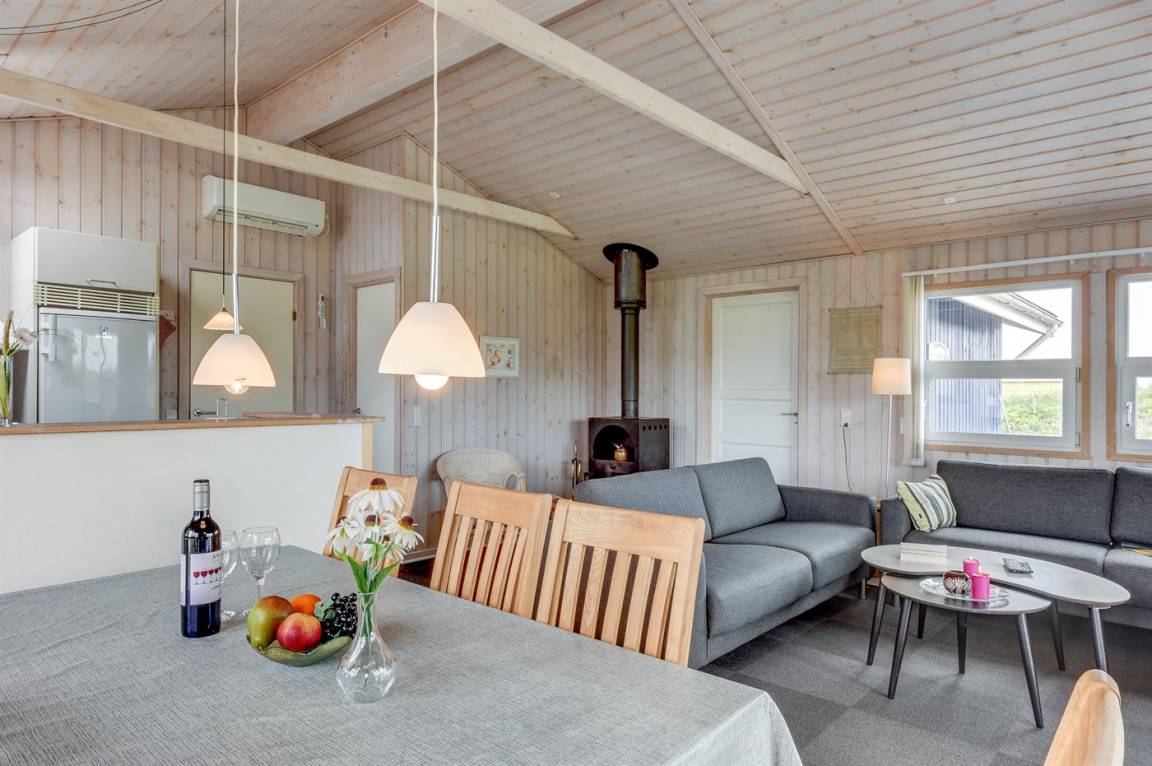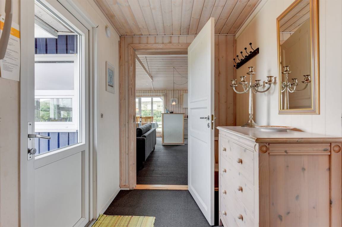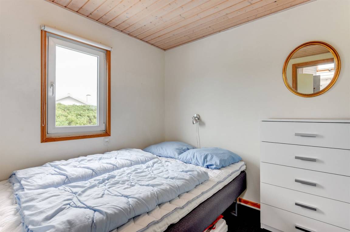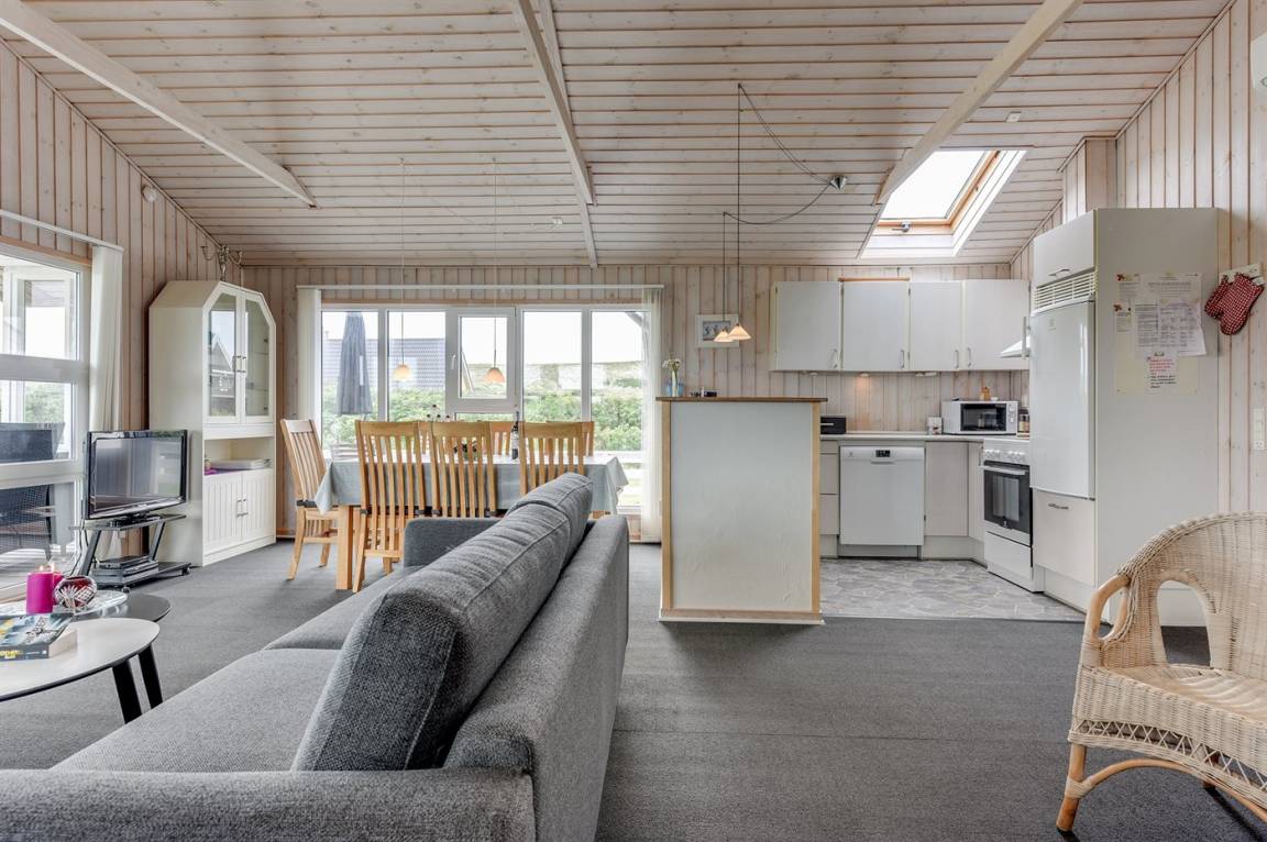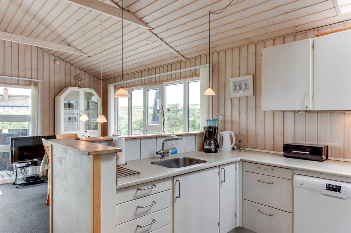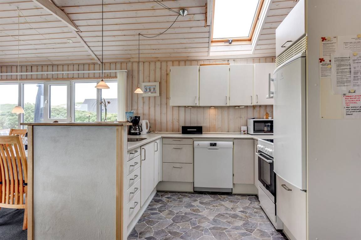 Auf einem großen Naturgrundstück nur 150 m von der Nordsee entfernt liegt dieses Ferienhaus aus Holz, 1975 gebaut, 2003 völlig renoviert und seitdem laufend gepflegt. Zum Haus gehören sowohl überdachte als auch offene, nach Süden gerichtete Terrasse mit Gartenmöbeln. Innen sind die Böden mit Teppich ausgelegt, jedoch PVC-Boden in der Küche. Die Wände und Decken sind mit hellem, rustikalem Holz verkleidet. Badezimmer mit Duschnische und Zutritt zu einem separaten Raum mit 2-Pers. Whirlpool und Zutritt zur Sauna. Die schöne Küche ist u. a. mit Mikrowelle, Umluftofen und Geschirrspüler ausgestattet. Das helle Wohnzimmer enthält Kaminofen, DVD-Spieler, TV mit digitalem Satellitenanschluss, Video sowie Stereoanlage mit CD-Spieler. Die Schlafplätze verteilen sich auf 2 Zimmer mit Doppelbett und 1 Zimmer mit 2 Einzelbetten. Ferner stehen kostenlose, kabellose Internetverbindung (Computer ist mitzubringen), Waschmaschine sowie Wäschetrockner zur Verfügung und es ist eine energiegerechte Wärmepumpe installiert. Für die kleinen Feriengäste gibt es Sandkasten und Schaukel auf dem Grundstück. Nicht weit vom Haus entfernt gibt es einen Put & Take Angelsee und ein Fahrradweg durch das Dünengebiet, der sich von Nymindegab bis nach Søndervig erstreckt. Ein schönes Ferienhaus mit einer guten Lage zu jeder Jahreszeit.