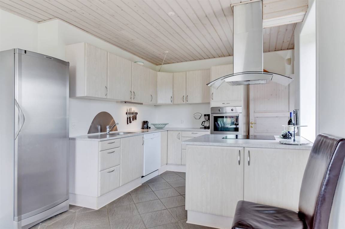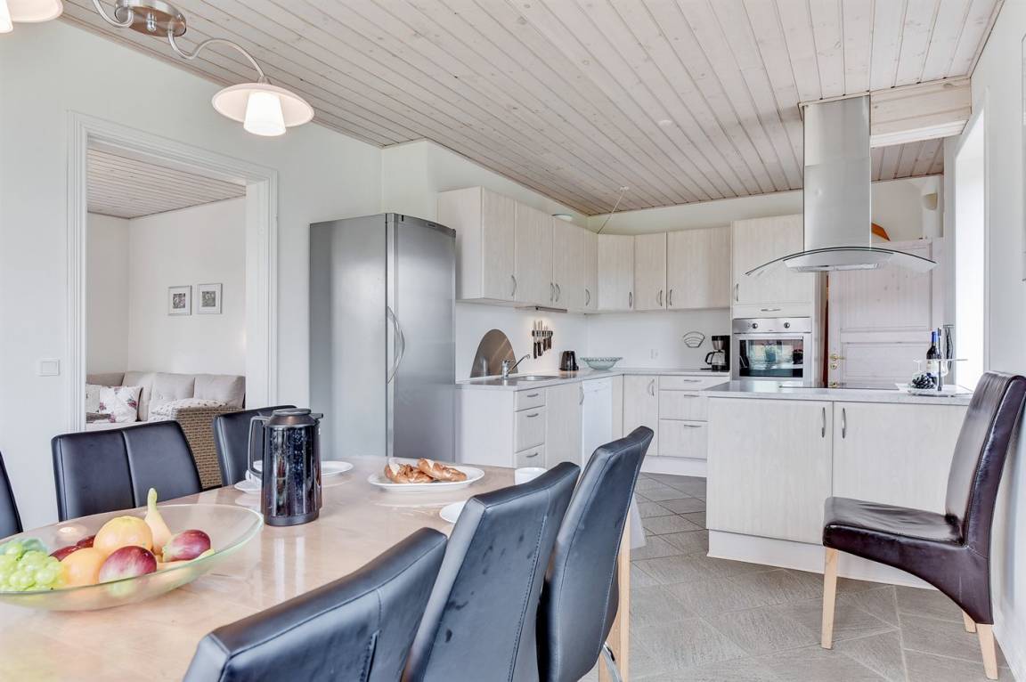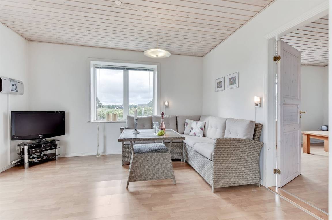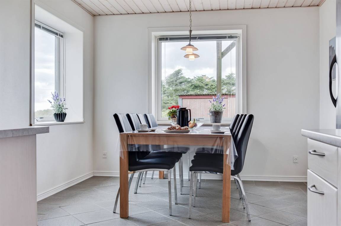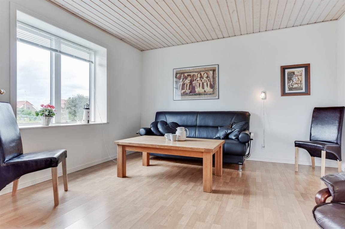 Das Haus ist aus Stein in 2 Etagen gebaut und 2007 total renoviert. Es liegt auf einem schönen Naturgrundstück, wo es von sowohl dem Grundstück als auch vom großen Terrassenareal einen schönen Blick über Ringkøbing Fjord gibt. Innen gibt es überall beheizbare Klinkerböden, jedoch Holzböden im Wohnzimmer und in den Schlafzimmern. 2 schöne Badezimmer mit Fußbodenheizung und Duschnische. Im großen Badezimmer gibt es darüber hinaus einen 2-Pers. -Whirlpool und direkten Zugang zur Sauna (maximale Temperatur 60-70 Grad). Großer Flur mit Waschmaschine, Wäschetrockner und viel Platz am Tisch, die Kleider zu legen. Schöne, große Wohnküche mit guten Möbeln und u. a. Herd mit Ceran-Feld und Umluftofen, Mikrowelle, Geschirrspüler und Tiefkühlgerät. Helles und freundliches Wohnzimmer mit Doppelschlafcouch, Sofatisch und ein paar Stühlen, eine gute Stelle für Gemütlichkeit und Beisammensein. Schönes Obergeschoss mit 3 große Schlafzimmer, alle mit Doppelbett. Vom einen Schlafzimmer gibt es Ausgang zu einem kleinen Balkon, wo Sie den schönen Blick über Ringkøbing Fjord genießen können. Im Obergeschoss gibt es weiterhin ein paar Stühle, wo Sie sich entspannen oder ein gutes Buch lesen können. Für die kleinen Feriengäste sind Kinderbett und Kinderhochstuhl vorhanden. Kostenlose, kabellose Internetverbindung (eigener Computer ist mitzubringen).