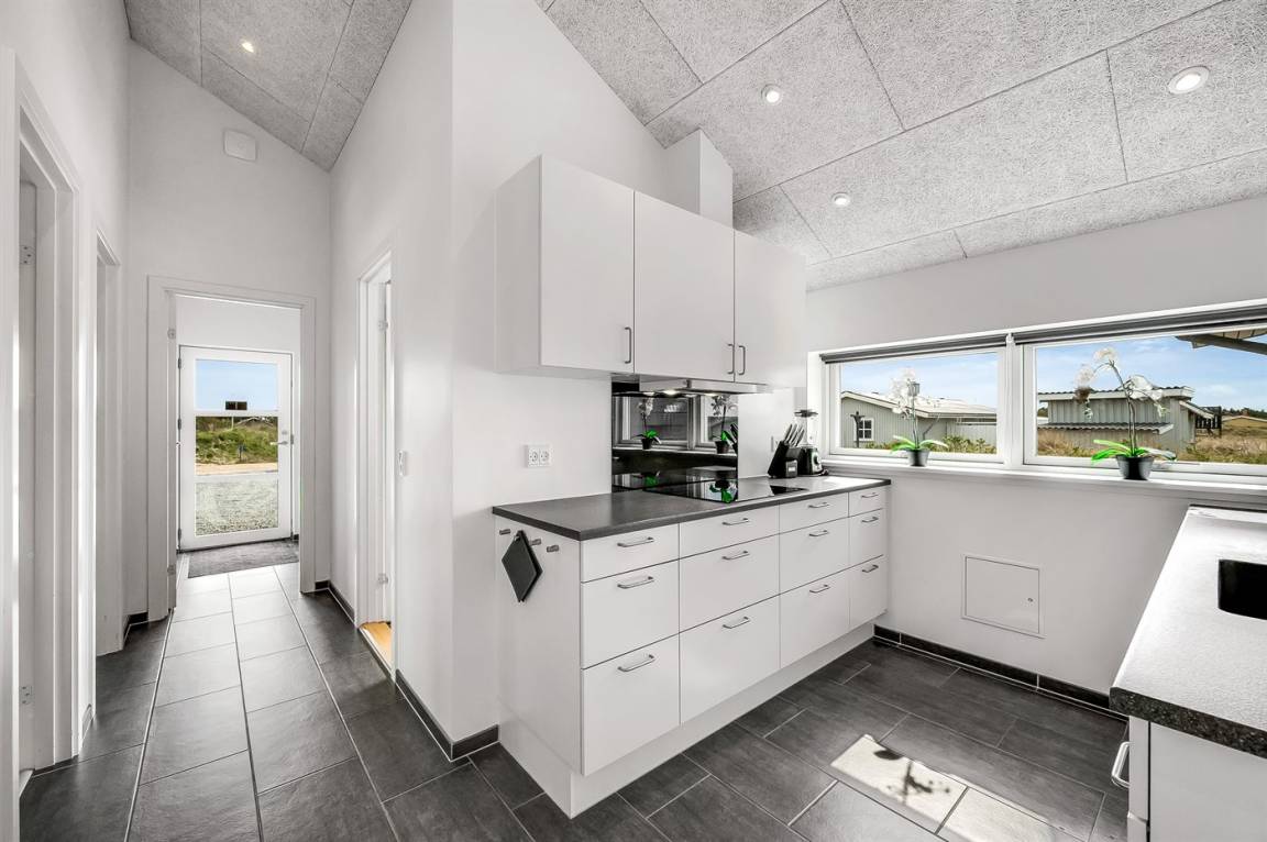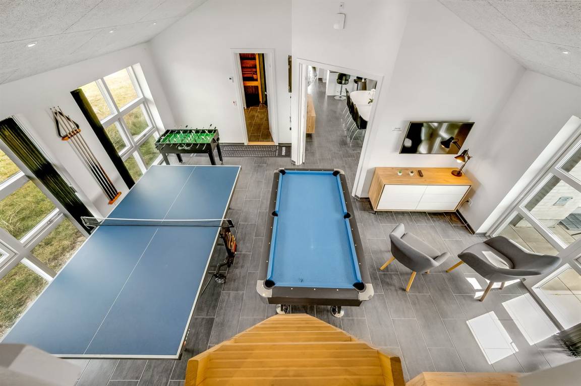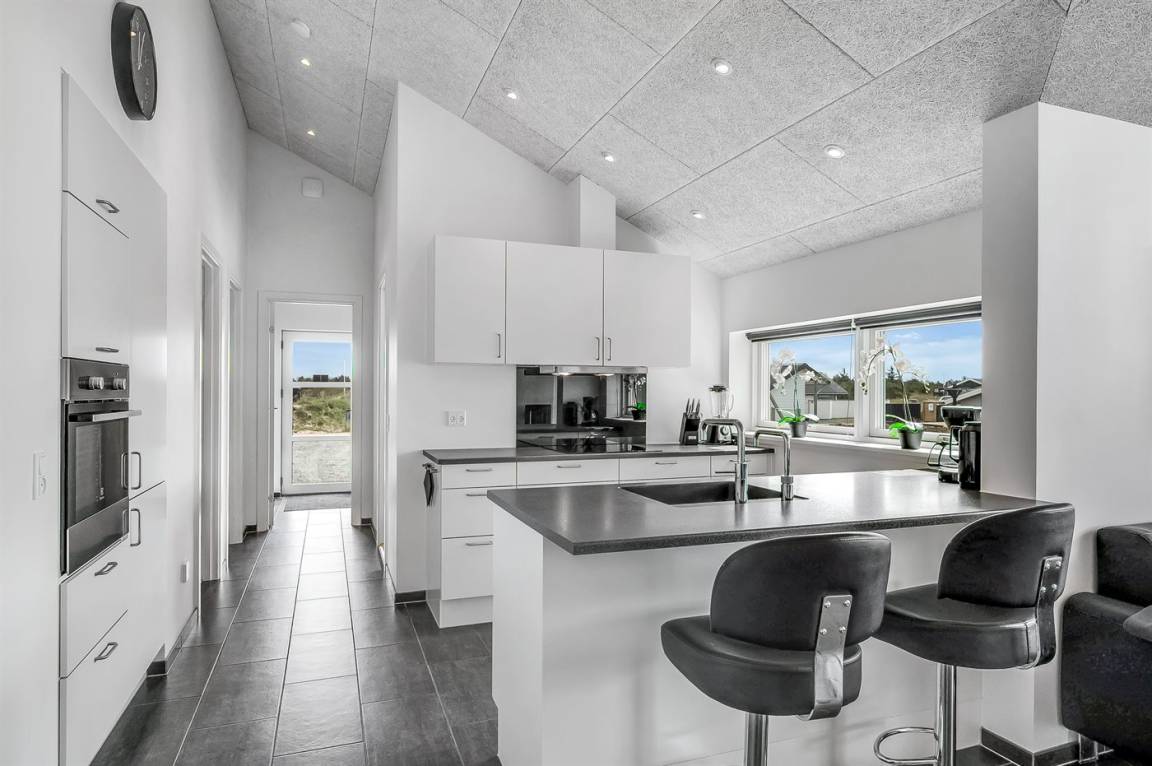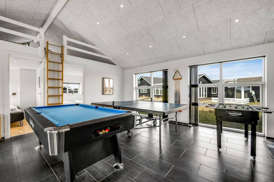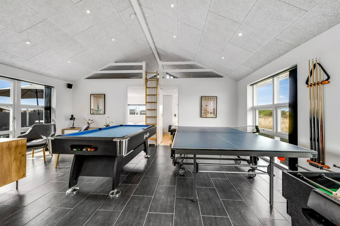 Ein herrliches, neu erbautes Ferienhaus mit einer zentralen Lage in Bjerregaard. Hier können Sie es sich gemütlich machen und gleichzeitig den Luxus genießen, den nur ein neu erbautes Ferienhaus anzubieten hat. Im Hobbyraum können sich die Kinder hinter geschlossenen Türen mit einem Spiel Tischfußball Vergnügen, während es sich die Erwachsenen im schönen Wohnzimmer mit einem Glas Wein gemütlich machen. Das Haus liegt nicht weit von der Nordsee entfernt – und hat diese ganze besondere Atmosphäre – die man nur in einem Ferienhaus, das dicht an der Küste liegt spürt. Für diejenigen, die den aktiven Urlaub bevorzugen gibt es gute Rad- und Wanderwege z. B. kann man von Bjerregard aus entweder zu Fuß oder mit dem Rad entlang der Landzunge Holmsland Klit, auf sich durch Dünen und Ferienhausgebiete schlängelnde Wege, bis nach Söndervig gelangen.