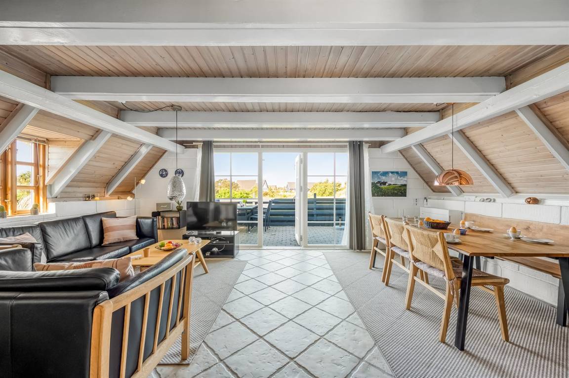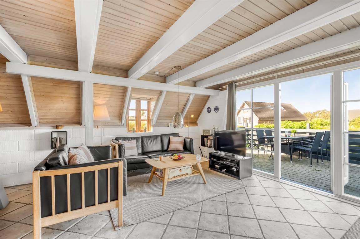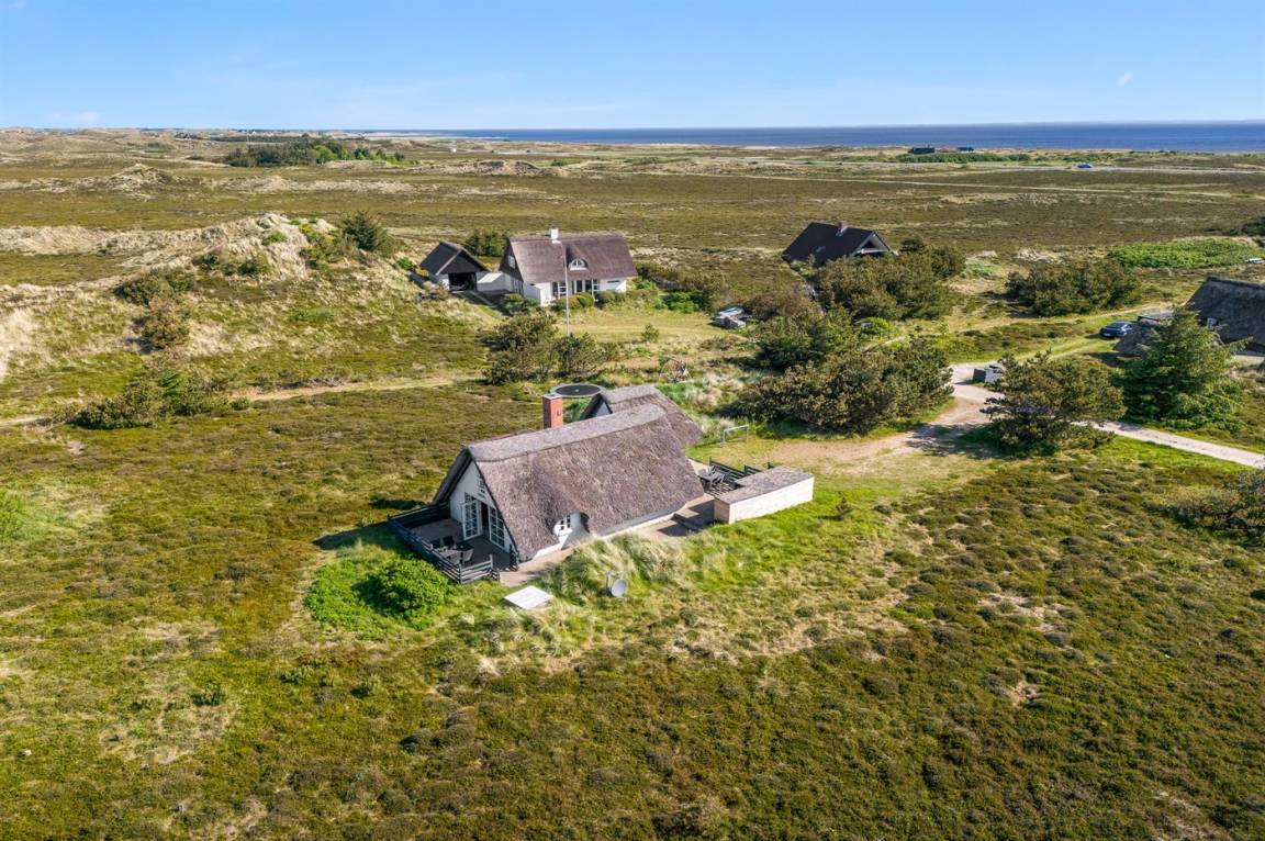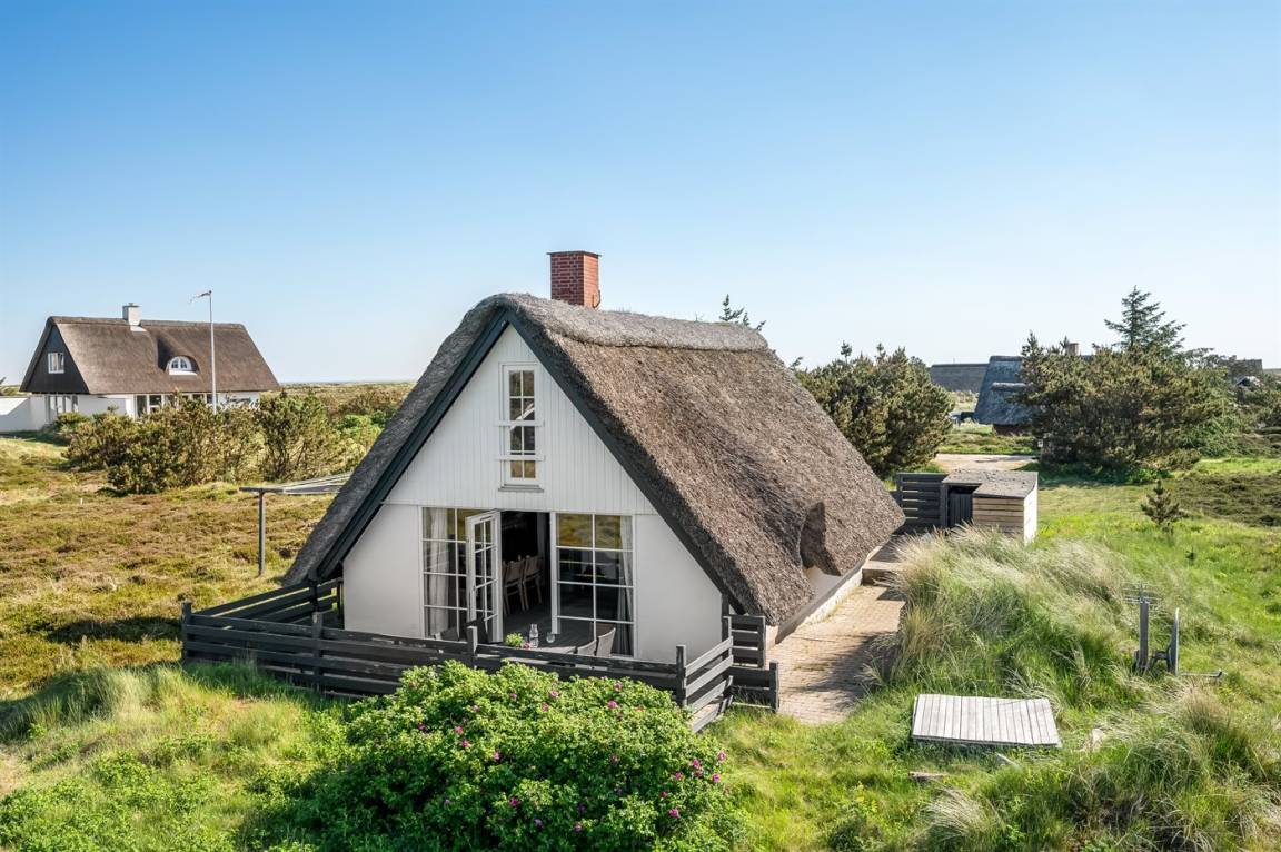 Das Herzstück des schönen Reetdachferienhauses ist der Aufenthaltsraum, der zu Brettspielen vor dem knisternden Kaminfeuer, zum Entspannen auf dem Sofa mit einem guten Buch oder einfach nur zum Genießen der Aussicht auf die schöne Dünenlandschaft durch die großen Fensterfronten einlädt.