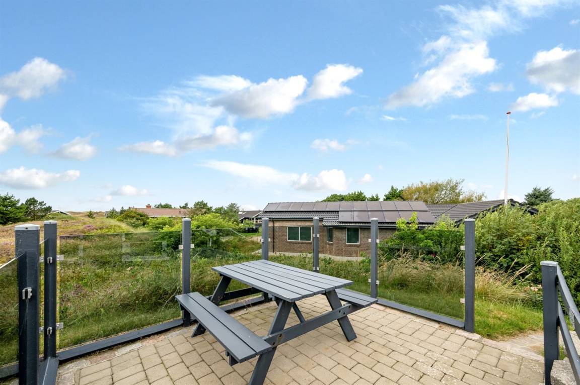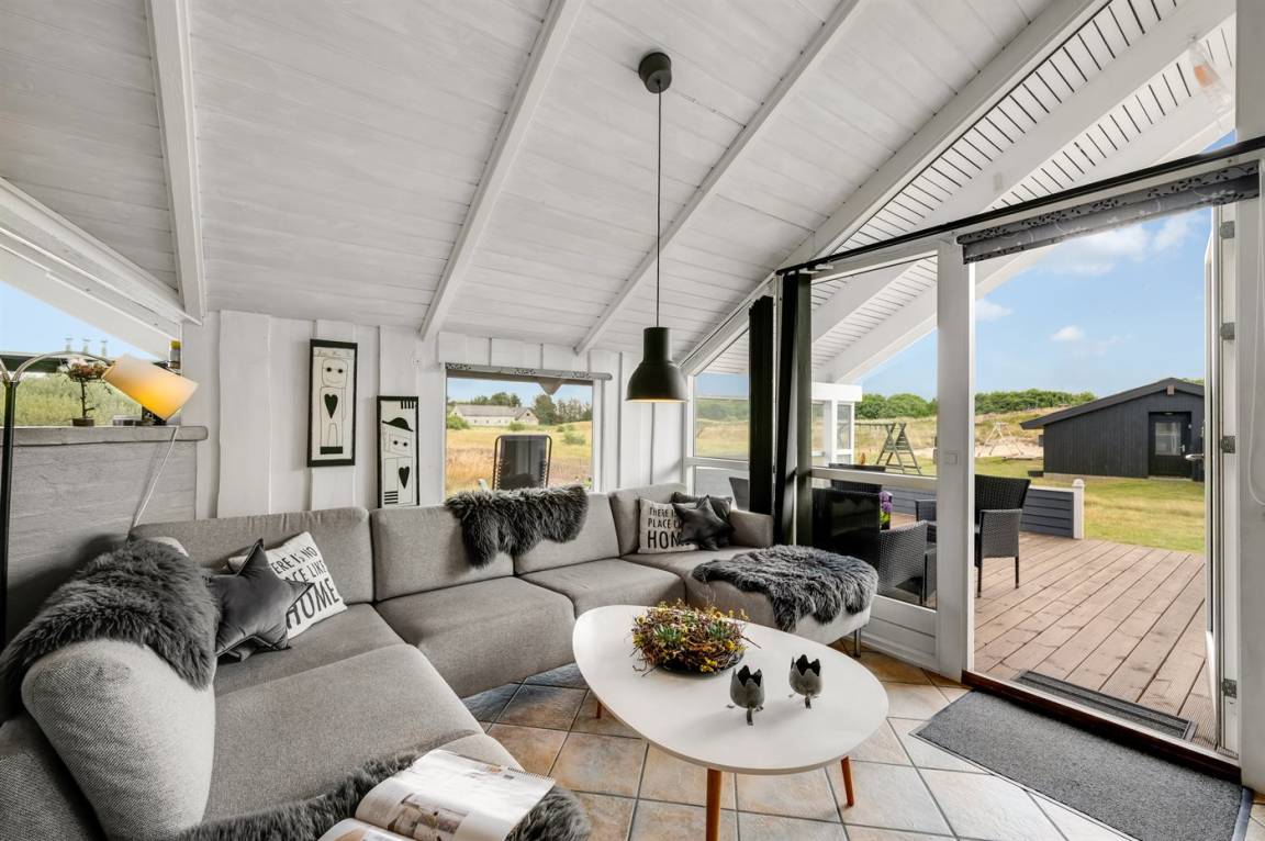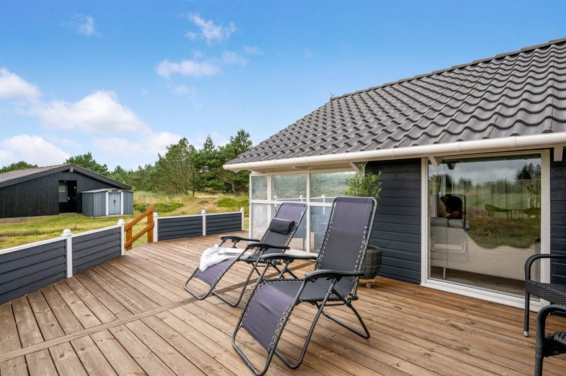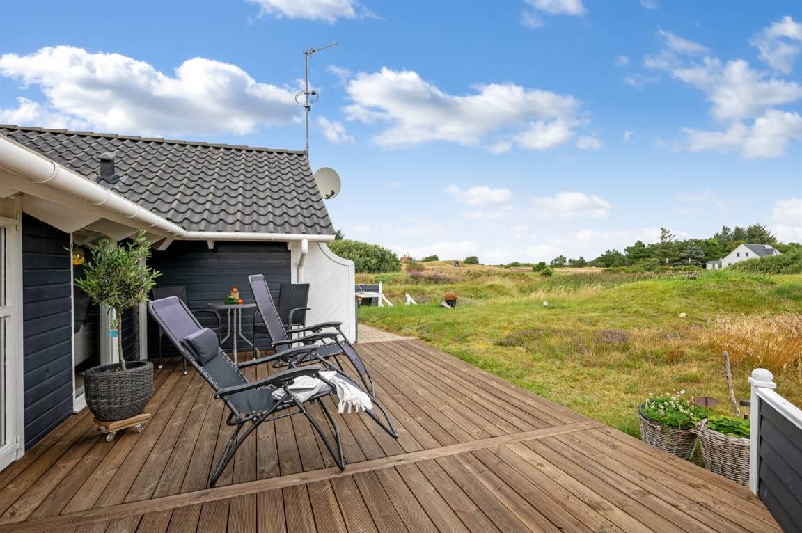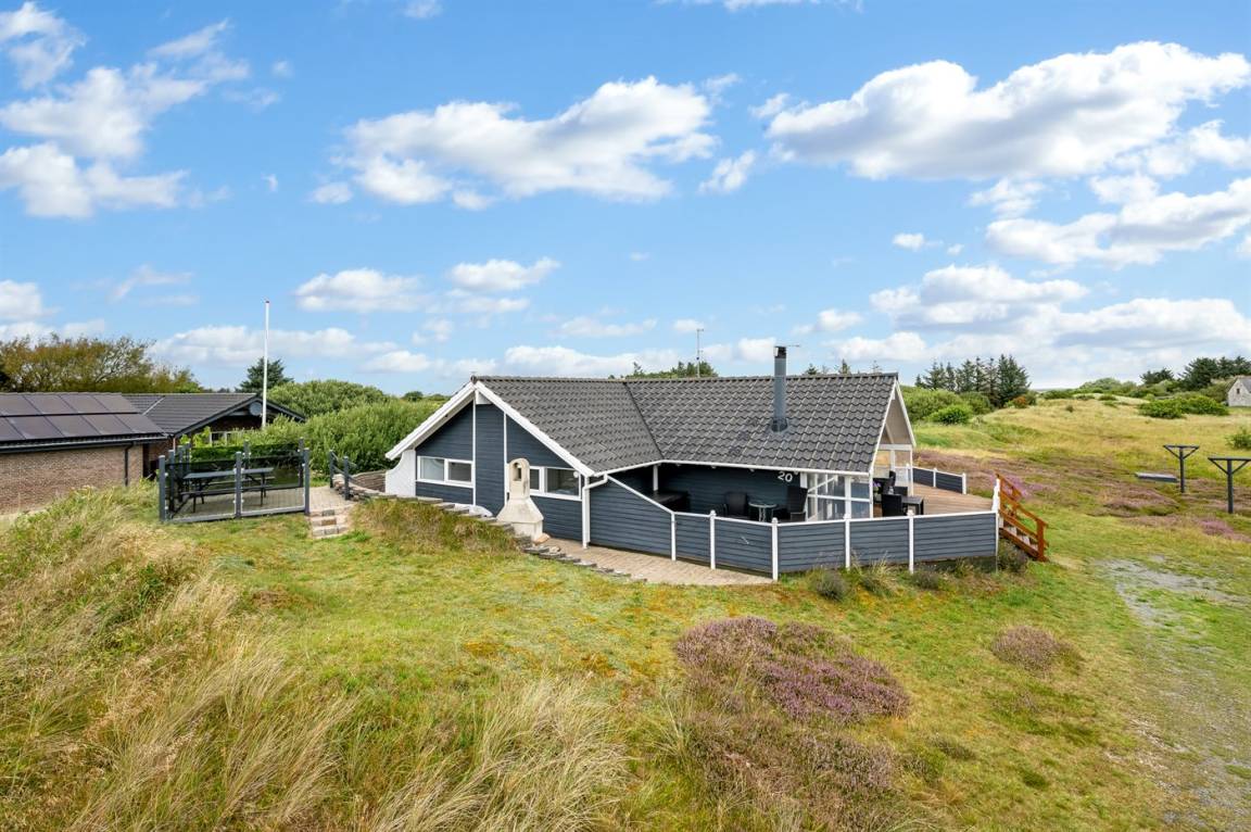 DraußenDie Ferienunterkunft liegt auf einem 3970 m² großen Dünengrundstück. Die Entfernung zum Meer beträgt 1000 m. Die Entfernung zum Fjord beträgt 250 m. Die nächste Einkaufsmöglichkeit liegt 600 m entfernt. Es steht ein 60 m² Terrassenareal zur Verfügung. Außerdem gibt es 11 m² überdachte Terrasse. Geräteraum. Schaukel. Sandkasten.An Sommerabenden sorgt der Außenkamin für eine gemütliche Atmosphäre. Es steht ein Grill zur Verfügung. Parkplatz auf dem Grundstück.