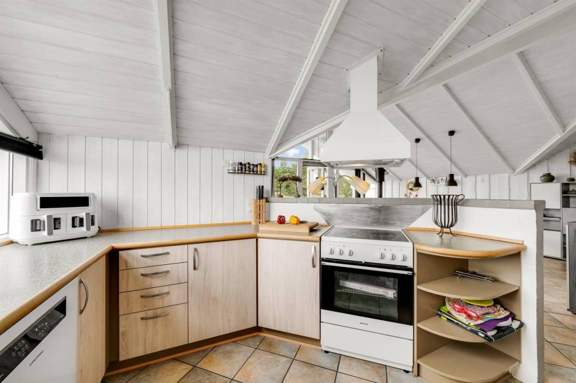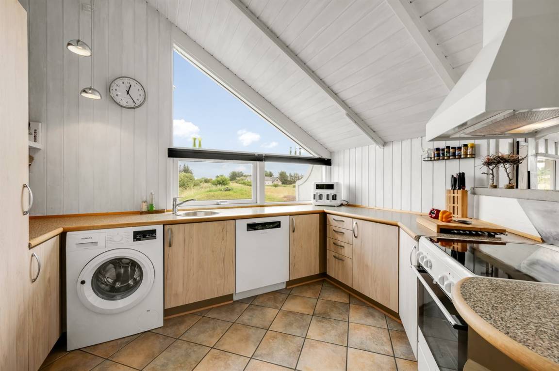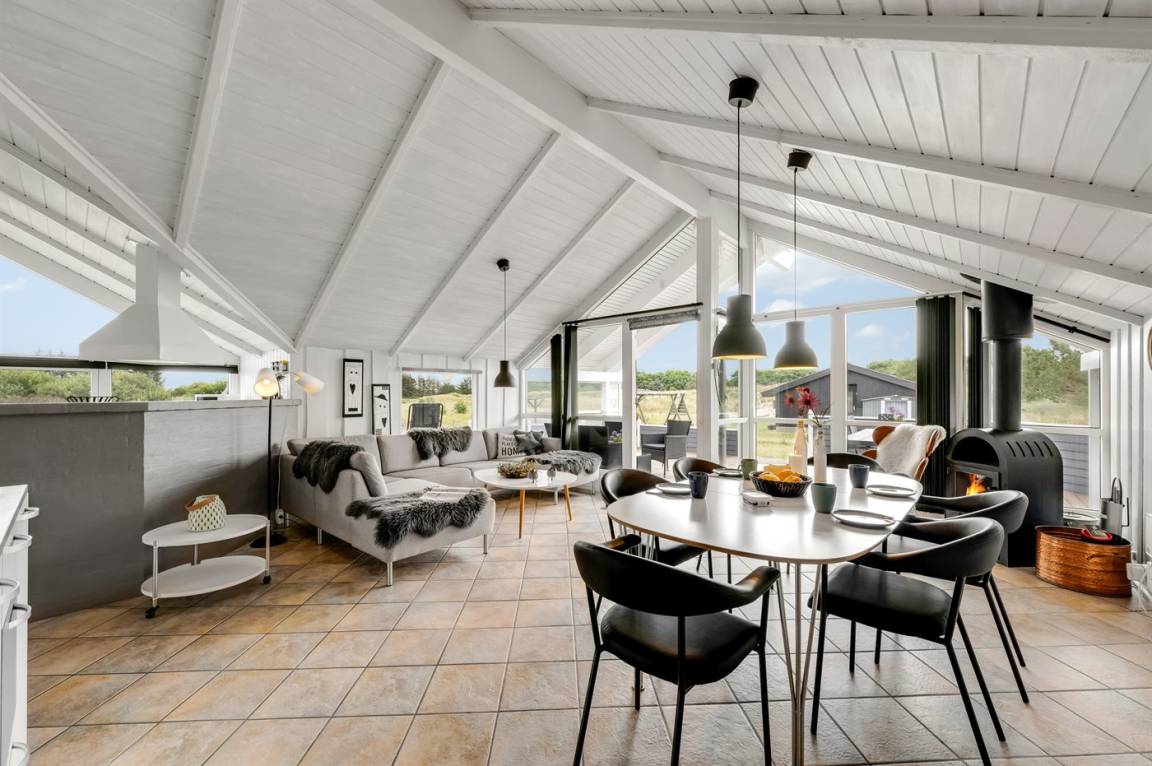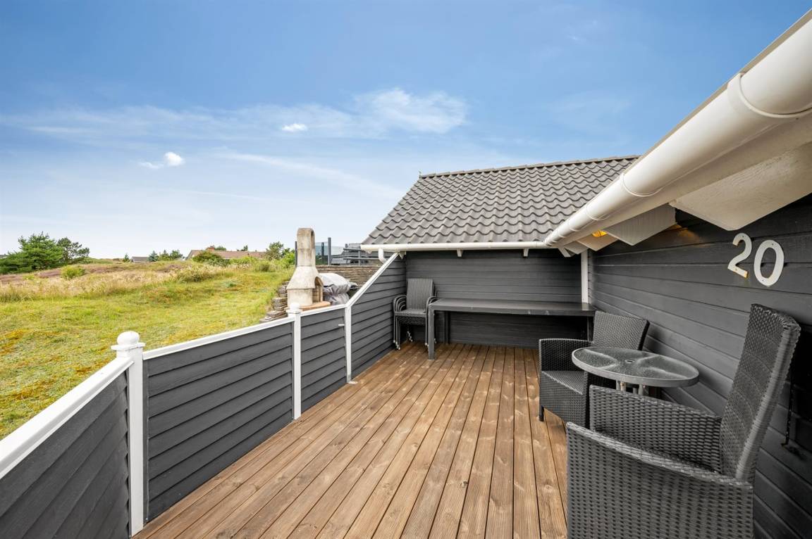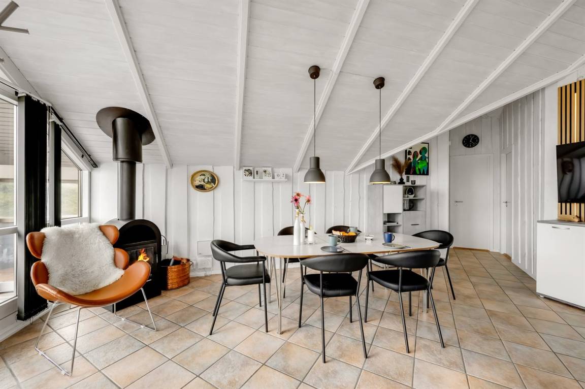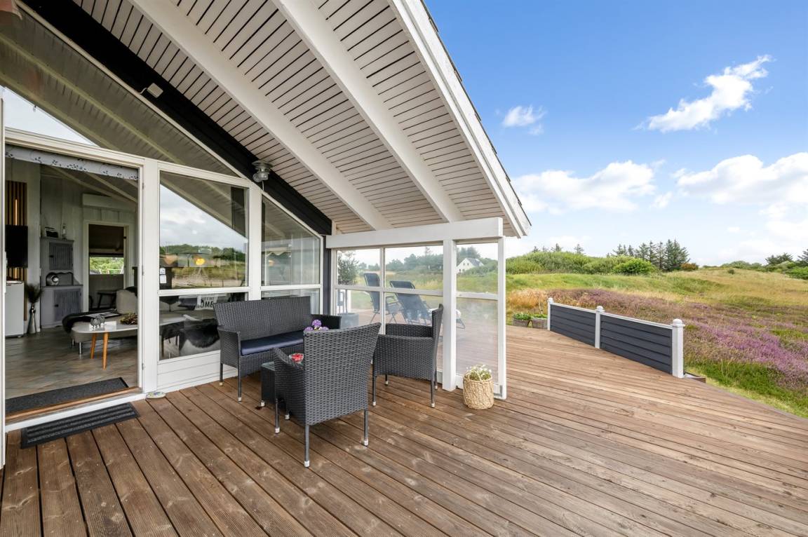 DraußenDie Ferienunterkunft liegt auf einem 3970 m² großen Dünengrundstück. Die Entfernung zum Meer beträgt 1000 m. Die Entfernung zum Fjord beträgt 250 m. Die nächste Einkaufsmöglichkeit liegt 600 m entfernt. Es steht ein 60 m² Terrassenareal zur Verfügung. Außerdem gibt es 11 m² überdachte Terrasse. Geräteraum. Schaukel. Sandkasten.An Sommerabenden sorgt der Außenkamin für eine gemütliche Atmosphäre. Es steht ein Grill zur Verfügung. Parkplatz auf dem Grundstück.