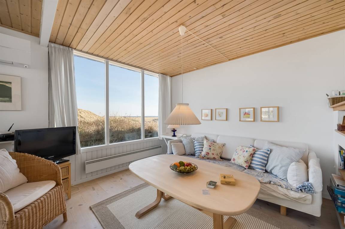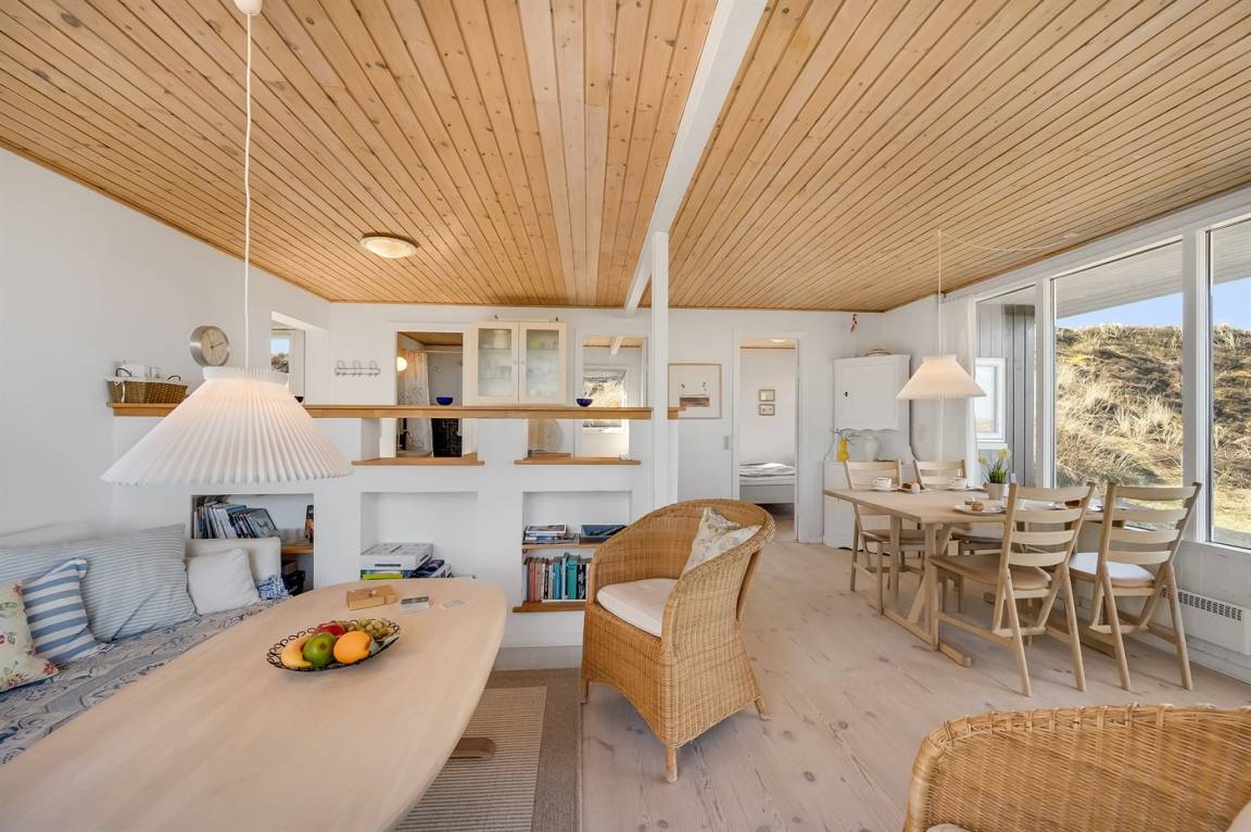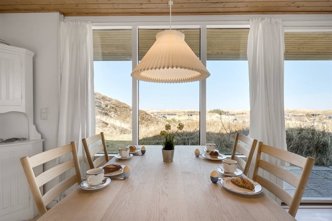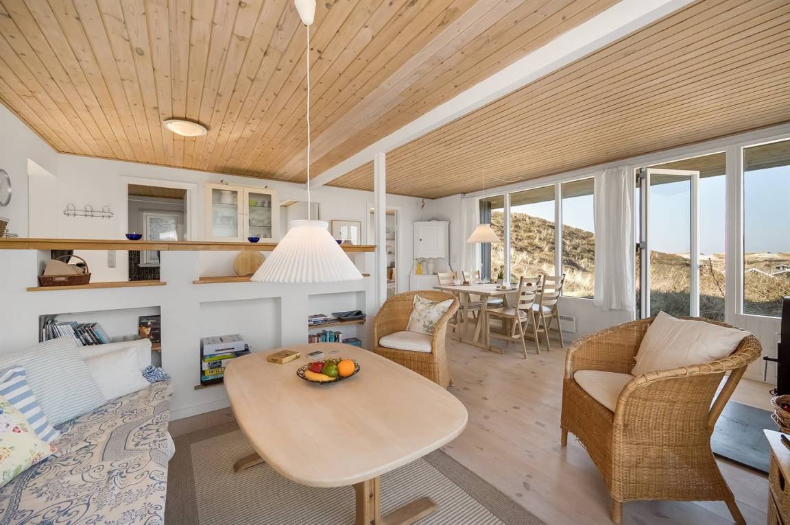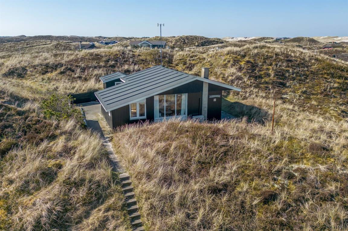 Schönes Ferienhaus auf einem schönen, leicht hügeligen Dünengrundstück - hoch gelegen. Aussicht über den Fjord sowohl vom Haus als auch vom Grundstück. Vom höchsten Punkt des Grundstückes können Sie das Meer ahnen. Zum Haus gehört ein offenes, ungestörtes Terrassenareal.