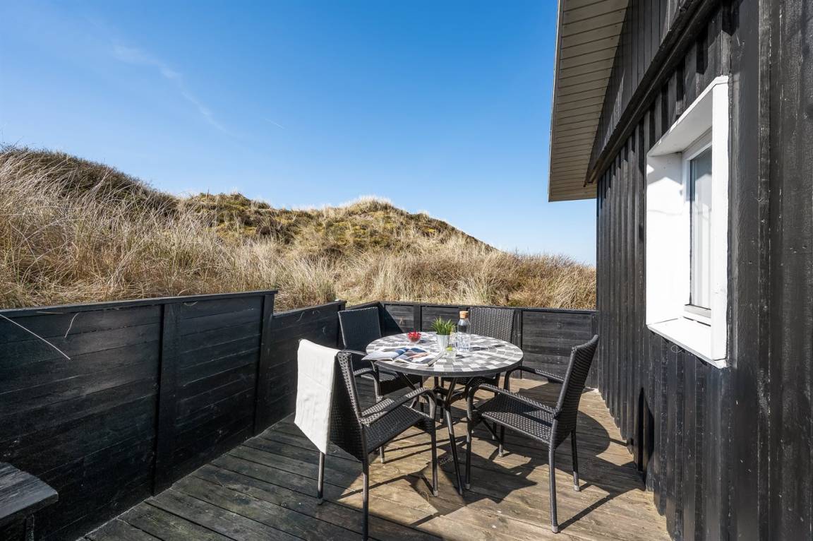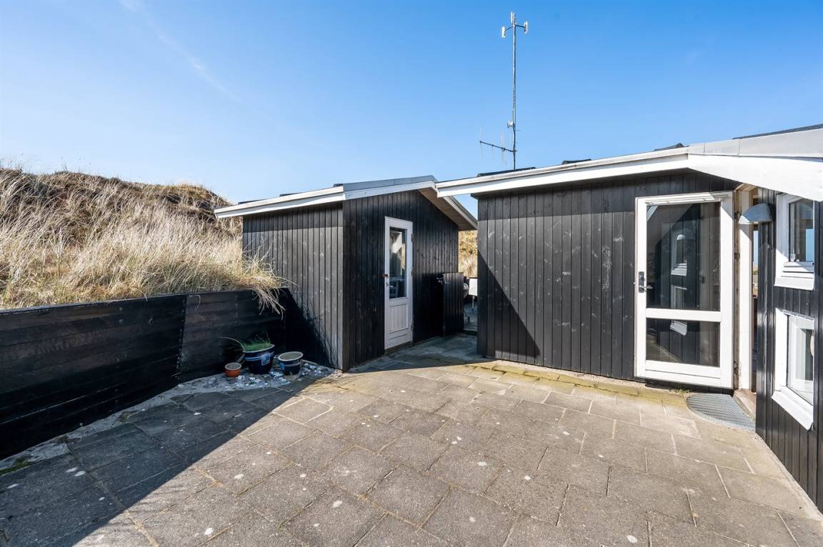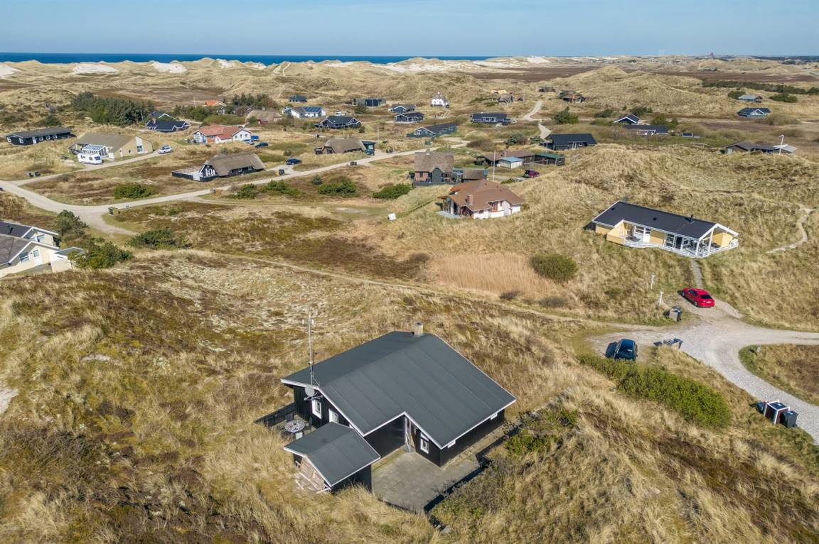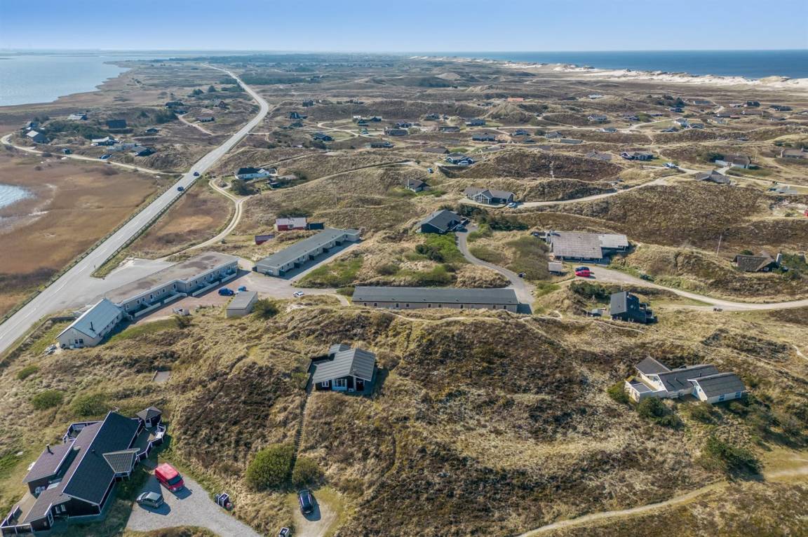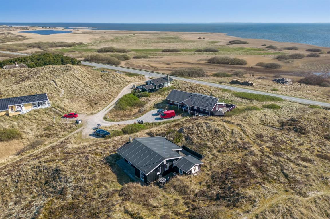 DraußenDie Ferienunterkunft liegt auf einem 2500 m² großen Dünengrundstück. Die Entfernung zum Meer beträgt 800 m. Die Entfernung zum Fjord beträgt 200 m. Die nächste Einkaufsmöglichkeit liegt 1960 m entfernt. Es steht ein 45 m² Terrassenareal zur Verfügung. Geräteraum. Parkplatz auf dem Grundstück.