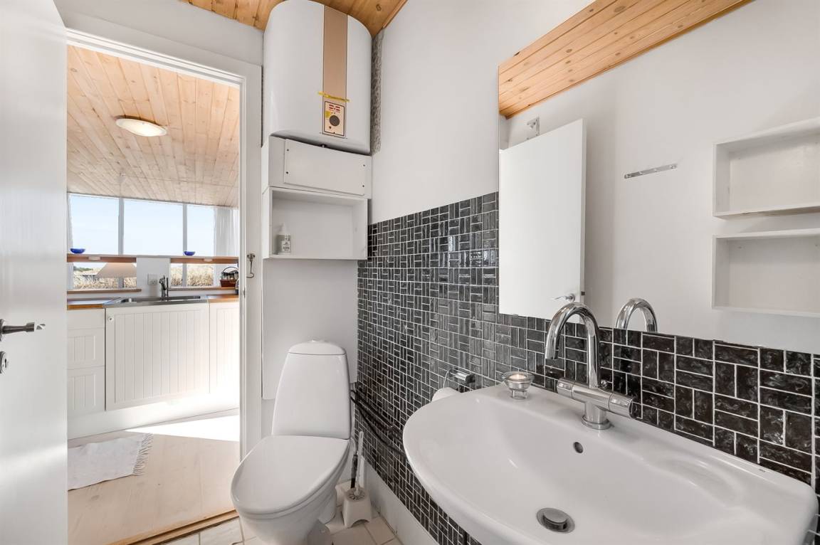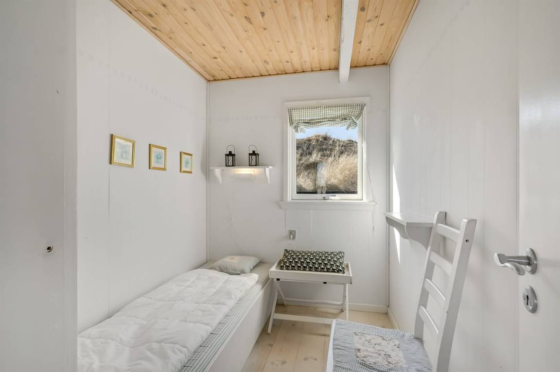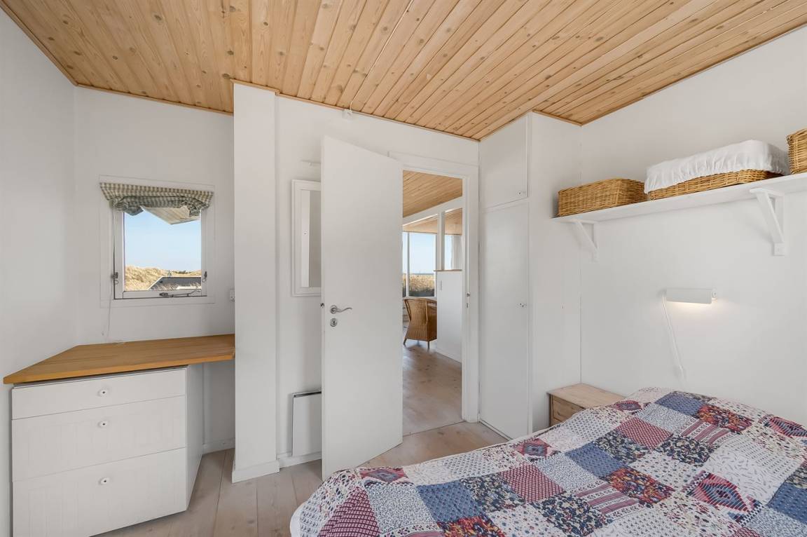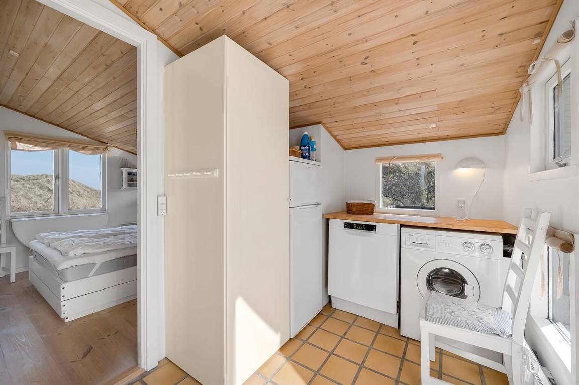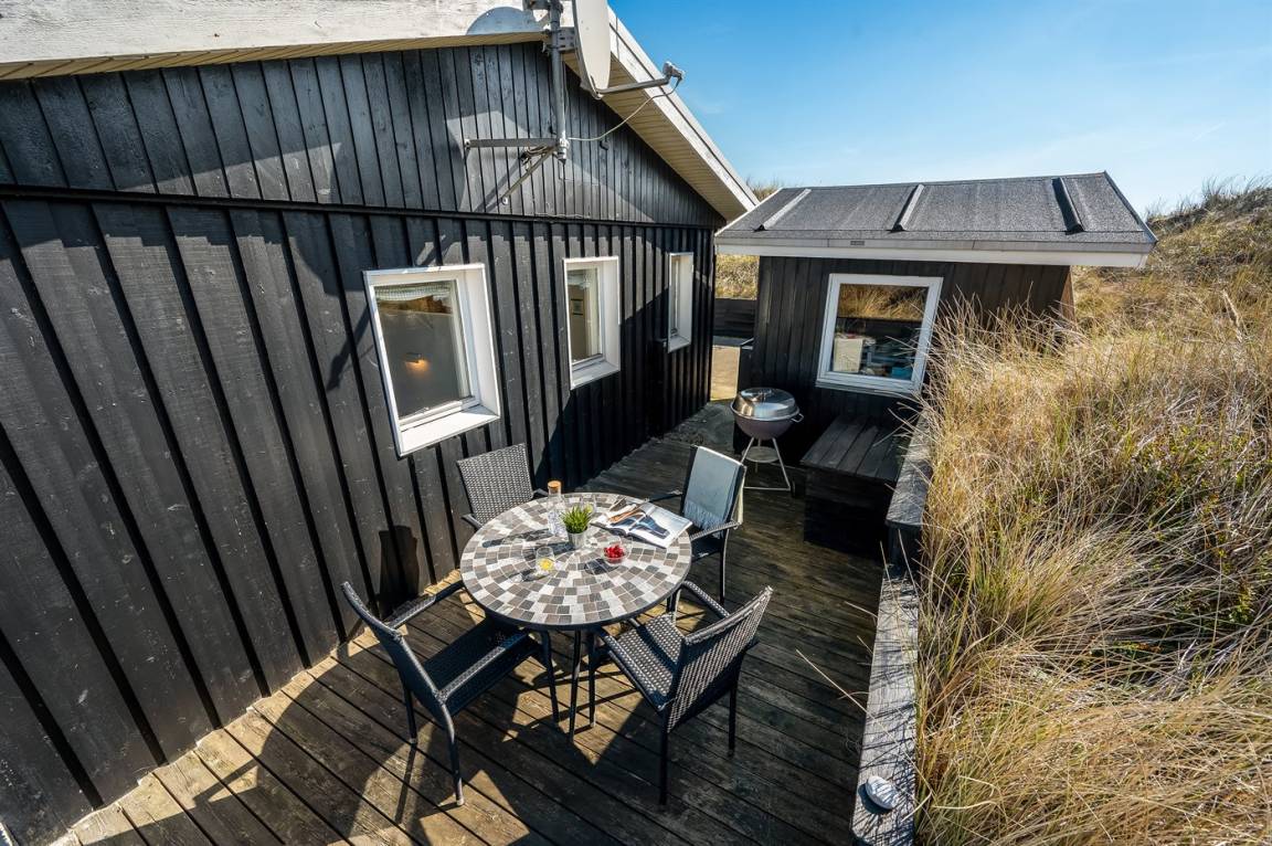 DraußenDie Ferienunterkunft liegt auf einem 2500 m² großen Dünengrundstück. Die Entfernung zum Meer beträgt 800 m. Die Entfernung zum Fjord beträgt 200 m. Die nächste Einkaufsmöglichkeit liegt 1960 m entfernt. Es steht ein 45 m² Terrassenareal zur Verfügung. Geräteraum. Parkplatz auf dem Grundstück.