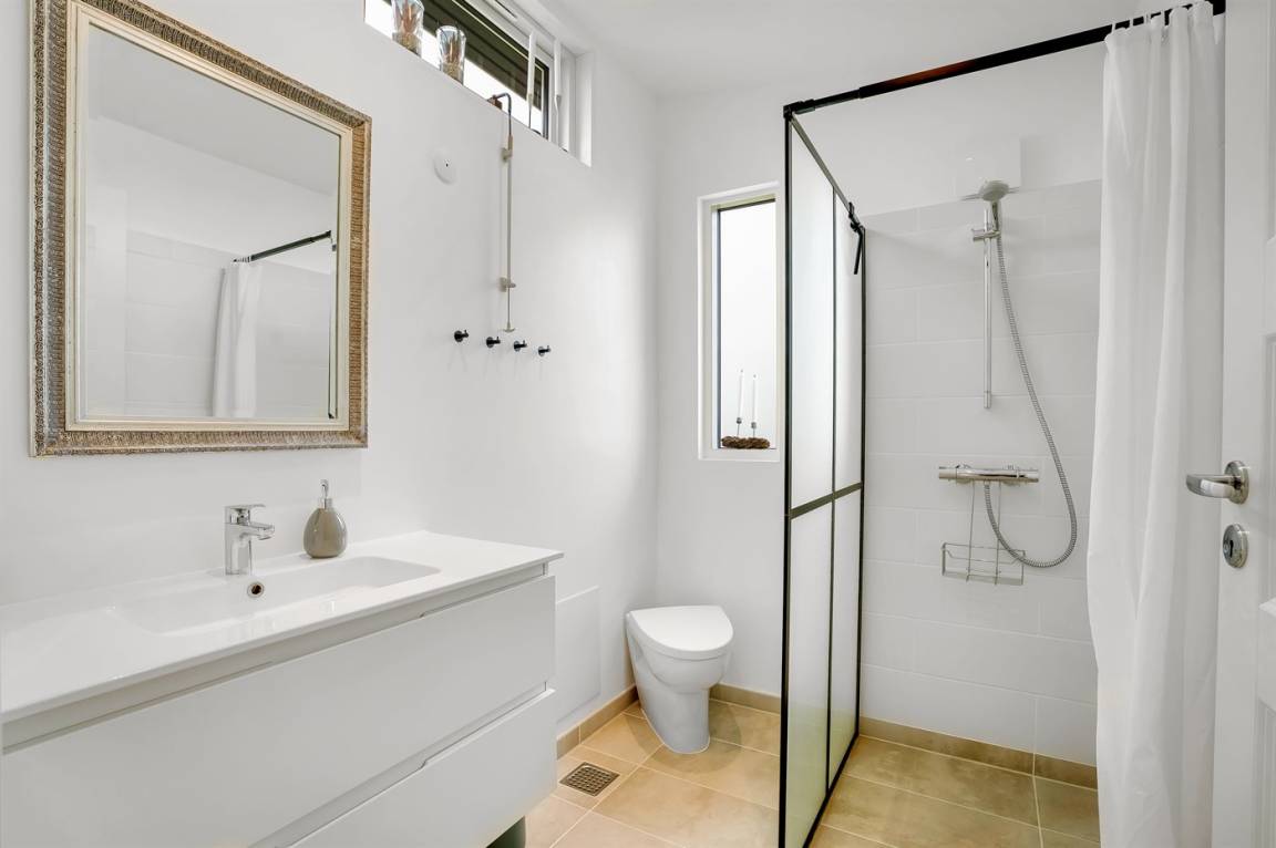 Die Küche ist mit Kühlschrank inklusive Gefrierschrank, 4 Induktionskochfelder, Umluftofen, Mikrowelle und Geschirrspüler ausgestattet. Es gibt ein Badezimmer mit Duschnische und Toilette sowie ein Gästetoilette. Fußbodenheizung in beiden Räumen.