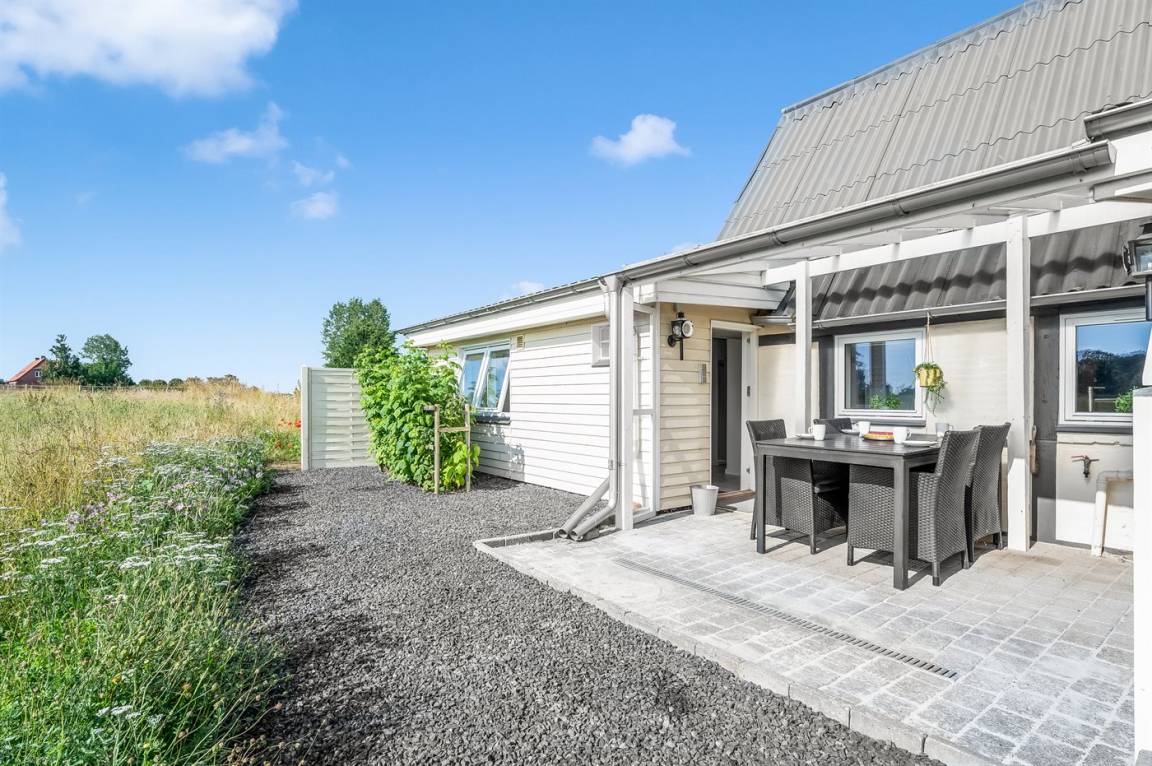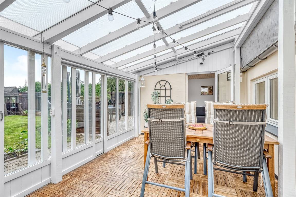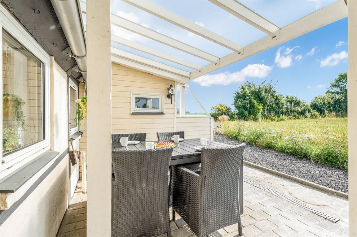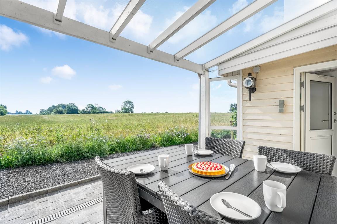 Vom Wohnzimmer aus hast du Zugang zum Wintergarten und weiter zur Terrasse mit Gartenmöbeln und Liegestühlen – hier kannst du entspannen, ein gutes Buch lesen oder eine Mahlzeit auf dem Kugelgrill zubereiten. Von der kleinen Terrasse auf der Rückseite des Hauses aus hast du Blick auf die Felder.