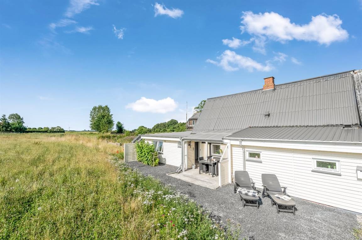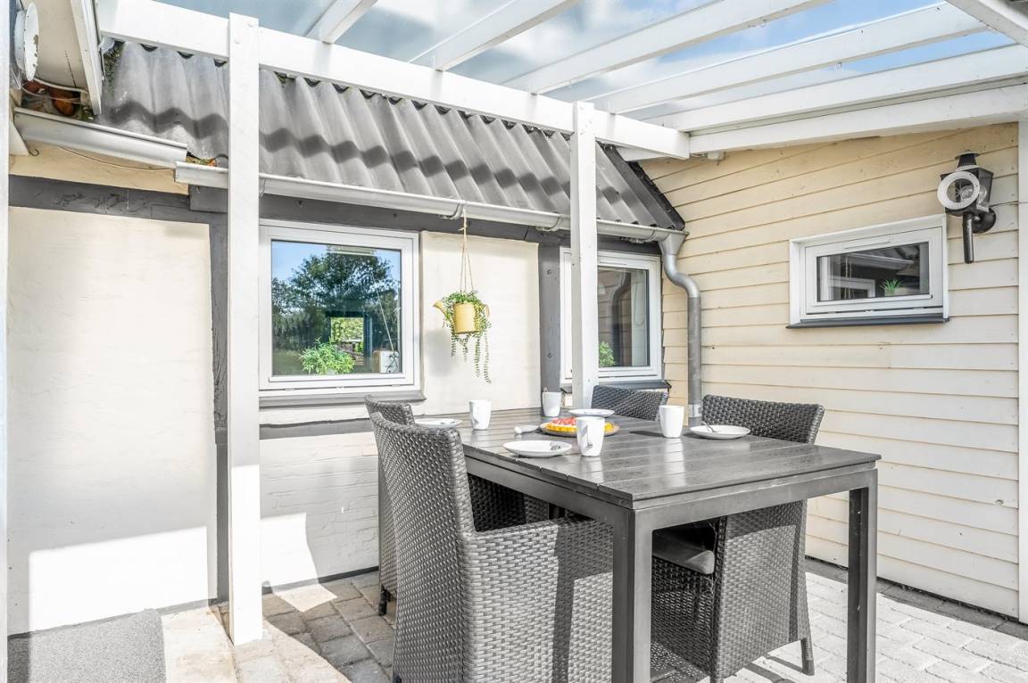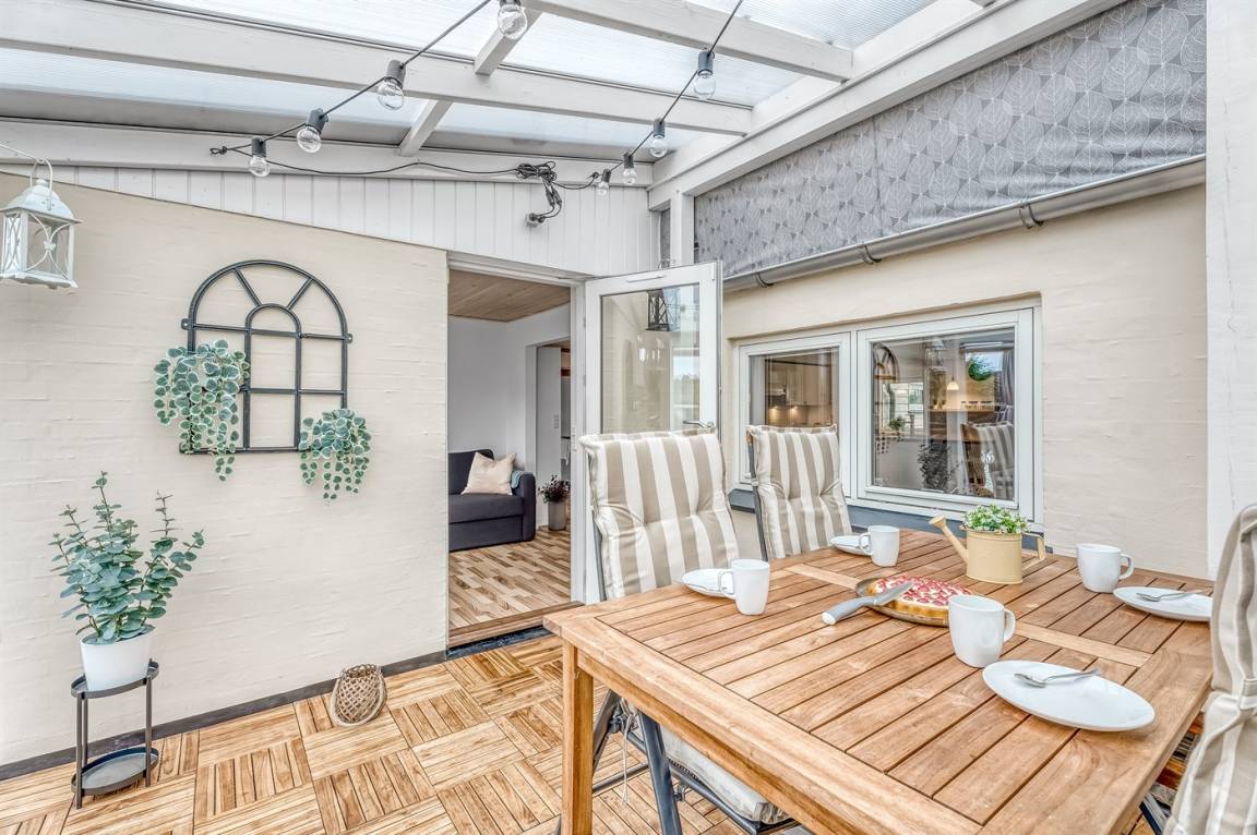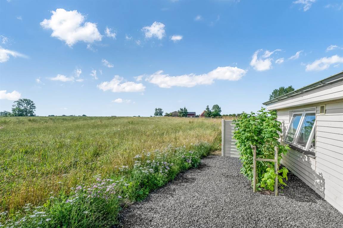 Vom Wohnzimmer aus hast du Zugang zum Wintergarten und weiter zur Terrasse mit Gartenmöbeln und Liegestühlen – hier kannst du entspannen, ein gutes Buch lesen oder eine Mahlzeit auf dem Kugelgrill zubereiten. Von der kleinen Terrasse auf der Rückseite des Hauses aus hast du Blick auf die Felder.