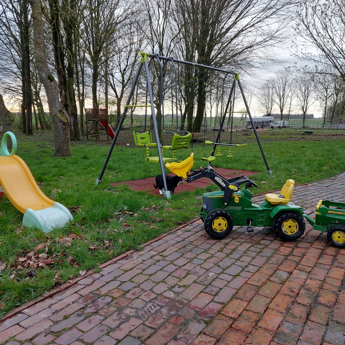 Im Außenbereich gibt es einen großen Garten, ganz viele Tiere: Schafe, Ziegen, Ponys, Esel, Hühner, Kaninchen und Katzen, einen Spielbereich mit Rutsche, Schaukel und Trampolin und eine Terrasse, die zum gemütlichen und angenehmen Ausklingen des Tages einlädt.