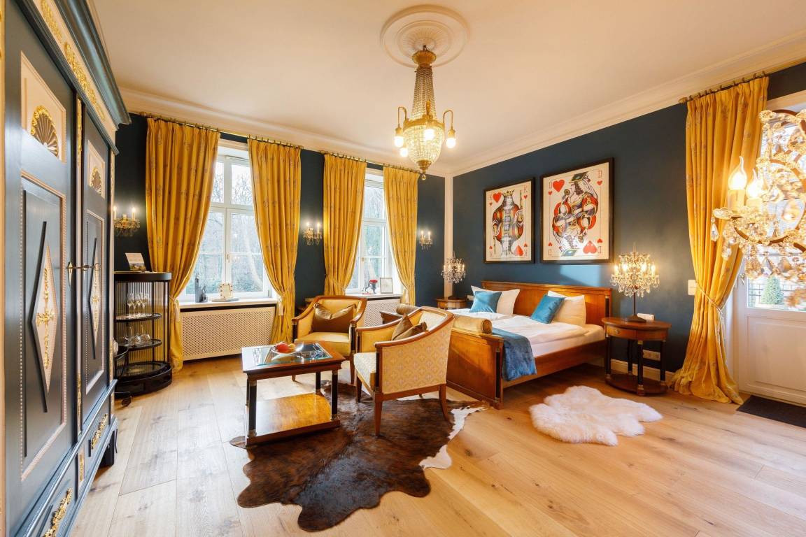 Die frisch renovierte, großzügige Master-Suite mit Doppelbett und historischen Interieur ist sehr stil- und geschmackvoll, passend zur Villa-Ottilienruh, ausgestattet. Die Räume sind lichtdurchflutet und laden zum Verweilen ein. Das Vollbad ist insbesondere mit einem Doppelwaschbecken und Badewanne mit Whirlpool-Funktion sowie eigenem Austritt zu einer weiteren Dachterrasse ausgestattet, von wo Sie einen wunderschönen Blick über den Naturteich in den historischen Park haben. Das Kaminzimmer im Erdgeschoss mit seiner angrenzenden Terrasse und Hausbar lädt am Abend zu Treffs in gemütlicher Atmosphäre und zum Ausklang des Tages ein. Ihre Unterkunft befindet sich in idyllischer Lage und ist doch sehr zentrumsnah. Das individuelle Frühstück können unsere Gäste im Wintergarten oder wer es mag, ganz persönlich in der Küchen-Veranda einnehmen. Die Begleitung Ihrer Haustiere bedarf einer konkreten Anfrage.
