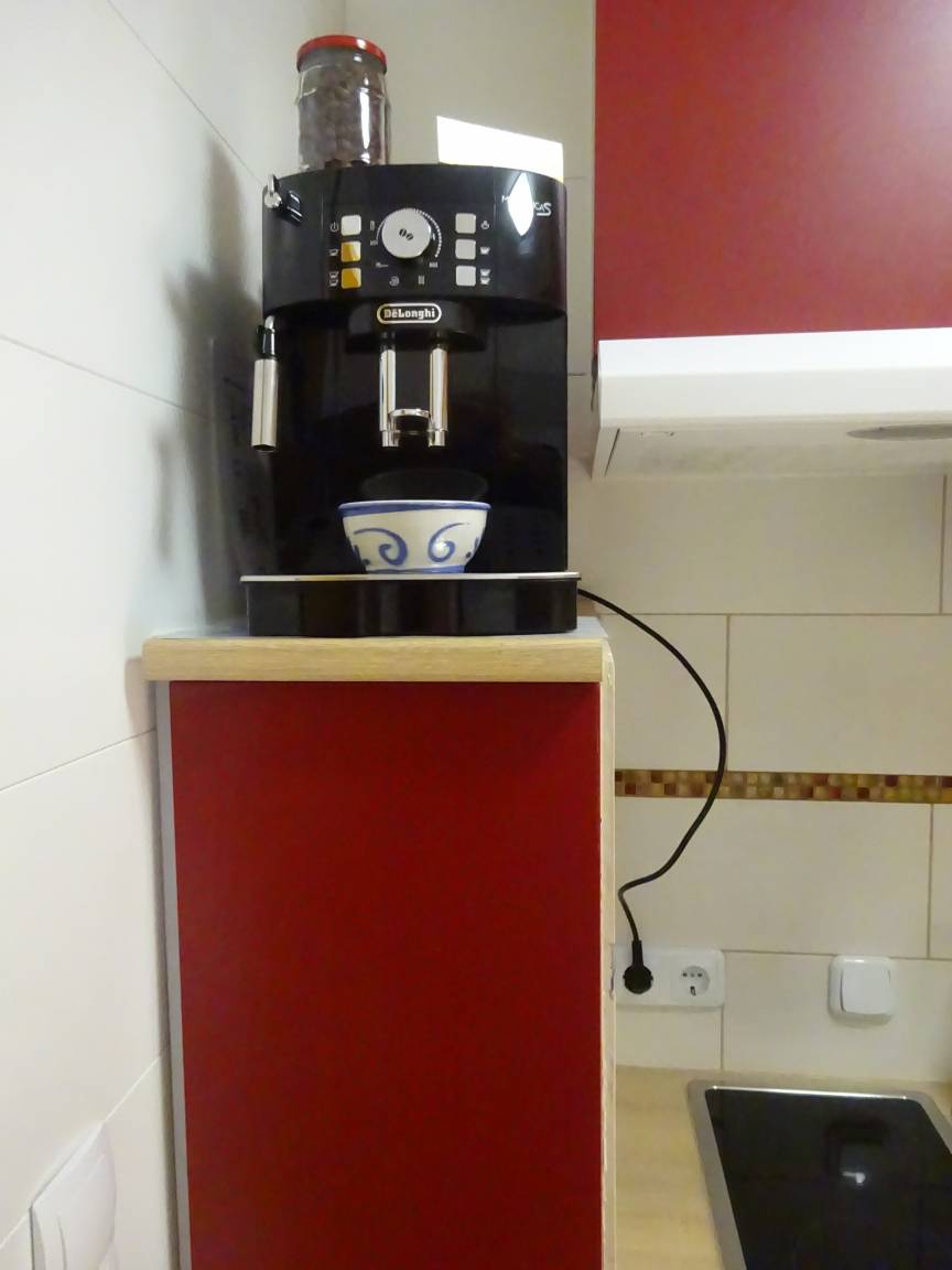 Großer Esstisch, eine sehr gut ausgestattete Küchenzeile.
