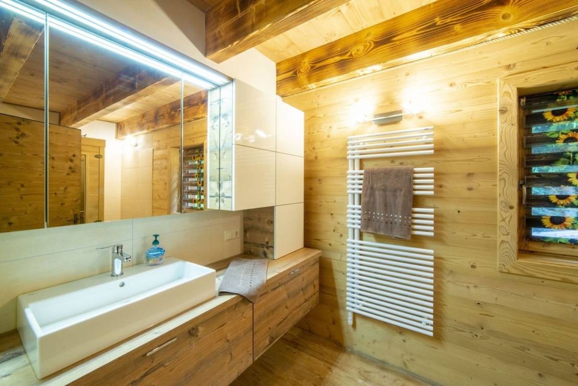 Nach einem Tag in den Bergen lädt die Infrarotkabine im Badezimmer zum Entspannen ein. Der Kachelofen in der Wohnküche sorgt an kühleren Abenden für wohlige Wärme und romantische Hüttenatmosphäre.