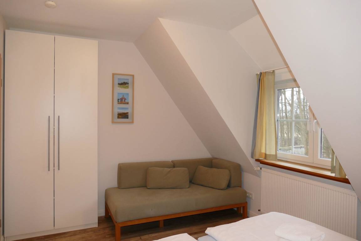 Im Obergeschoss liegen 2 geräumige Schlafzimmer, ein Schlafraum mit einem Doppelbett und ein Schlafraum mit 2 getrennten Betten. Durch einen Schlafraum gelangt man in den geräumigen Spitzboden mit 2 getrennten Betten.
