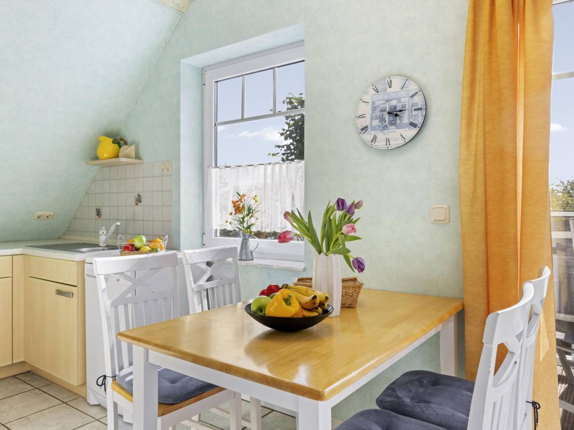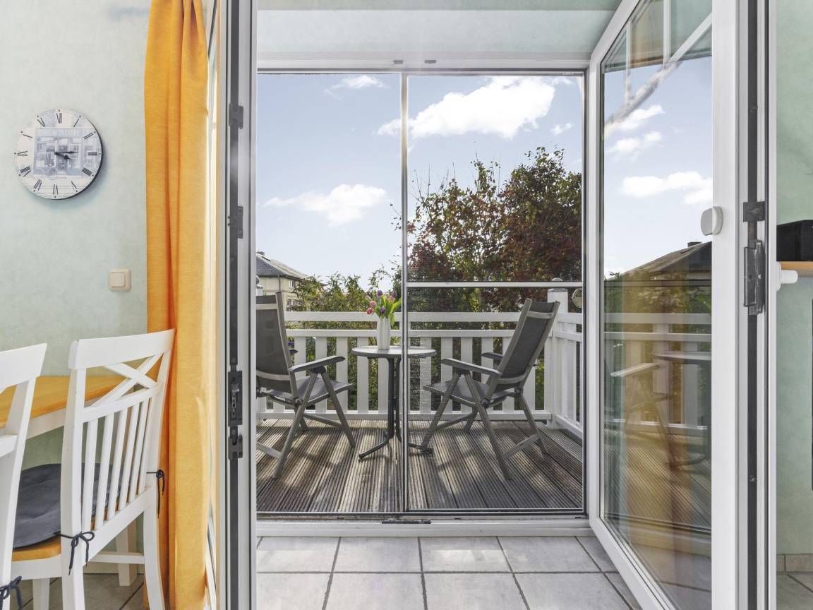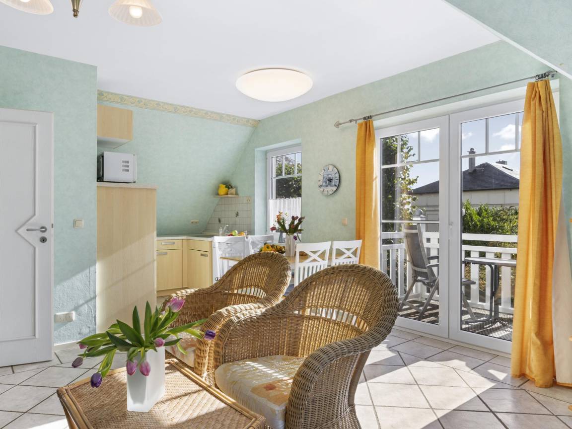 Hausbeschreibung : Die Ferienwohnung "Windjammer" für 4 Gäste und einem Baby bis 2 Jahre befindet sich im 1. Obergeschoss eines Ferienhauses mit 4 Ferienwohnungen. Ein weiteres Schlafzimmer mit zwei Einzelbetten ist über eine steile Treppe zum 2. Obergeschoss erreichbar. Wohnbereich mit großzügigen Fensterflächen, Balkon in Südlage mit 2 Sitzgelegenheiten. Die Wohnung ist durch die Südlage besonders hell und sonnig mit Blick in den hübschen Garten und bietet einen eingeschränkten, seitlichen Blick auf die Ostsee