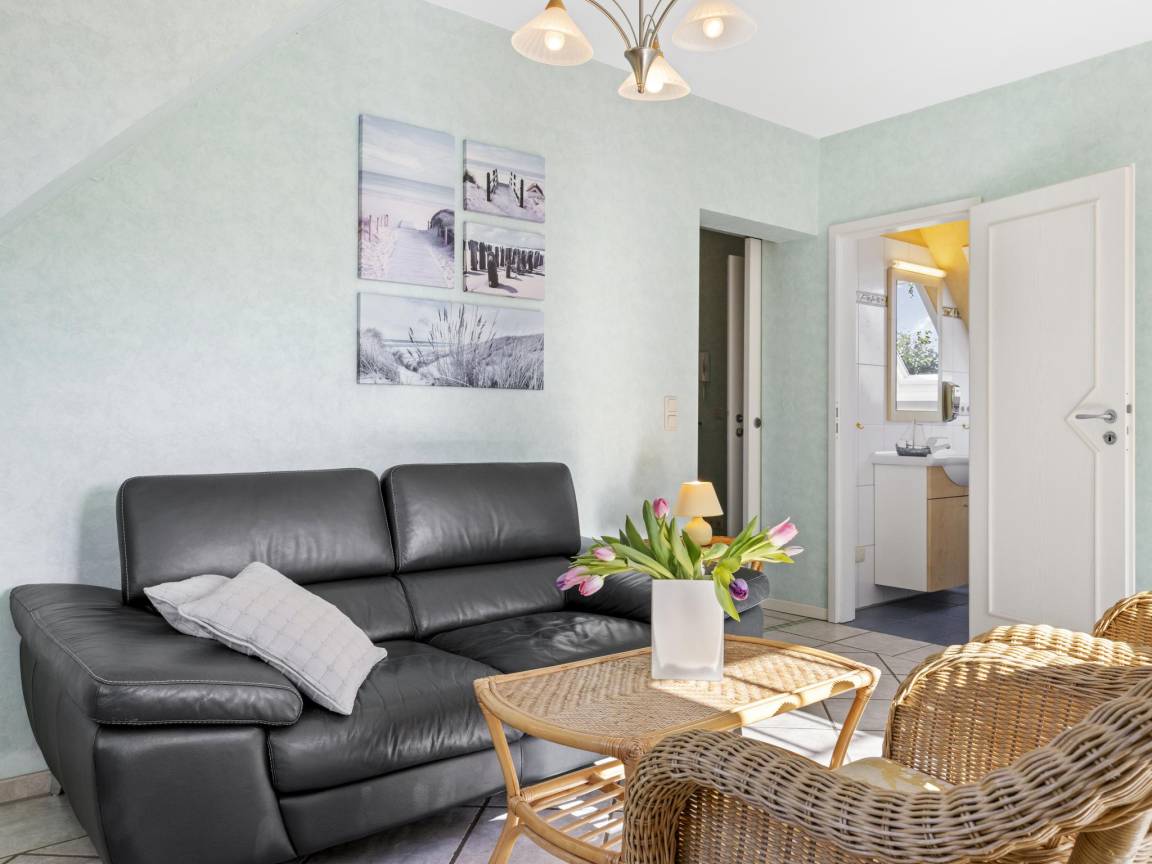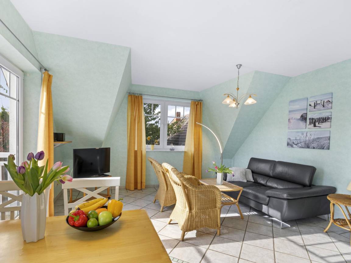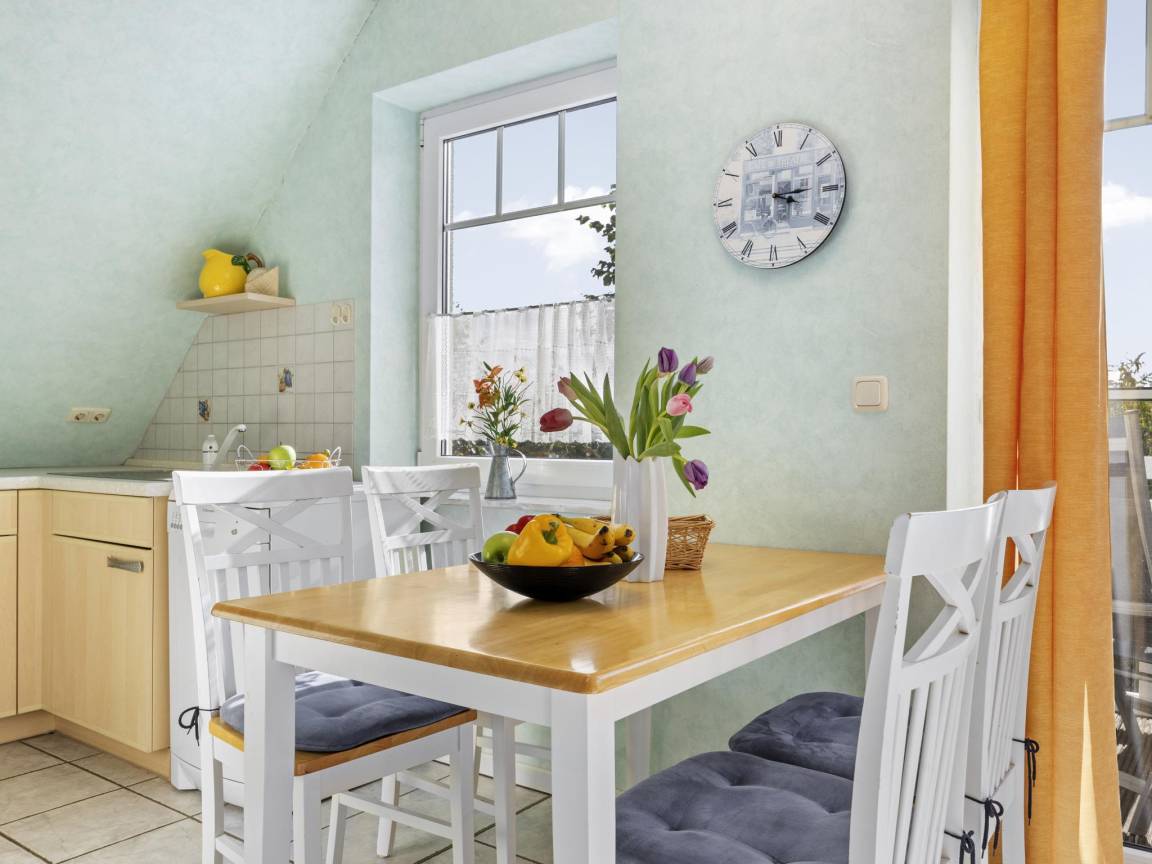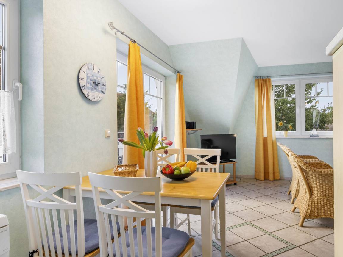 Hausbeschreibung : Die Ferienwohnung "Windjammer" für 4 Gäste und einem Baby bis 2 Jahre befindet sich im 1. Obergeschoss eines Ferienhauses mit 4 Ferienwohnungen. Ein weiteres Schlafzimmer mit zwei Einzelbetten ist über eine steile Treppe zum 2. Obergeschoss erreichbar. Wohnbereich mit großzügigen Fensterflächen, Balkon in Südlage mit 2 Sitzgelegenheiten. Die Wohnung ist durch die Südlage besonders hell und sonnig mit Blick in den hübschen Garten und bietet einen eingeschränkten, seitlichen Blick auf die Ostsee