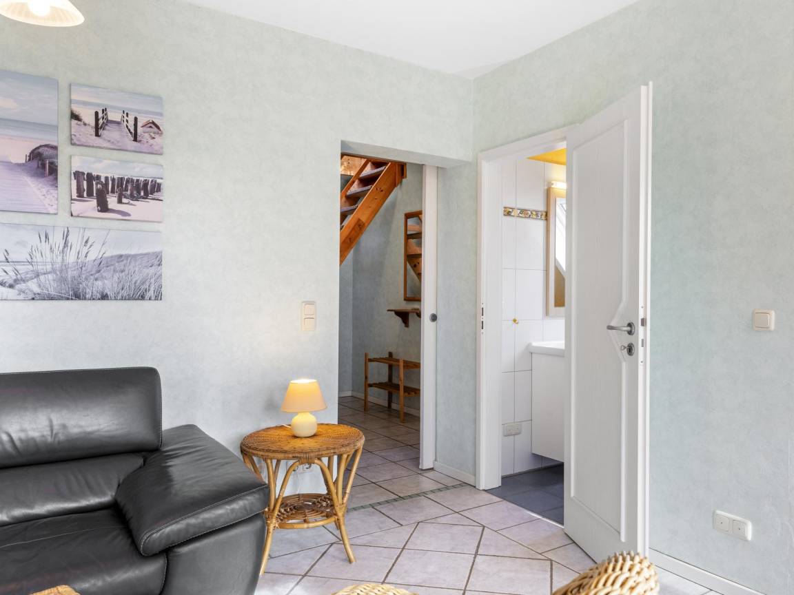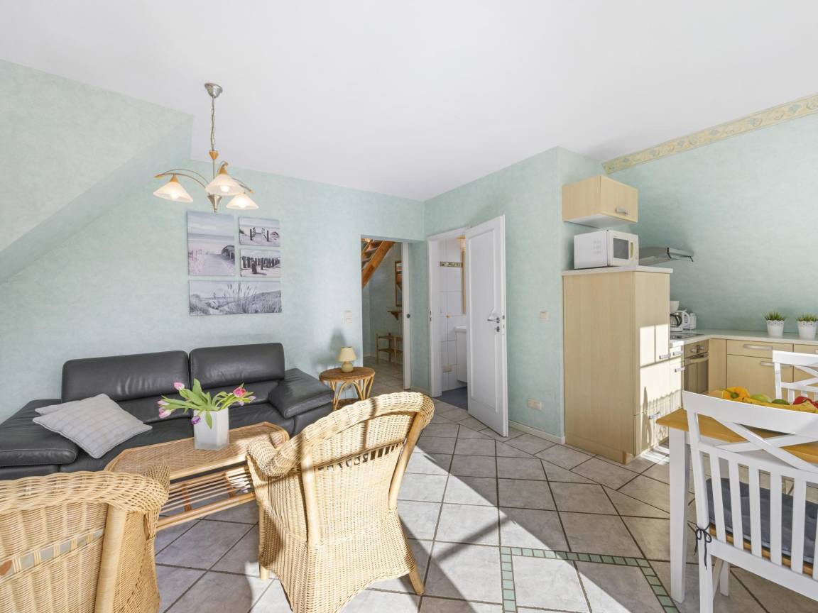 Layout : In der 1. Etage: offene Küche mit Wasserkocher, Toaster, Kochherd(Ceranfeld), Dunstabzugshaube, Kaffeemaschine(Filter), Backofen, Mikrowelle, Geschirrspüler, Kühl-/Gefrierkombination , Wohn/Esszimmer mit TV(Flatscreen), Esstisch(4 Personen), Sitzecke , Schlafzimmer mit Doppelbett(140 x 200 cm) , Badezimmer mit Waschbecken, Dusche, Toilette